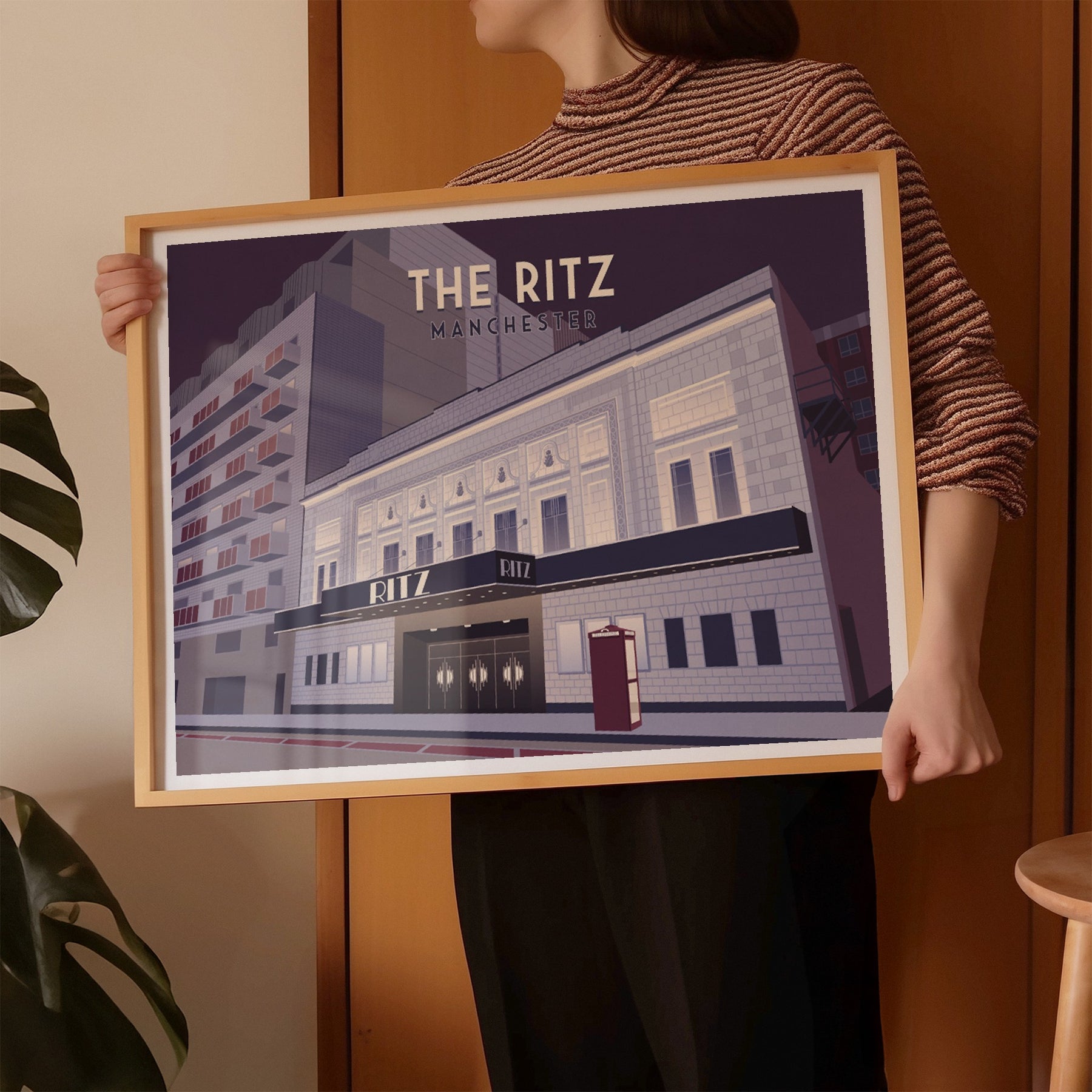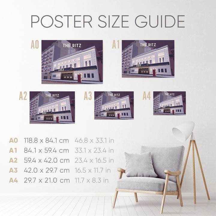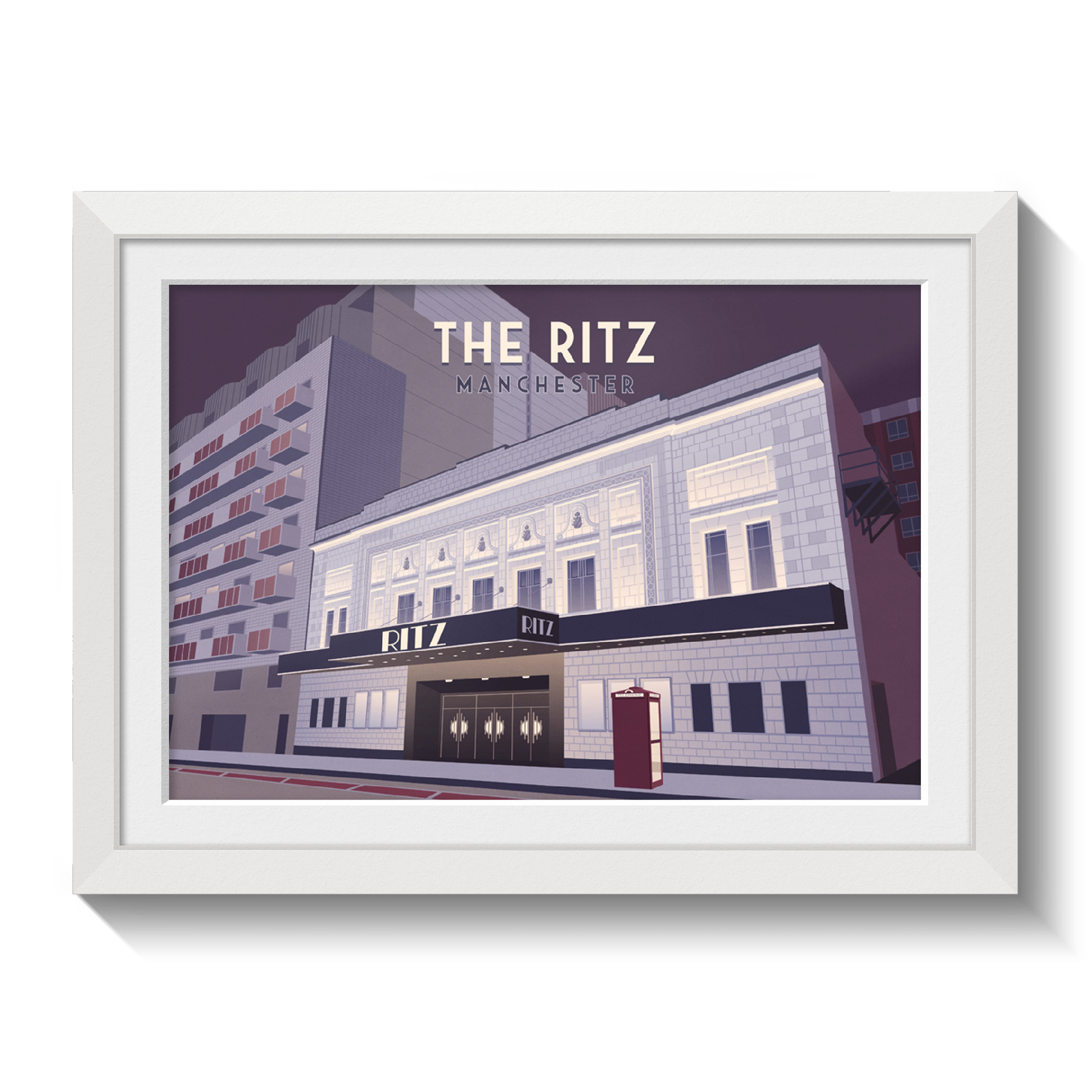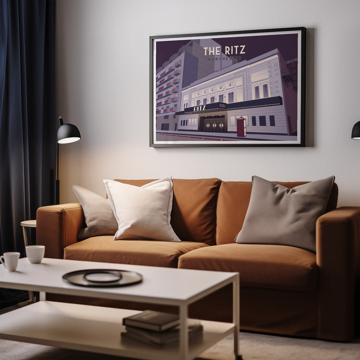 An original travel poster featuring Manchester's iconic Ritz music venue, also known as the o2 Ritz Manchester.
