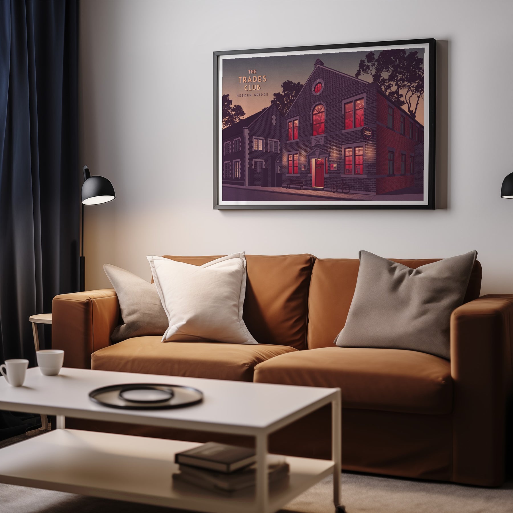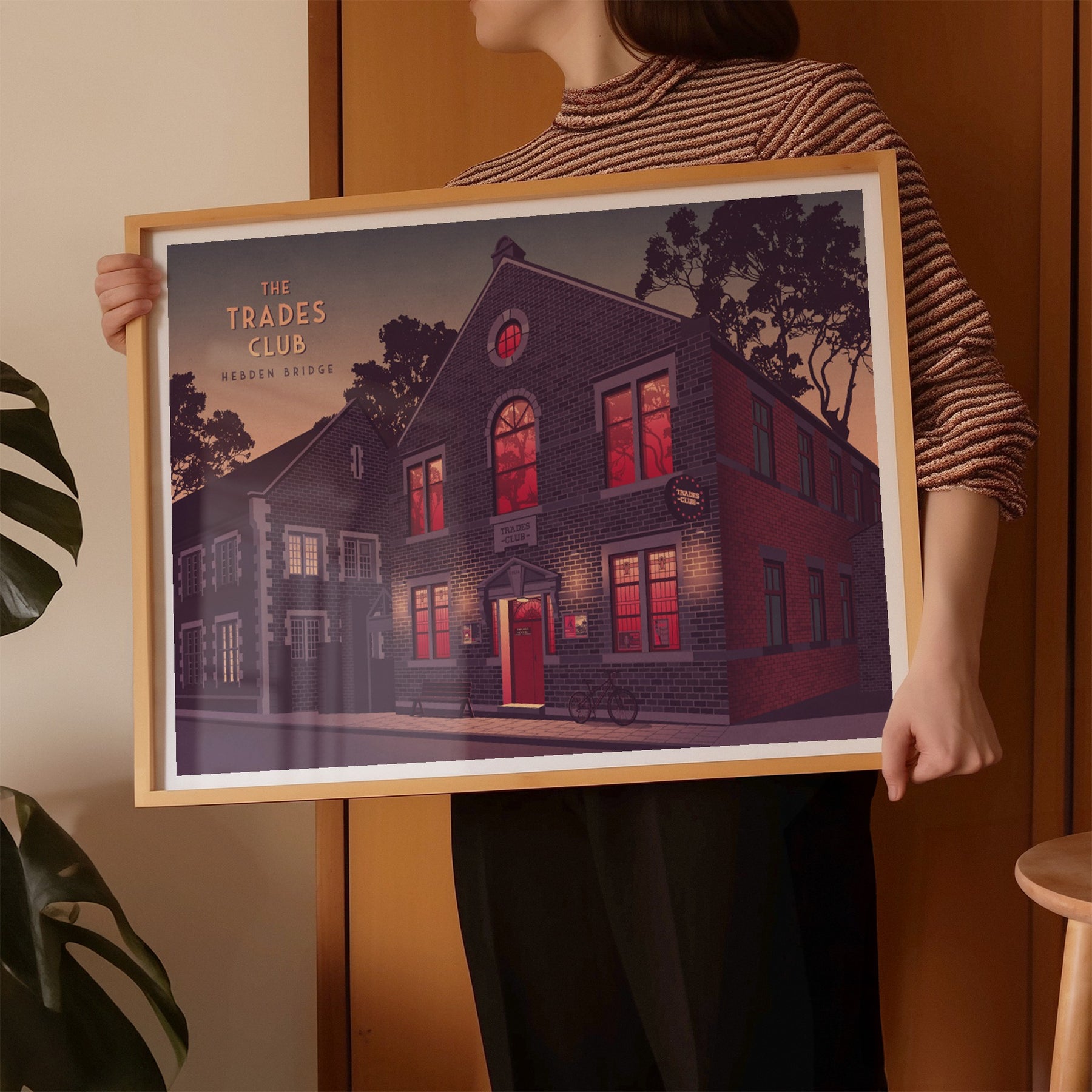 An original travel poster featuring the iconic Trades Club. It is a independent socialist members cooperative, club, bar and music venue in Hebden Bridge, West Yorkshire. Built in 1924 as a joint enterprise by half a dozen local trade unions and brought back to life in 1982.