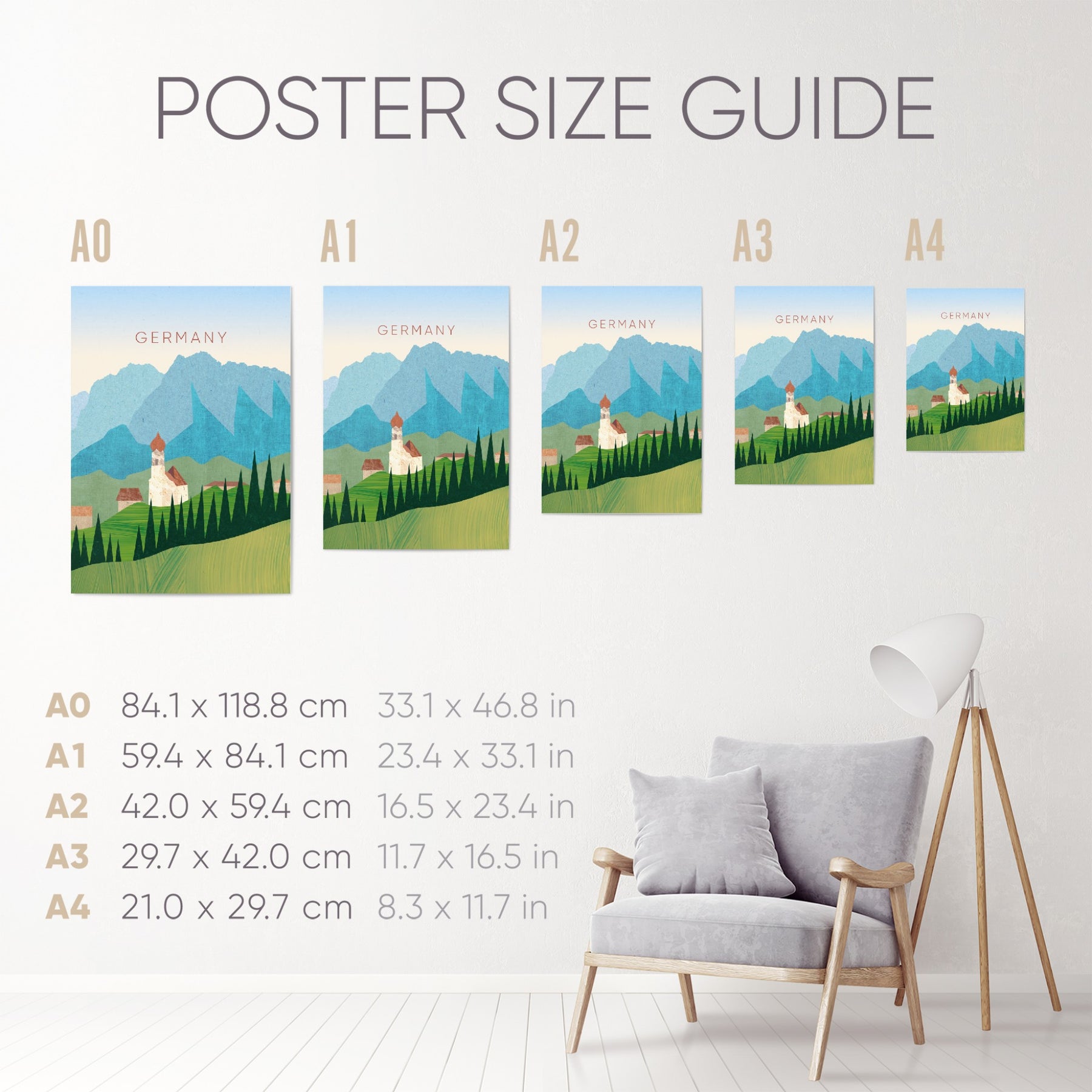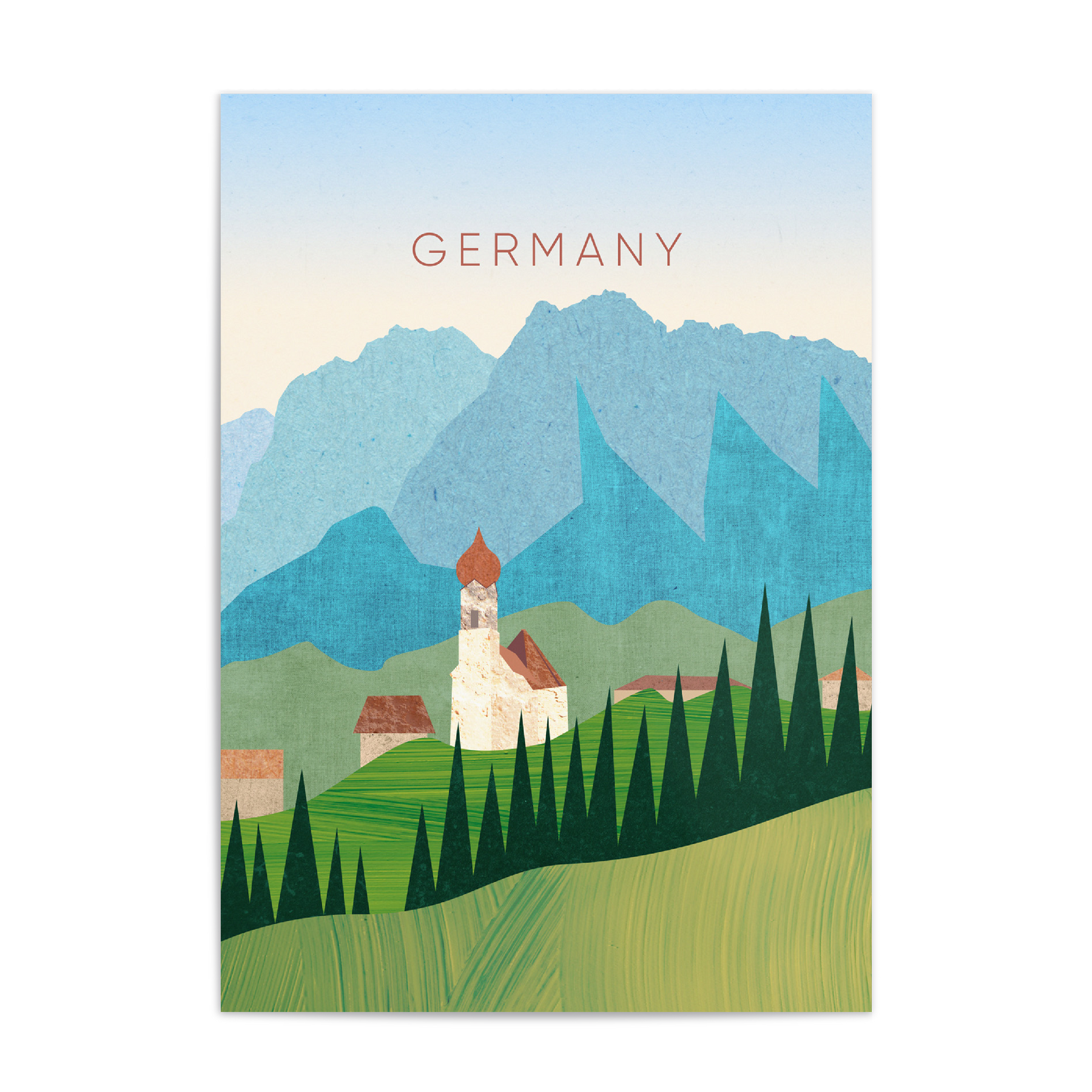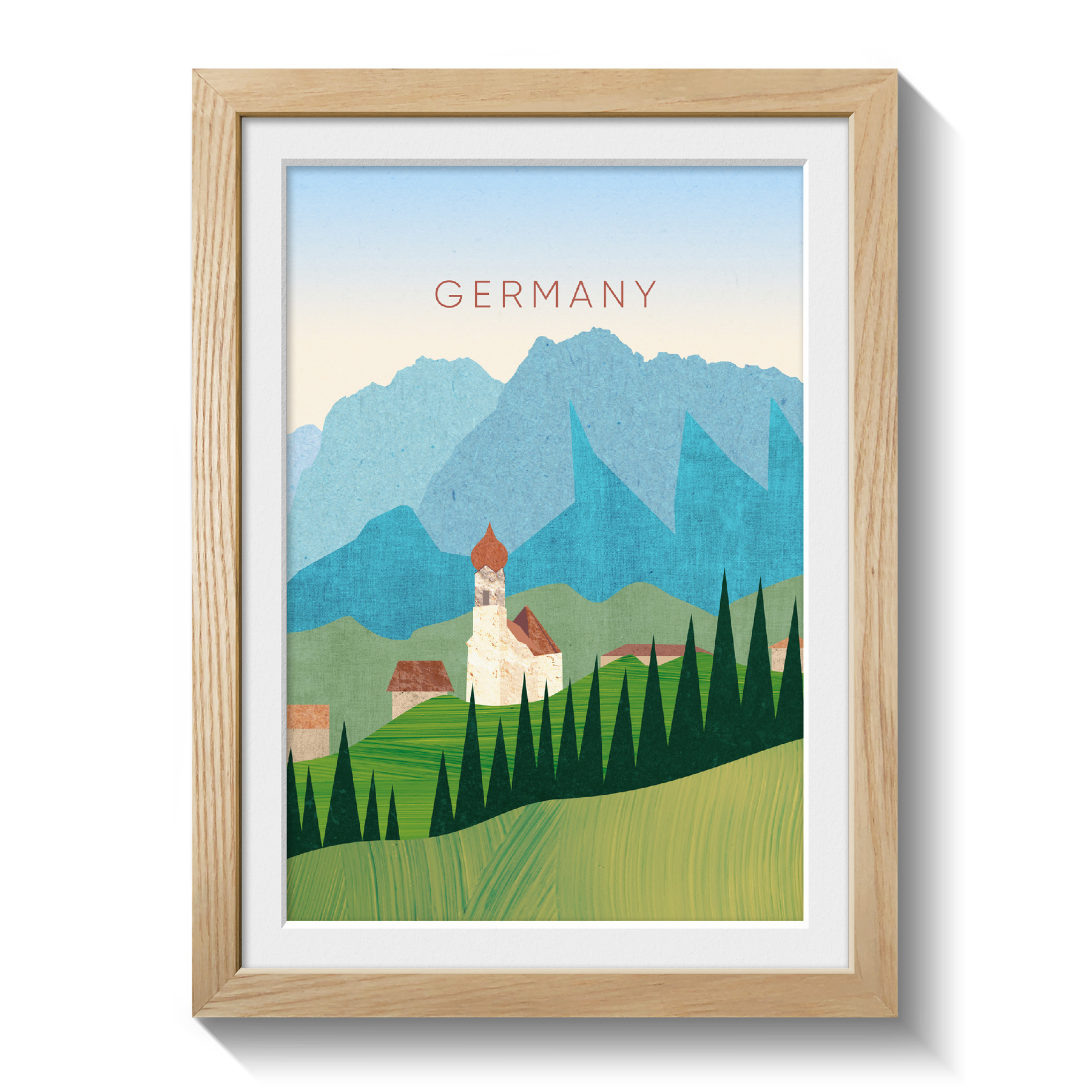 Original travel poster for Germany, a country in Western Europe. Germany borders 9 countries; Denmark, Netherlands, Belgium, Luxembourg, France, Switzerland, Austria, Czech Republic and Poland. It is known for its food, Bavarian forests and having more than 20,000 castles. It is also a huge beer producer and the city of Munich is home to the original Oktoberfest.