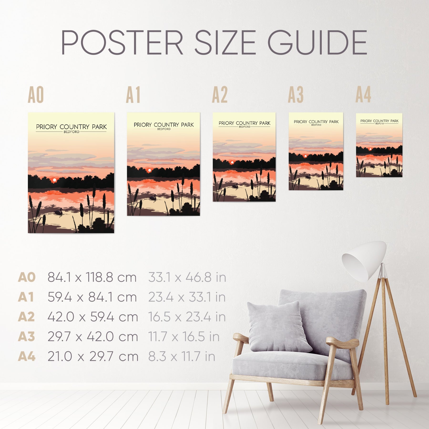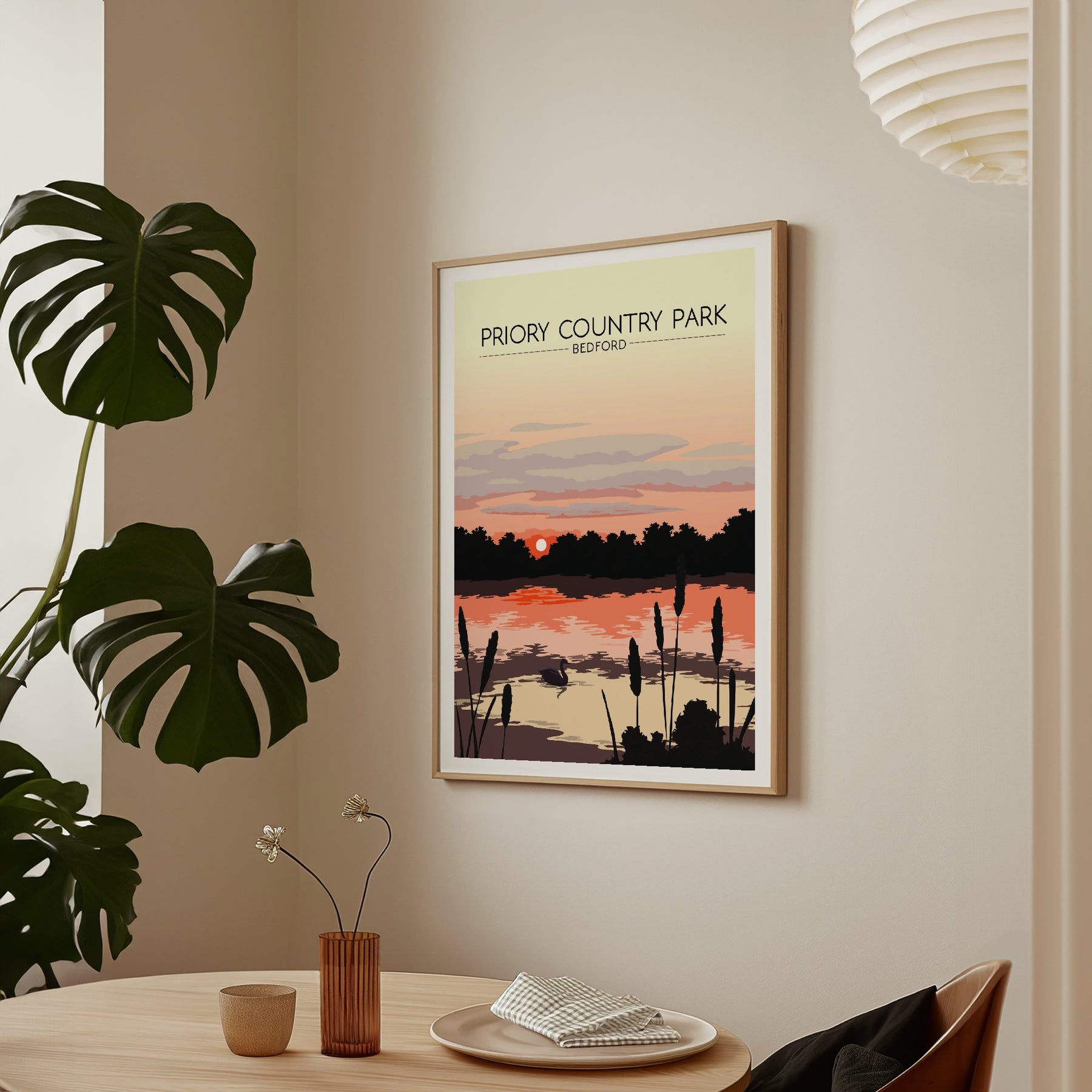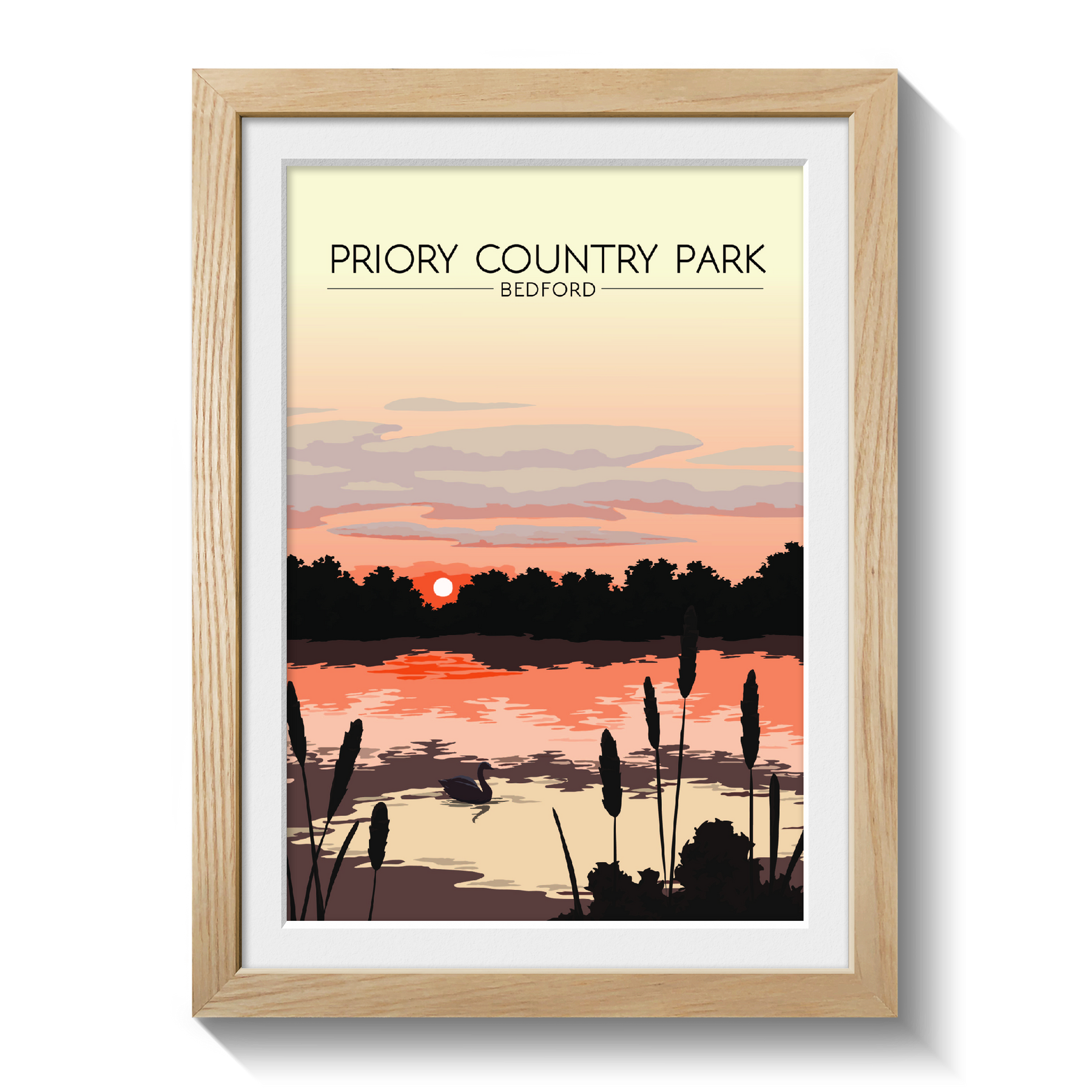 Original travel poster featuring Priory Country Park, Bedford. Priory Country Park is located in the Newnham area of Bedford alongside the River Great Ouse. It's comprised of a mixture of habitats such as lakes, grasslands and woodlands.
