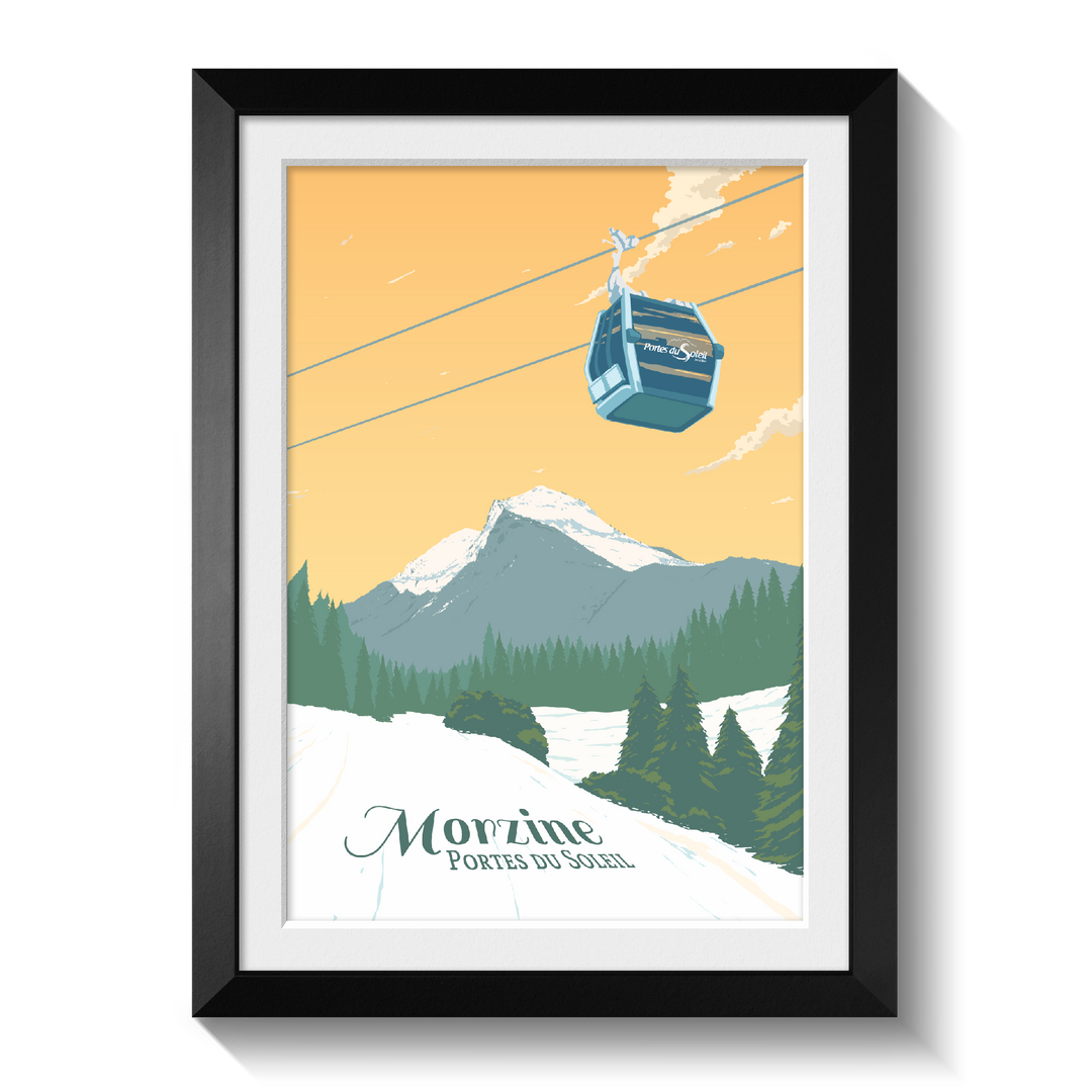 Original travel poster featuring the popular French ski resort of Morzine in the Portes du Soleil area of the French Alps.