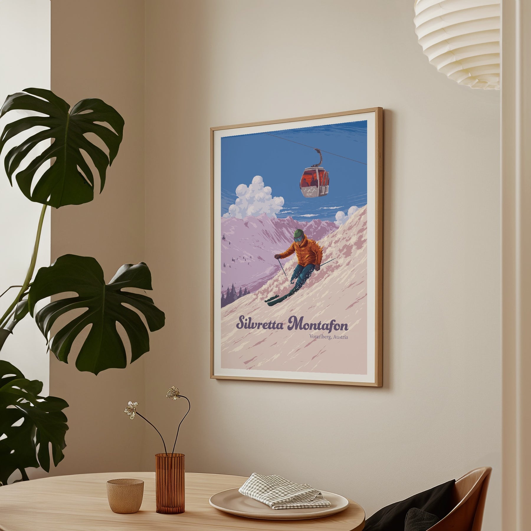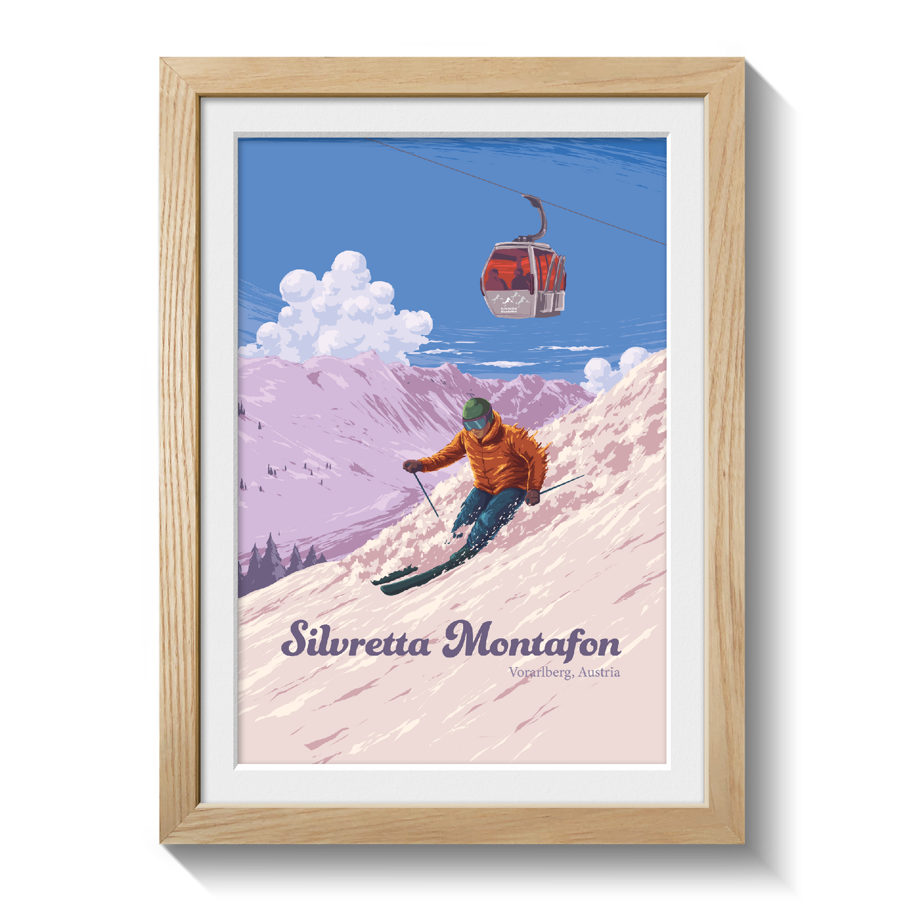 This is an original travel poster featuring the Silvretta Montafon Ski Resort. Silvretta is located in the Montafon Valley and is one of Austria's ten largest ski areas.