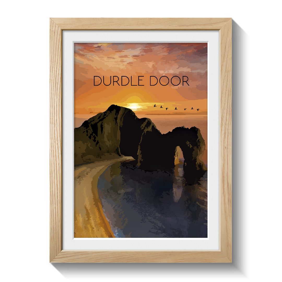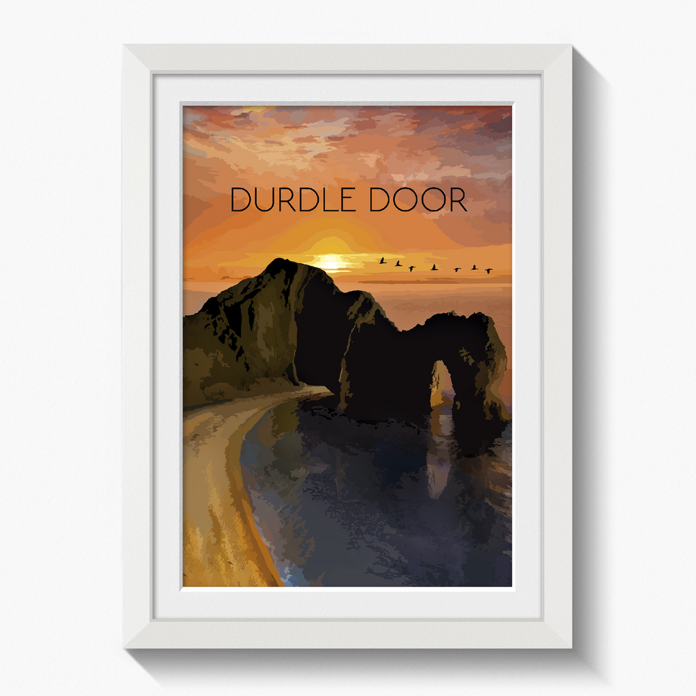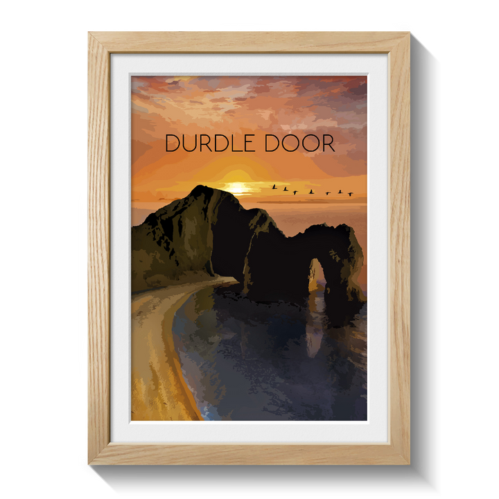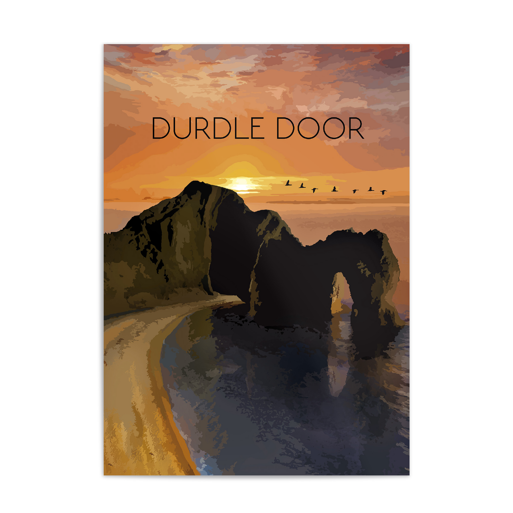 Original print featuring the famous Limestone Arch, Durdle Door on the Dorset Coast at sunset.