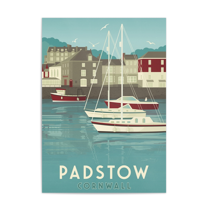 Several sailing boats sit in Padstow harbour while seagulls fly above this pretty British harbour town.
