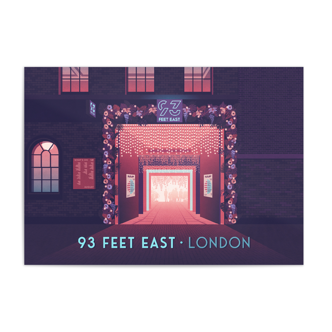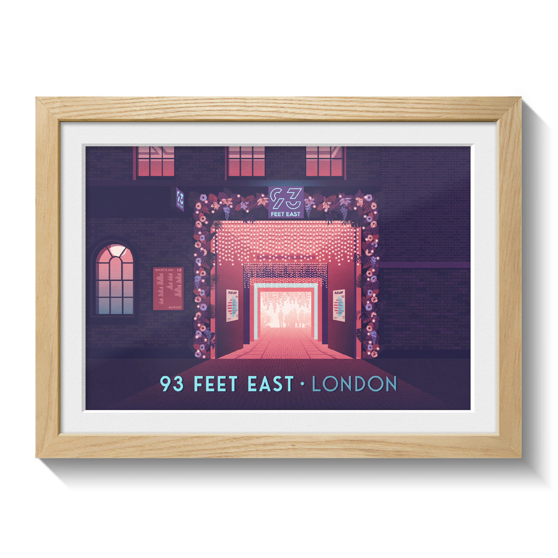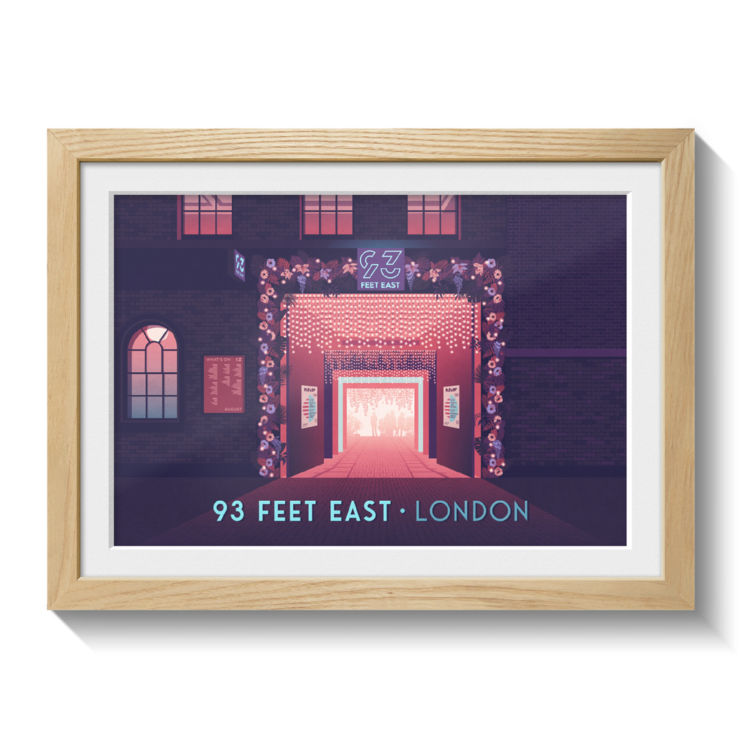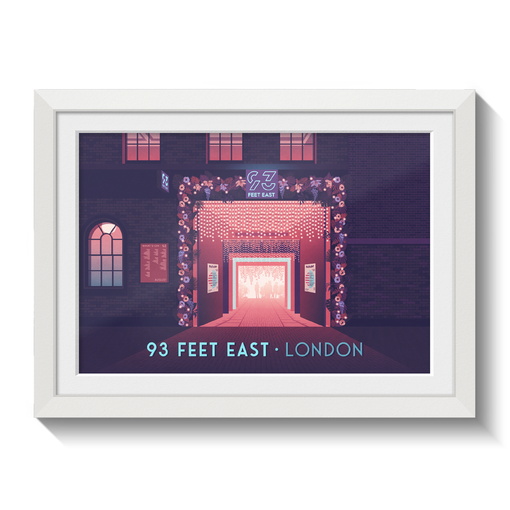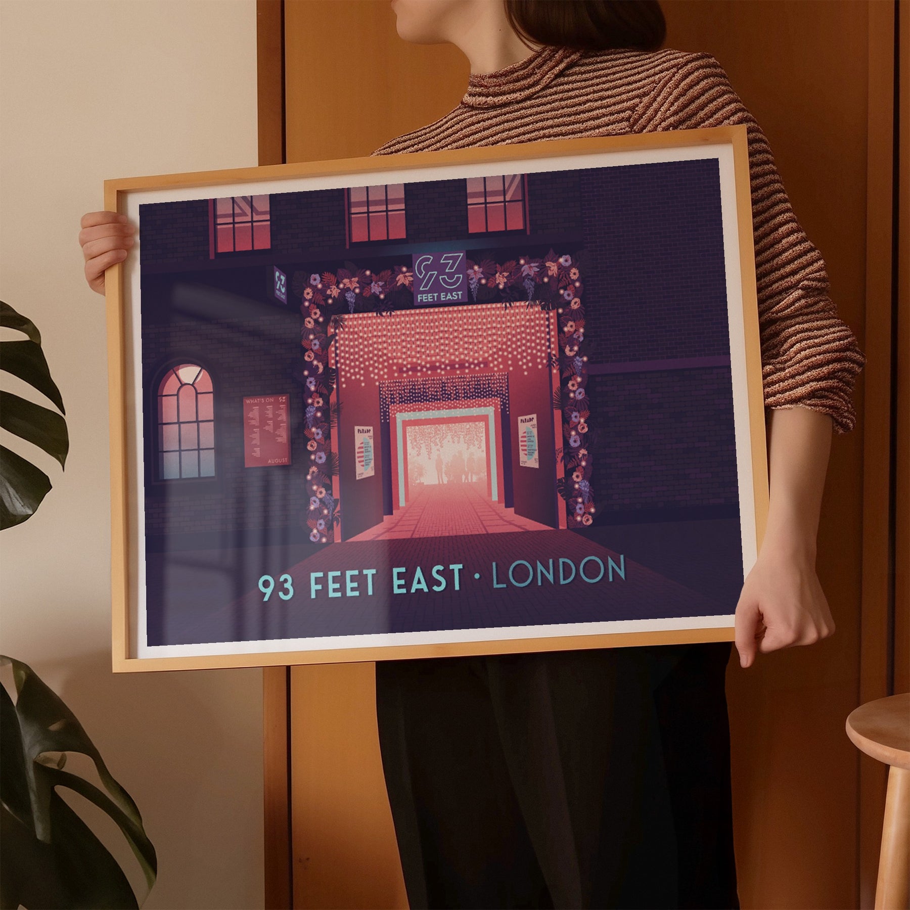 An original travel poster featuring nightclub 93 Feet East, a bar, club and live music venue in the heart of Brick Lane, east London