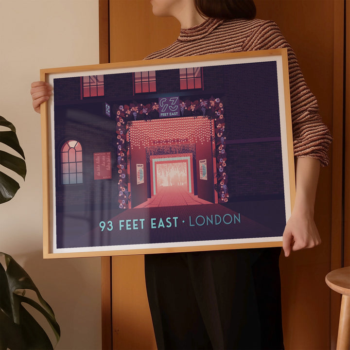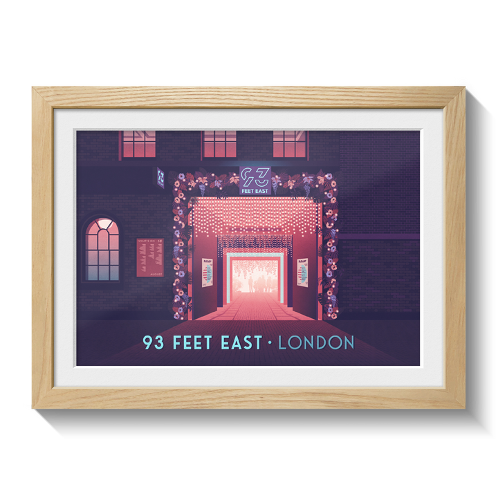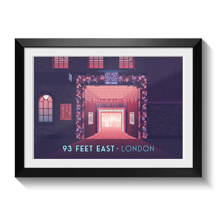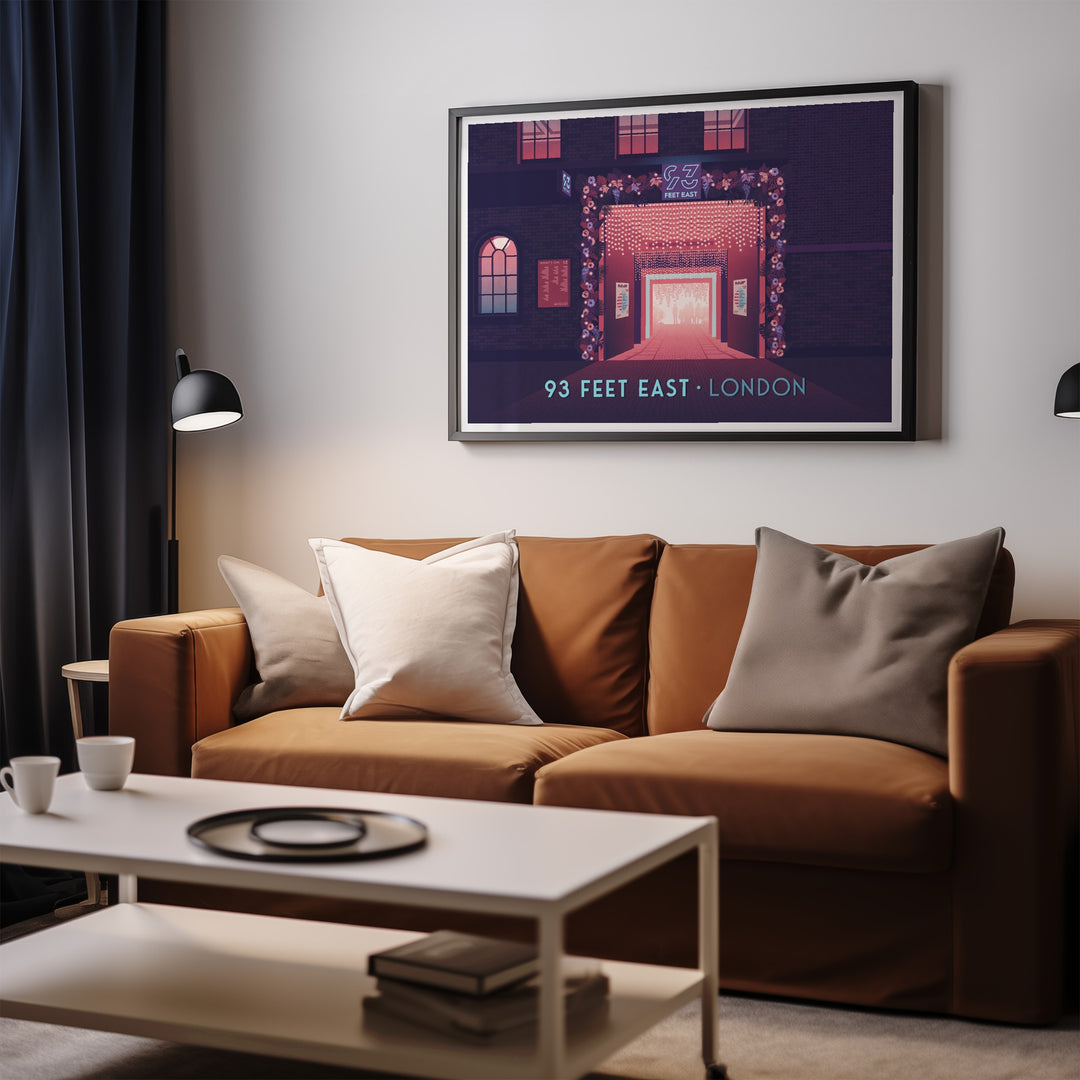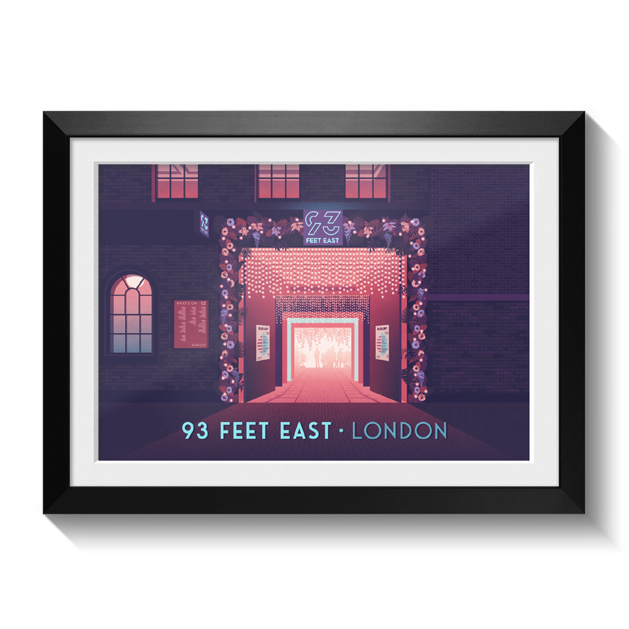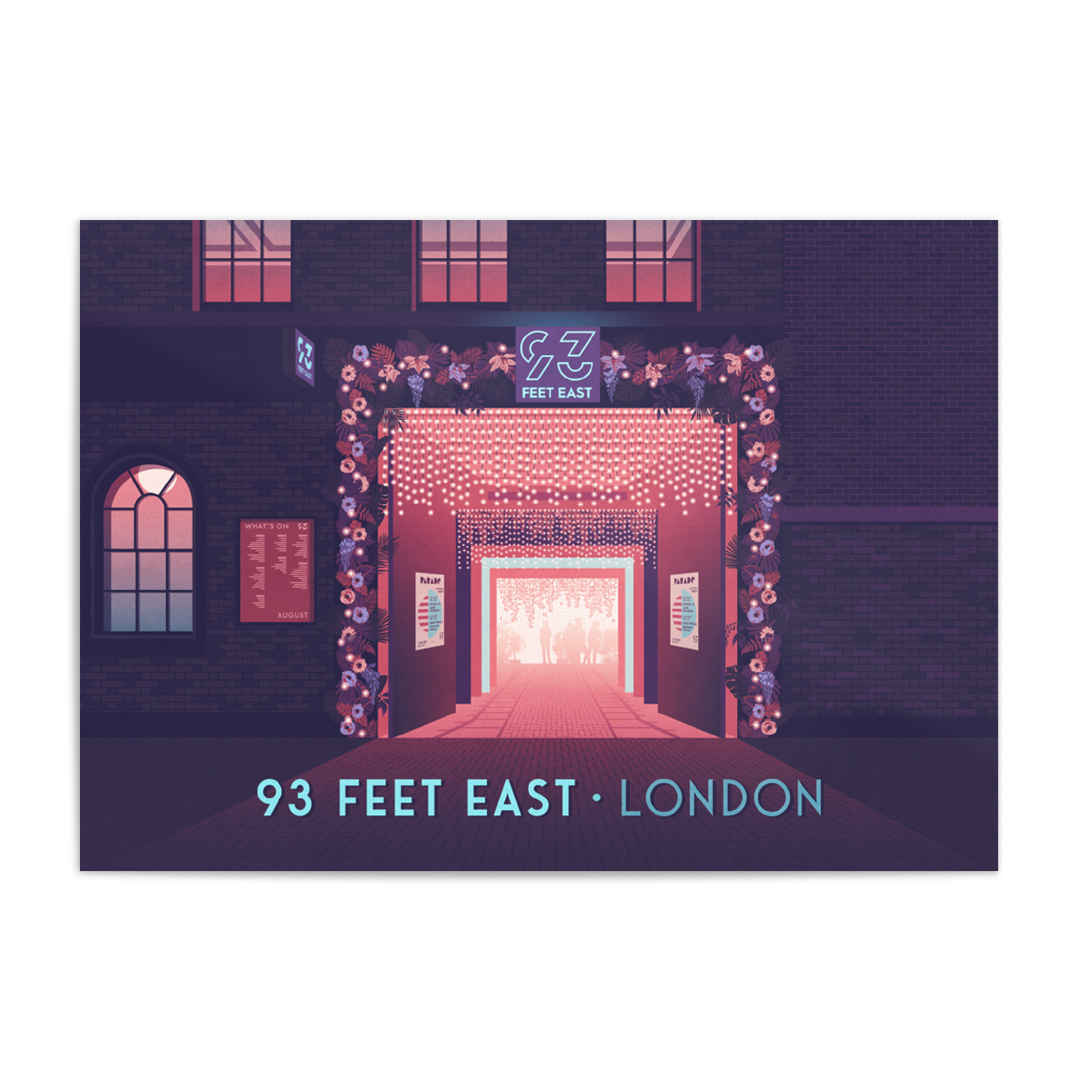 An original travel poster featuring nightclub 93 Feet East, a bar, club and live music venue in the heart of Brick Lane, east London