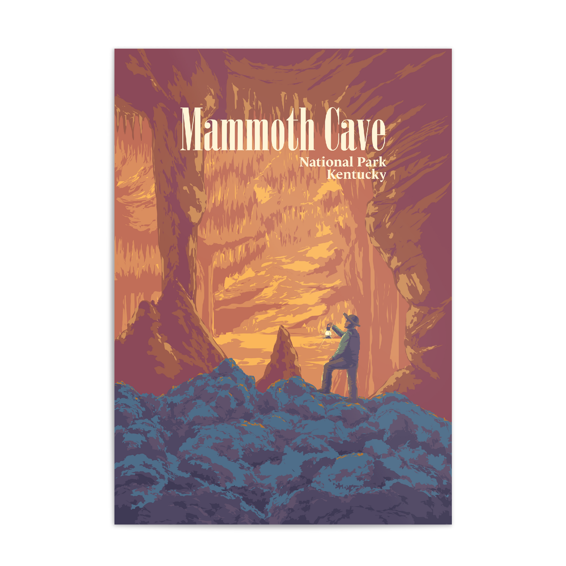 An original travel poster featuring Mammoth Cave National Park in Kentucky USA. This is one of the most appropriately named National Parks, considering it is home to the longest known cave system on earth.