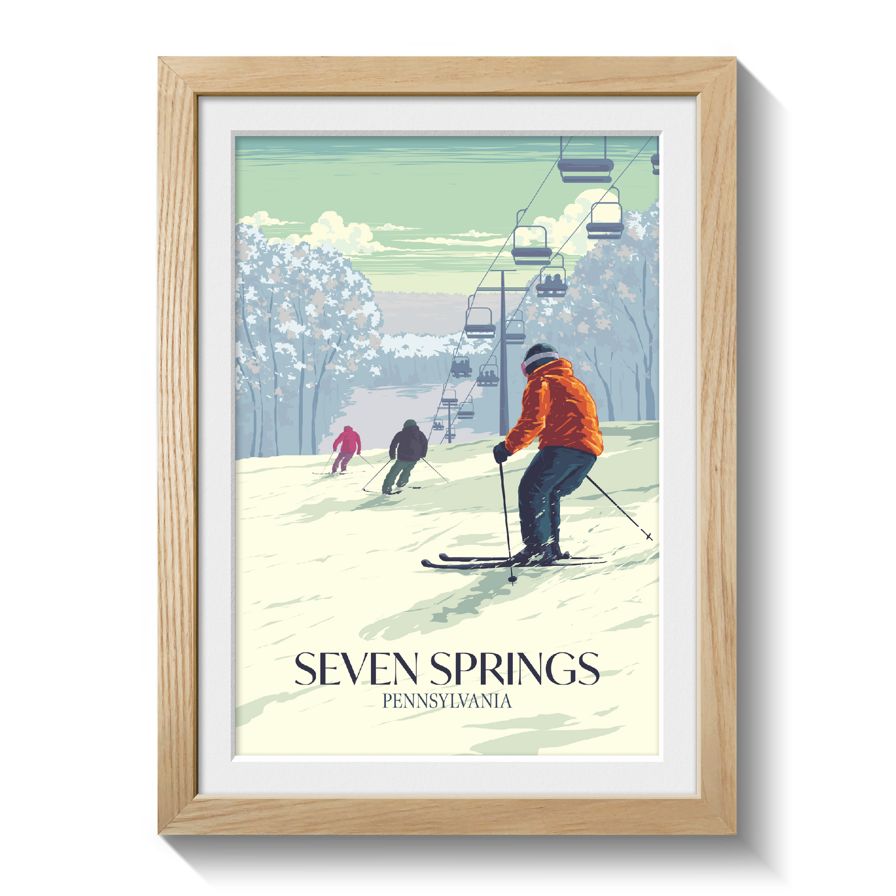 This is an original travel poster featuring Seven Springs Mountain Resort, a ski area located in southwest Pennsylvania that’s home to beautiful trails and terrain parks.