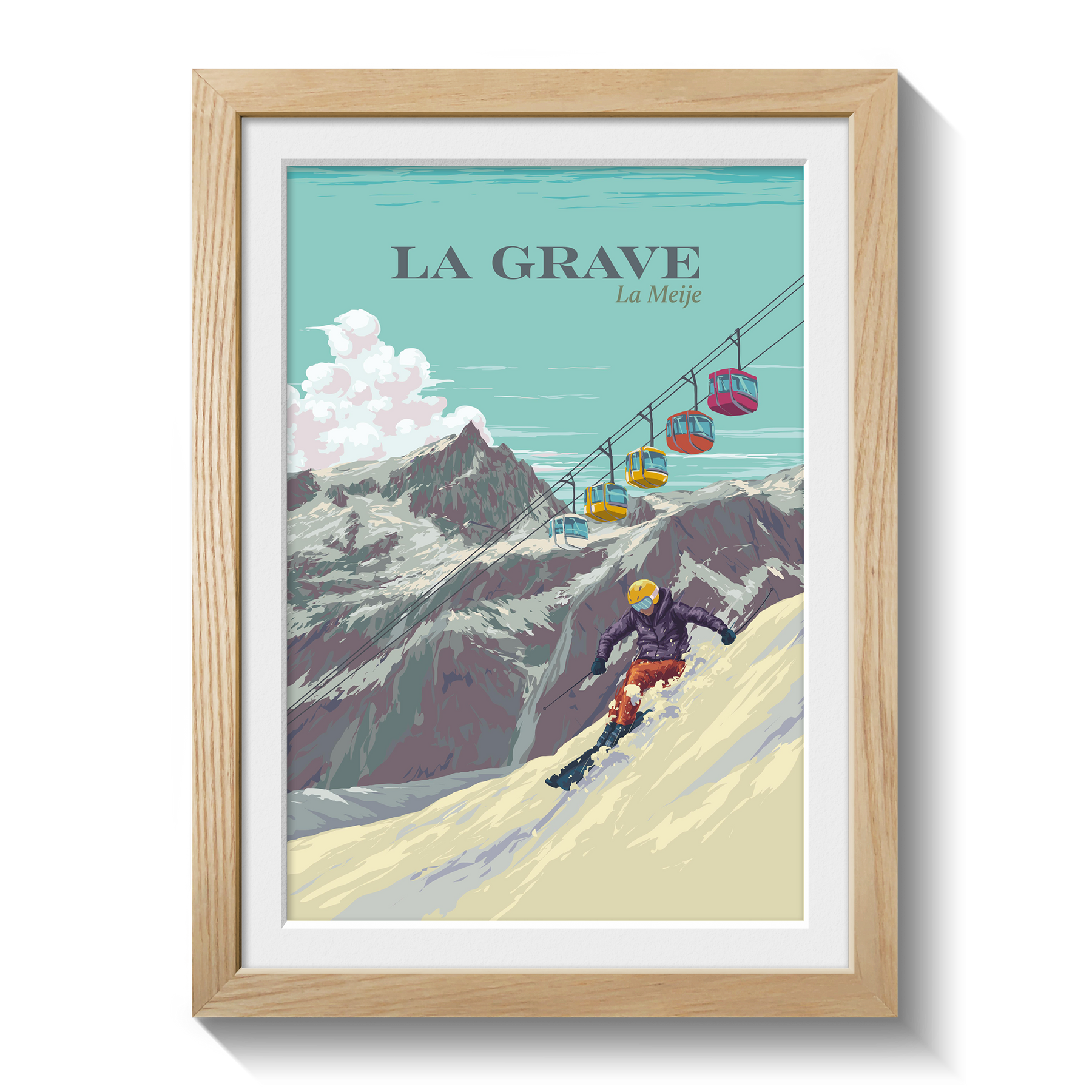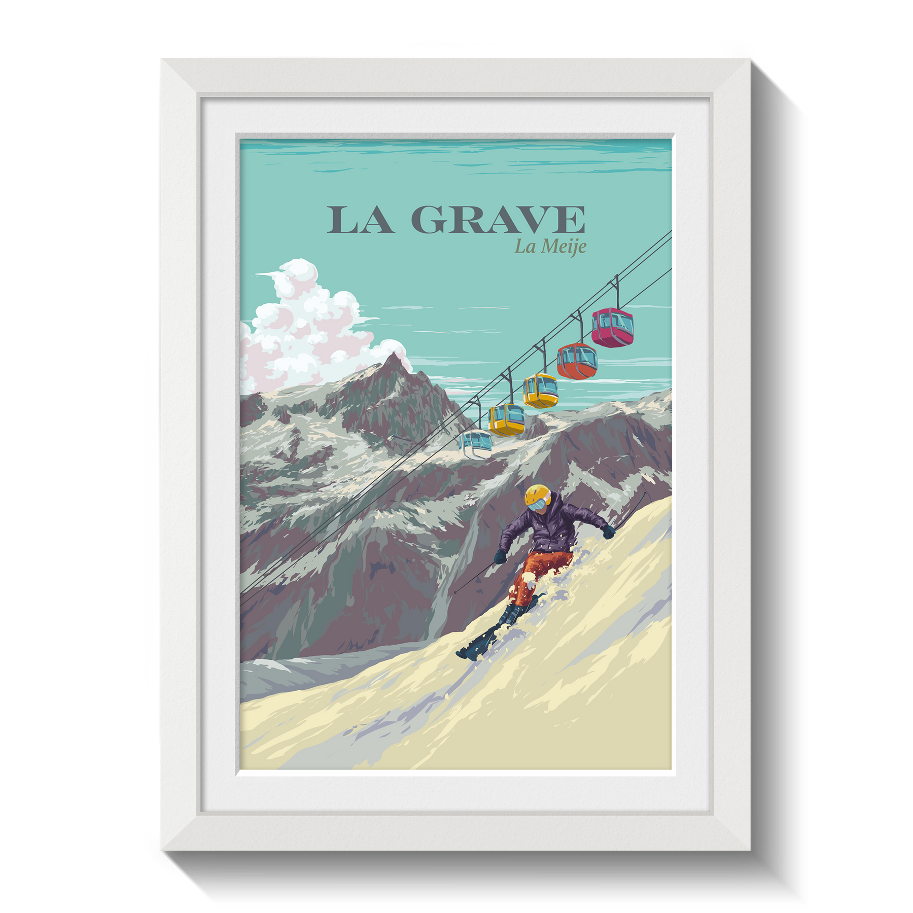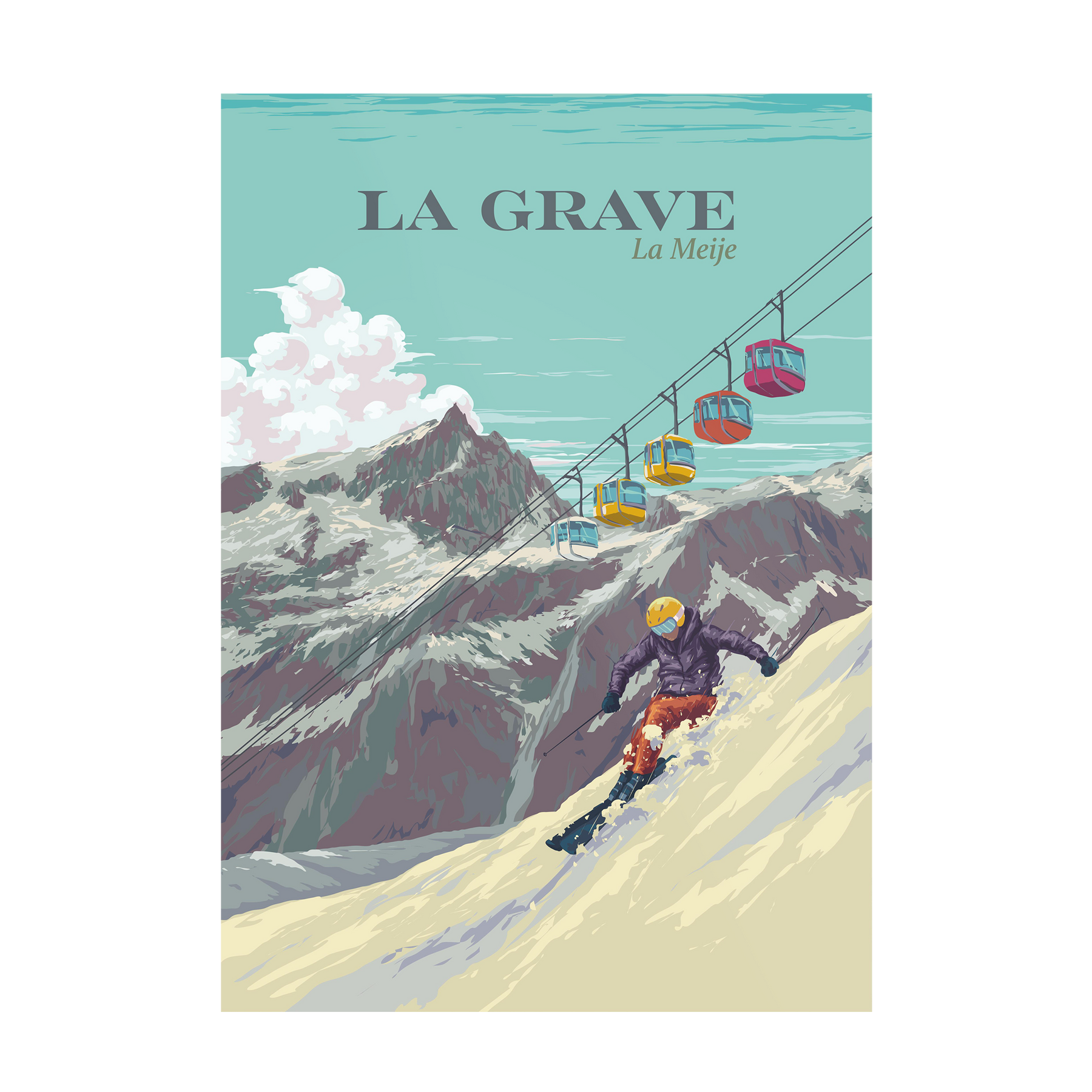 This is an original travel poster featuring the iconic colourful gondolas of La Grave La Meije. Located at the border of the Écrins National Park in France, la Grave is more of a village with a lift than your typical ski resort. It is home to some of the best skiing in Europe.