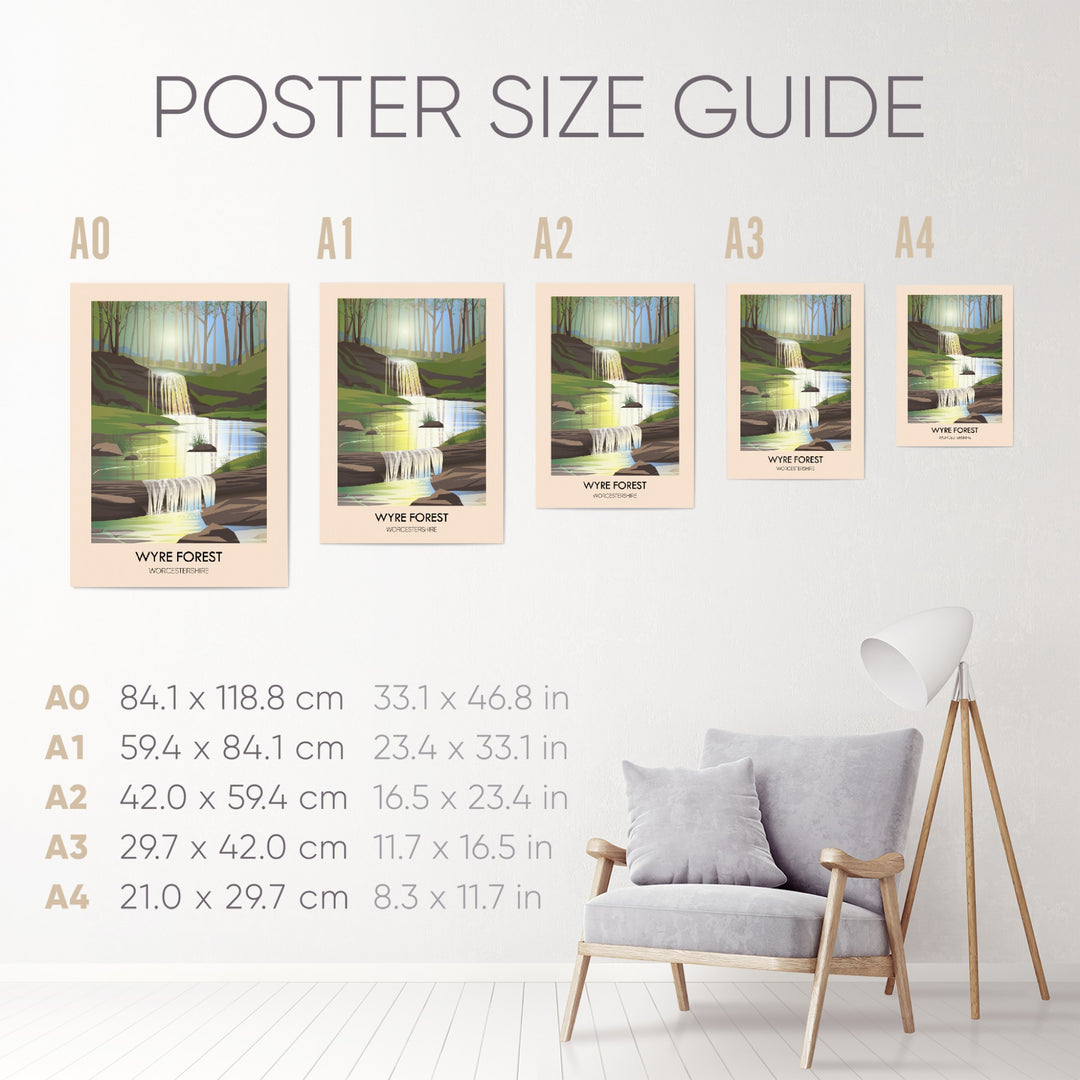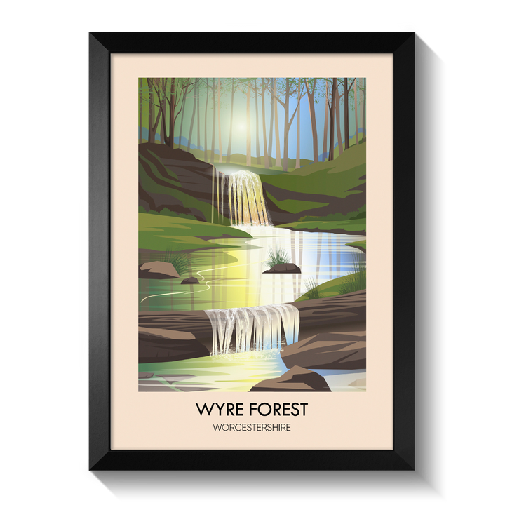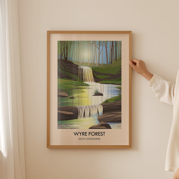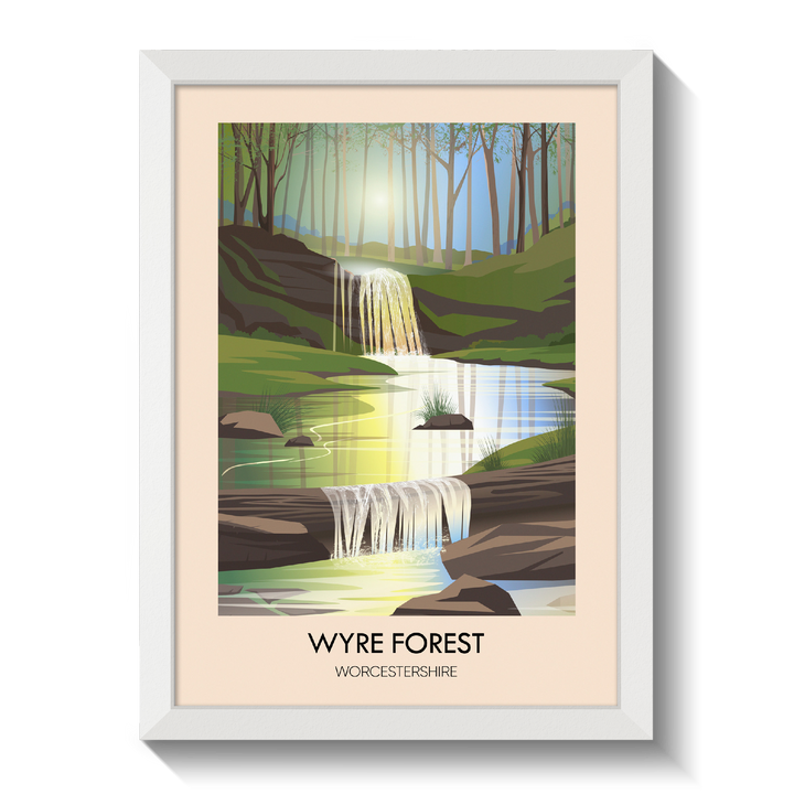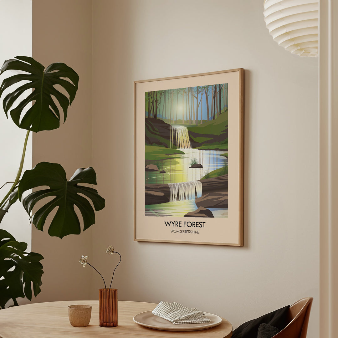 An original travel poster featuring Wyre Forest, the UK's largest woodland National Nature Reserve. Wyre Forest is located to the west of Birmingham and straddles the counties of Worcestershire and Shropshire.