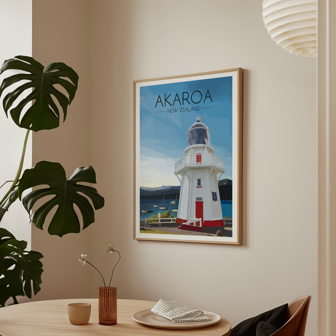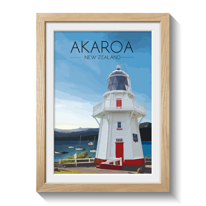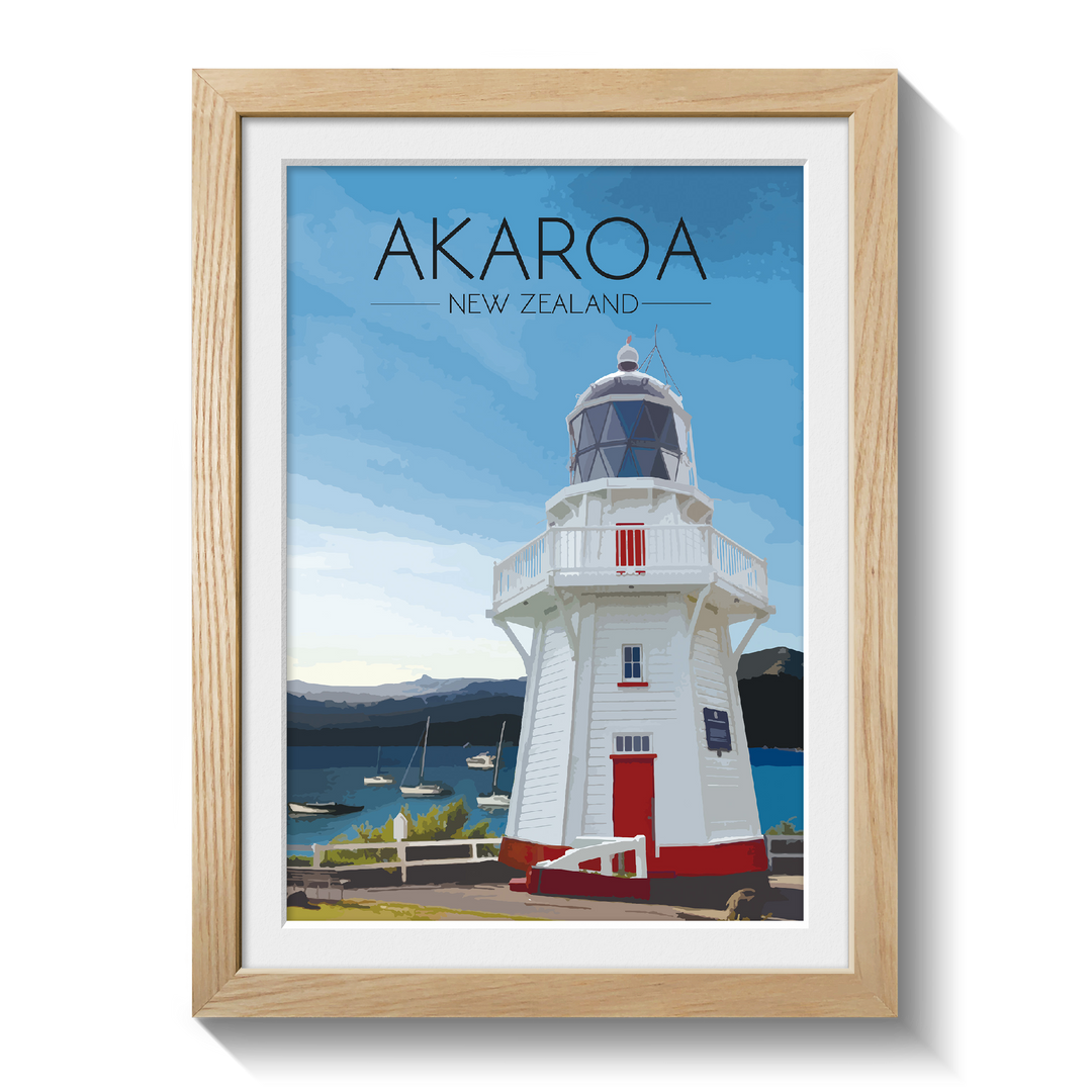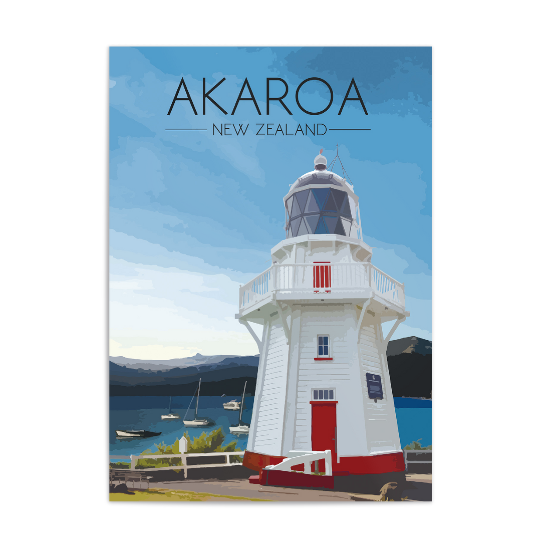Original print featuring the beautiful Akaroa Lighthouse overlooking the harbour on Banks Peninsula in Christchurch, New Zealand.