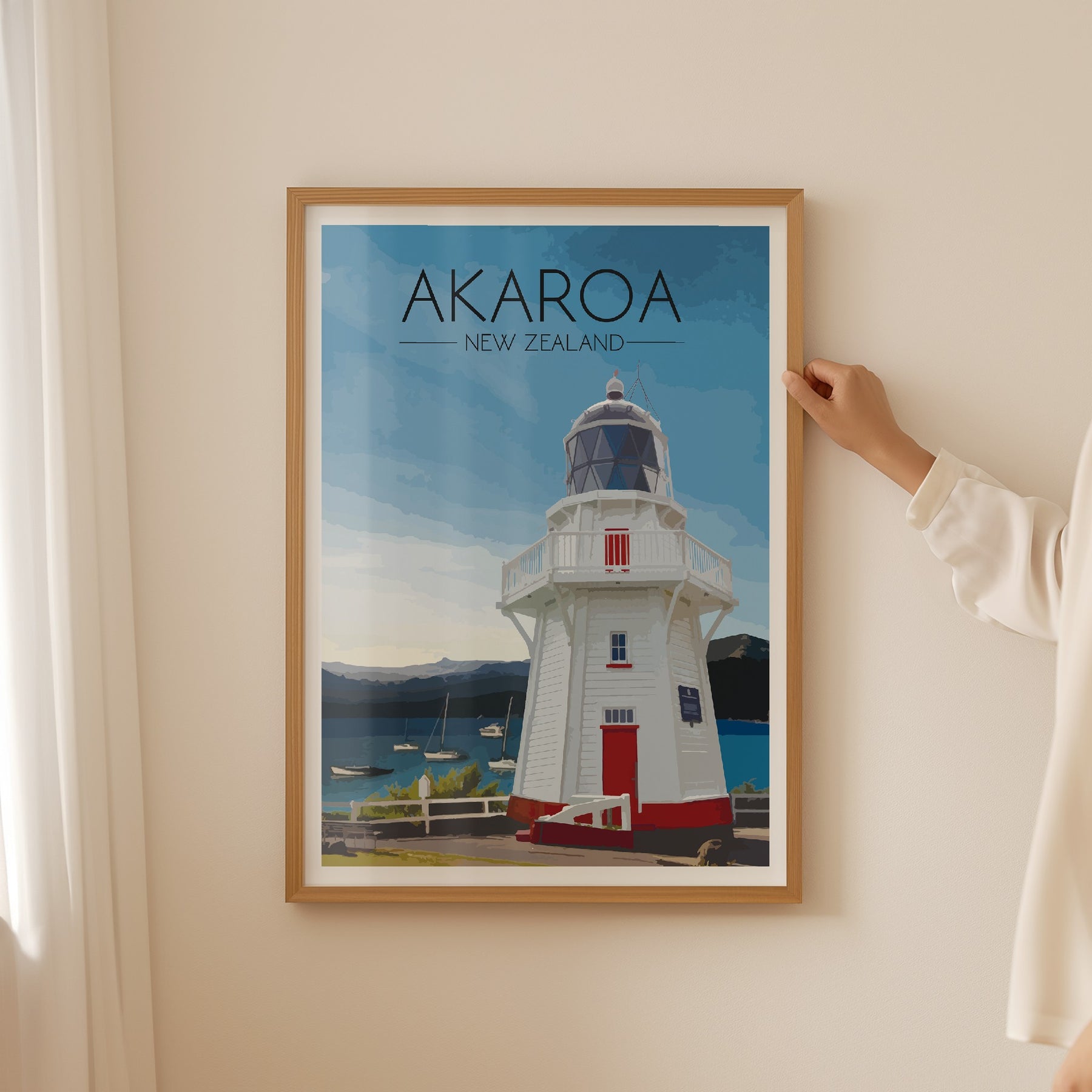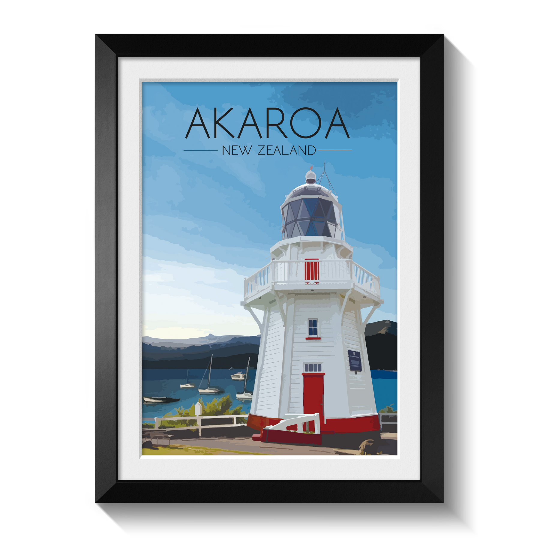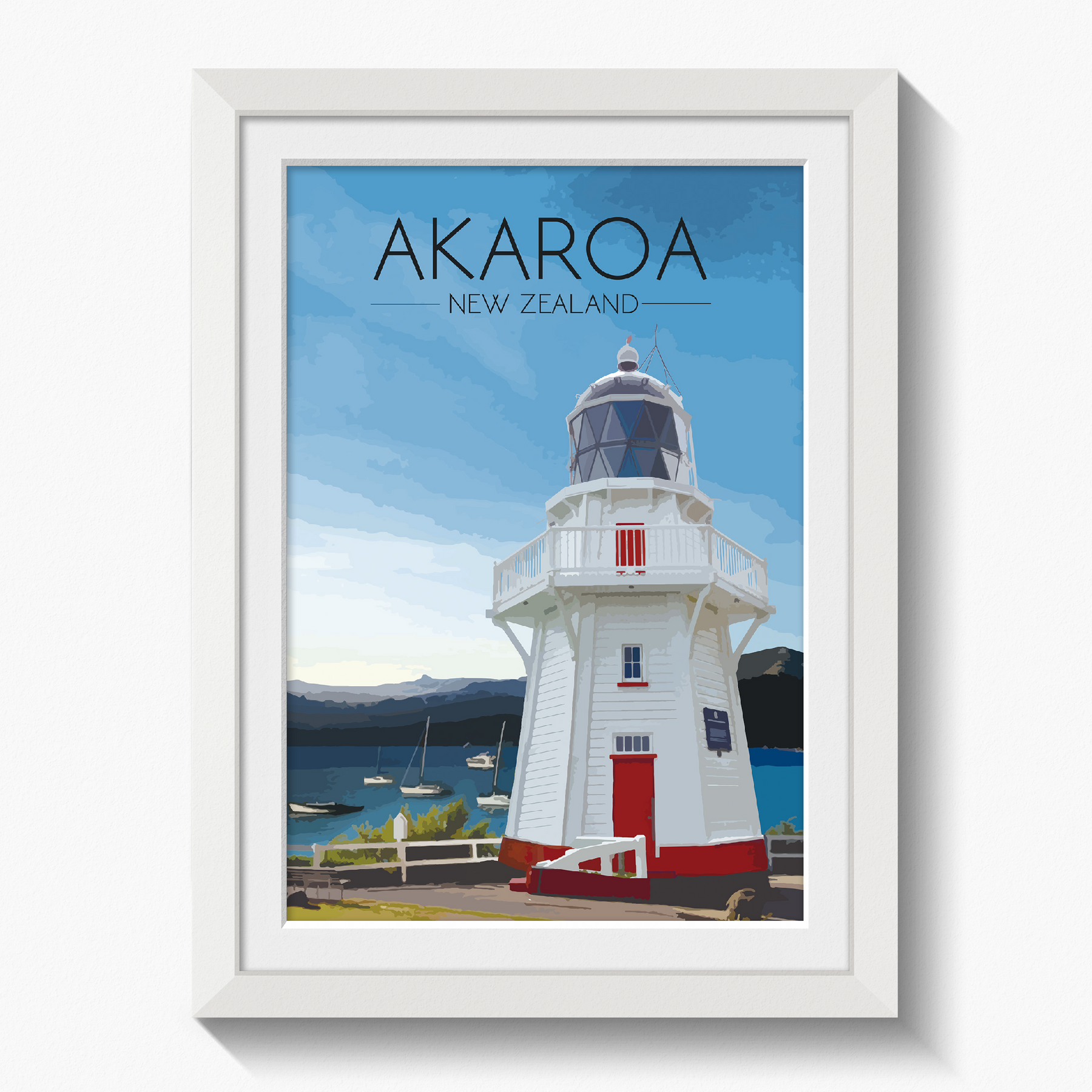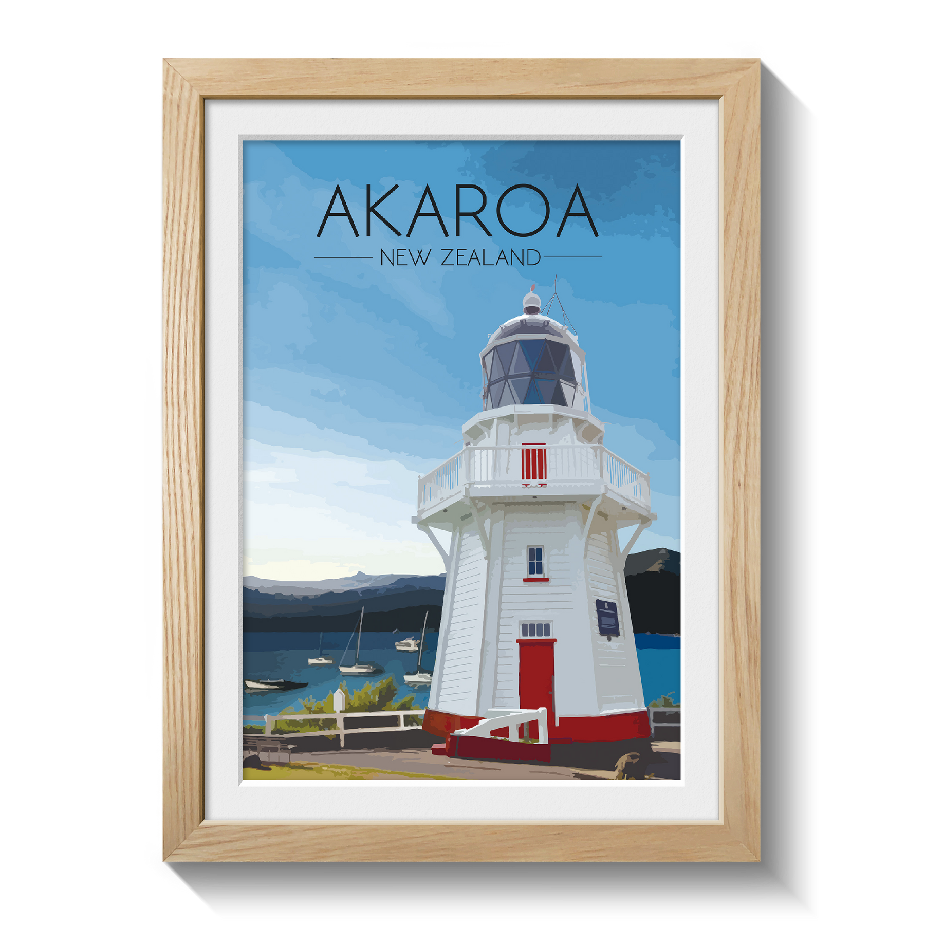 Original print featuring the beautiful Akaroa Lighthouse overlooking the harbour on Banks Peninsula in Christchurch, New Zealand.