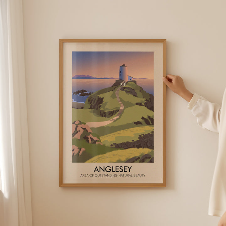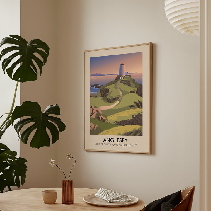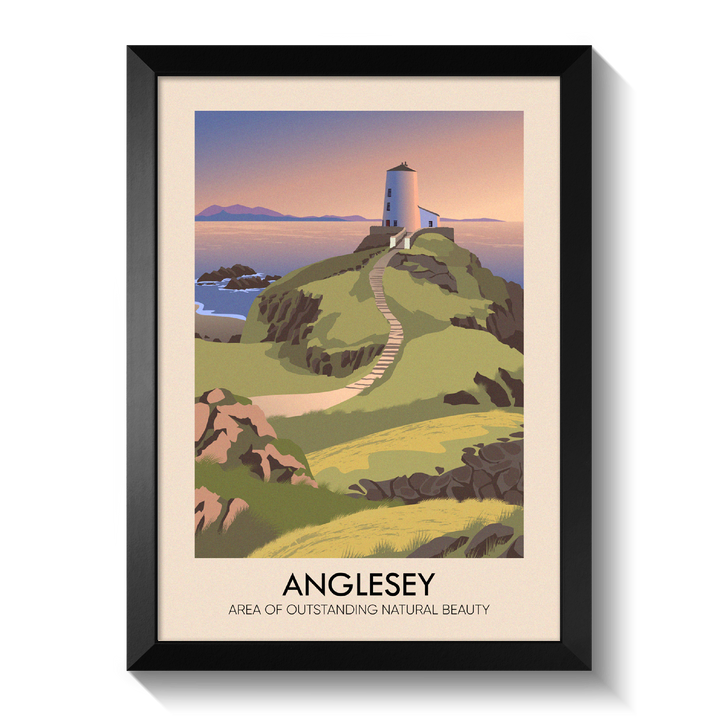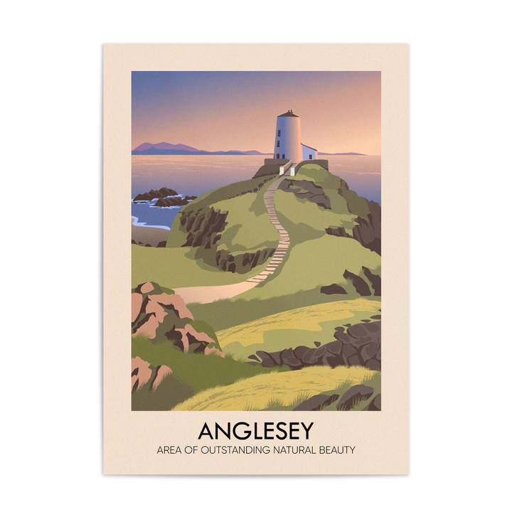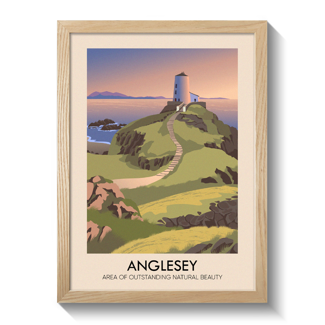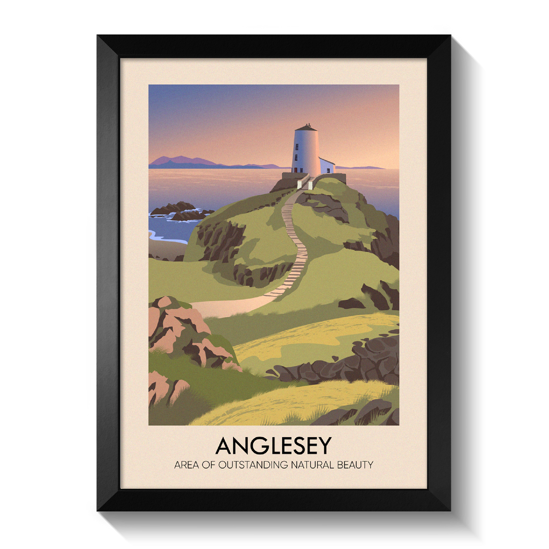 Original travel poster featuring Twr Mawr Lighthouse on The Isle of Anglesey. Anglesey AONB covers a one third of the island and is one of five AONBs in Wales.