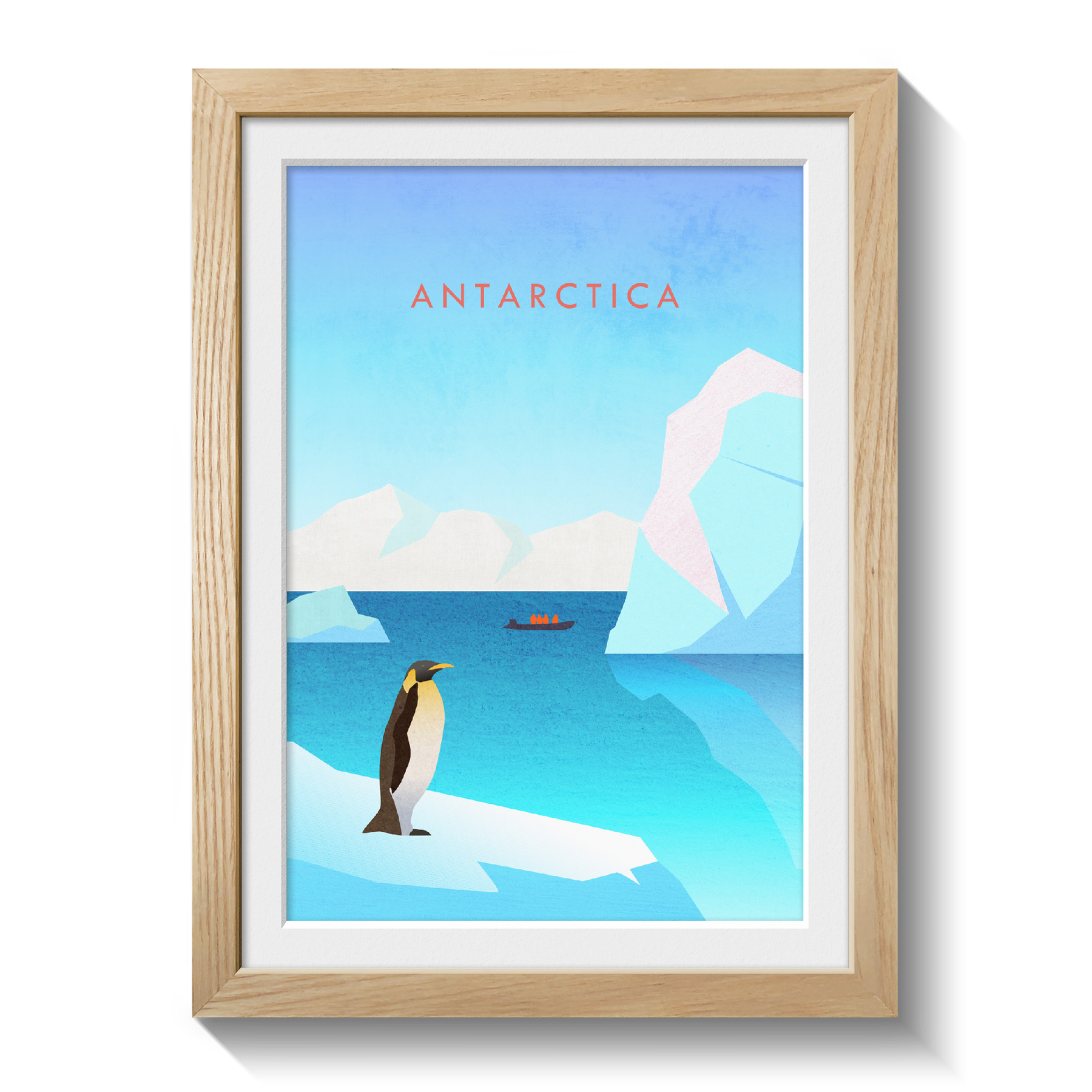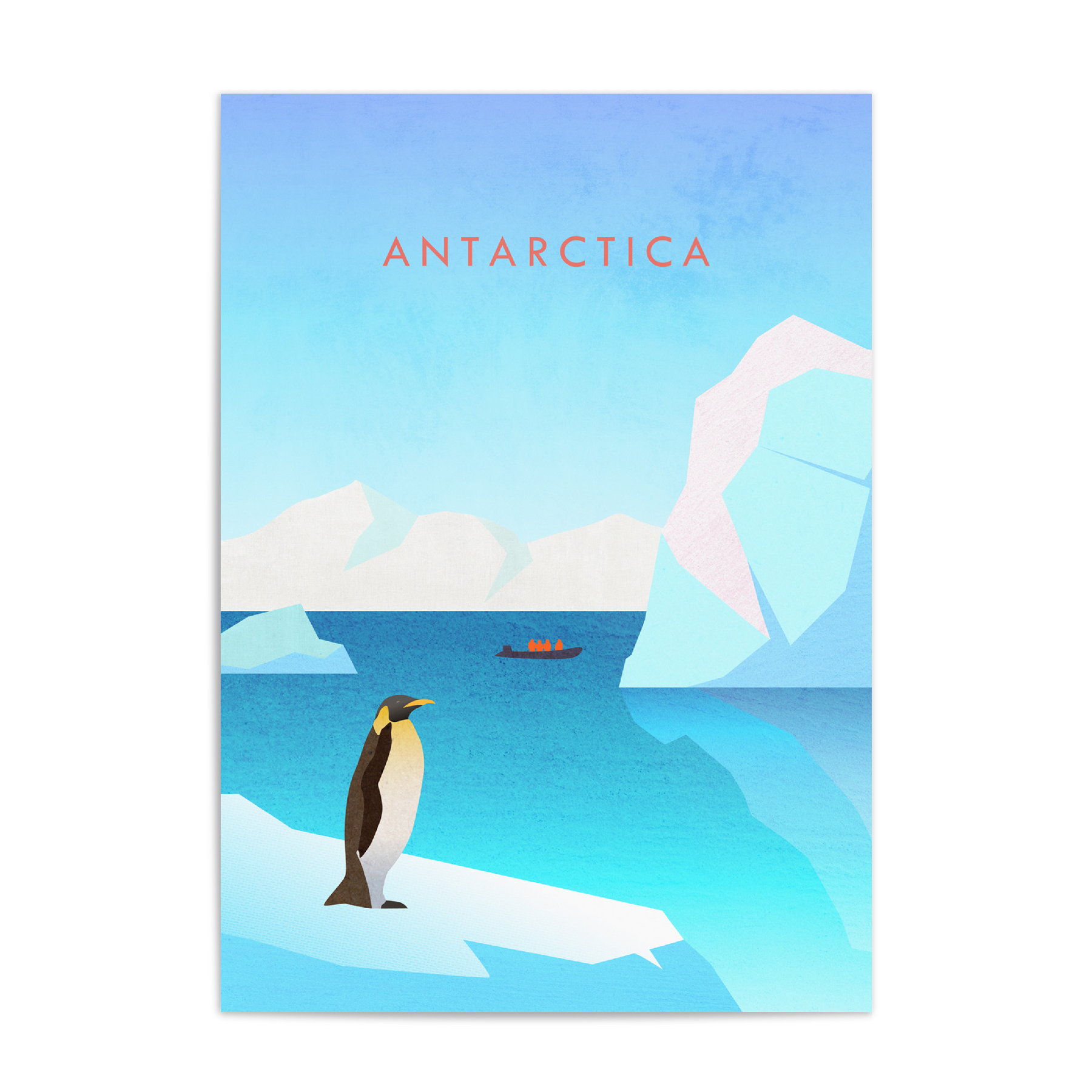 Original travel poster for Antarctica, the southernmost continent and site of the South Pole. In the foreground you can see a penguin, one of the main residents of the area perched on an iceberg.