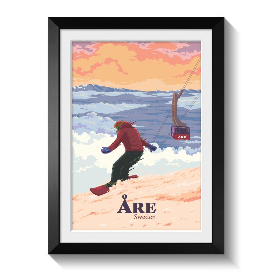 This is an original snowboarding travel poster featuring the Swedish Ski Resort of Are, in Jamtland County, Sweden. It features a downhill skier with the Are cable car in the background.