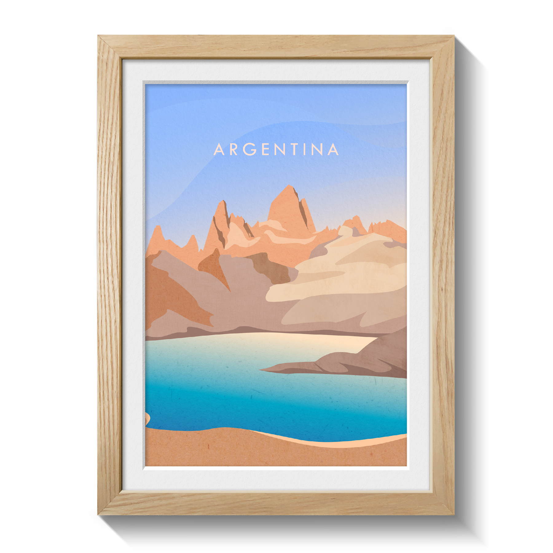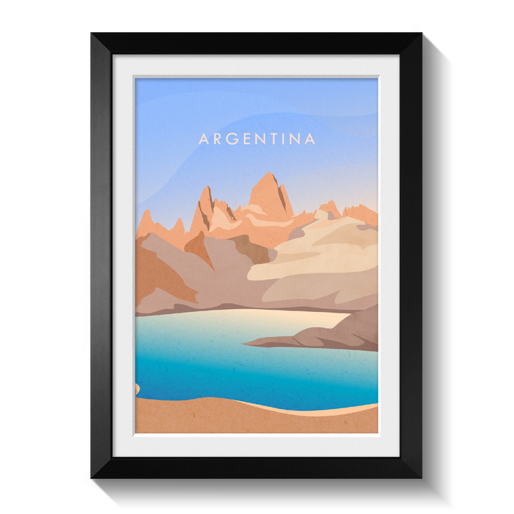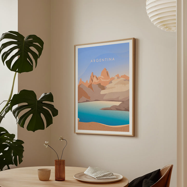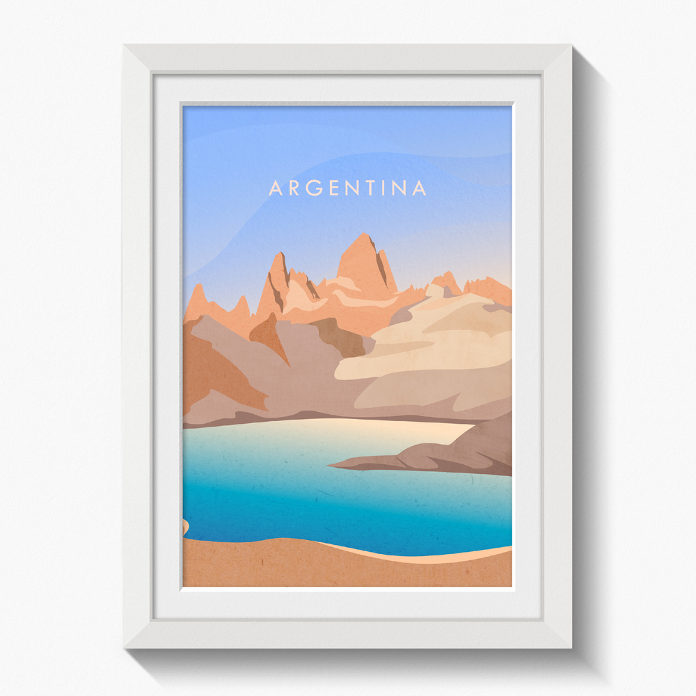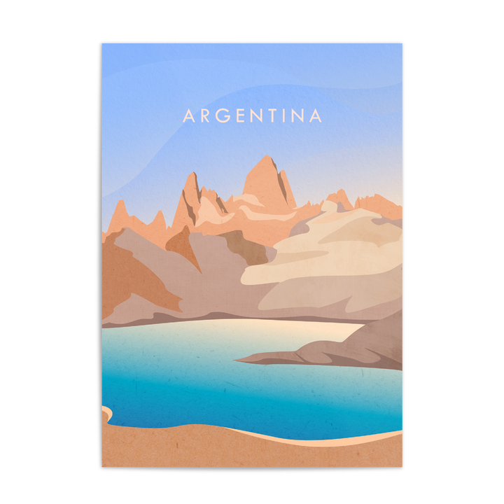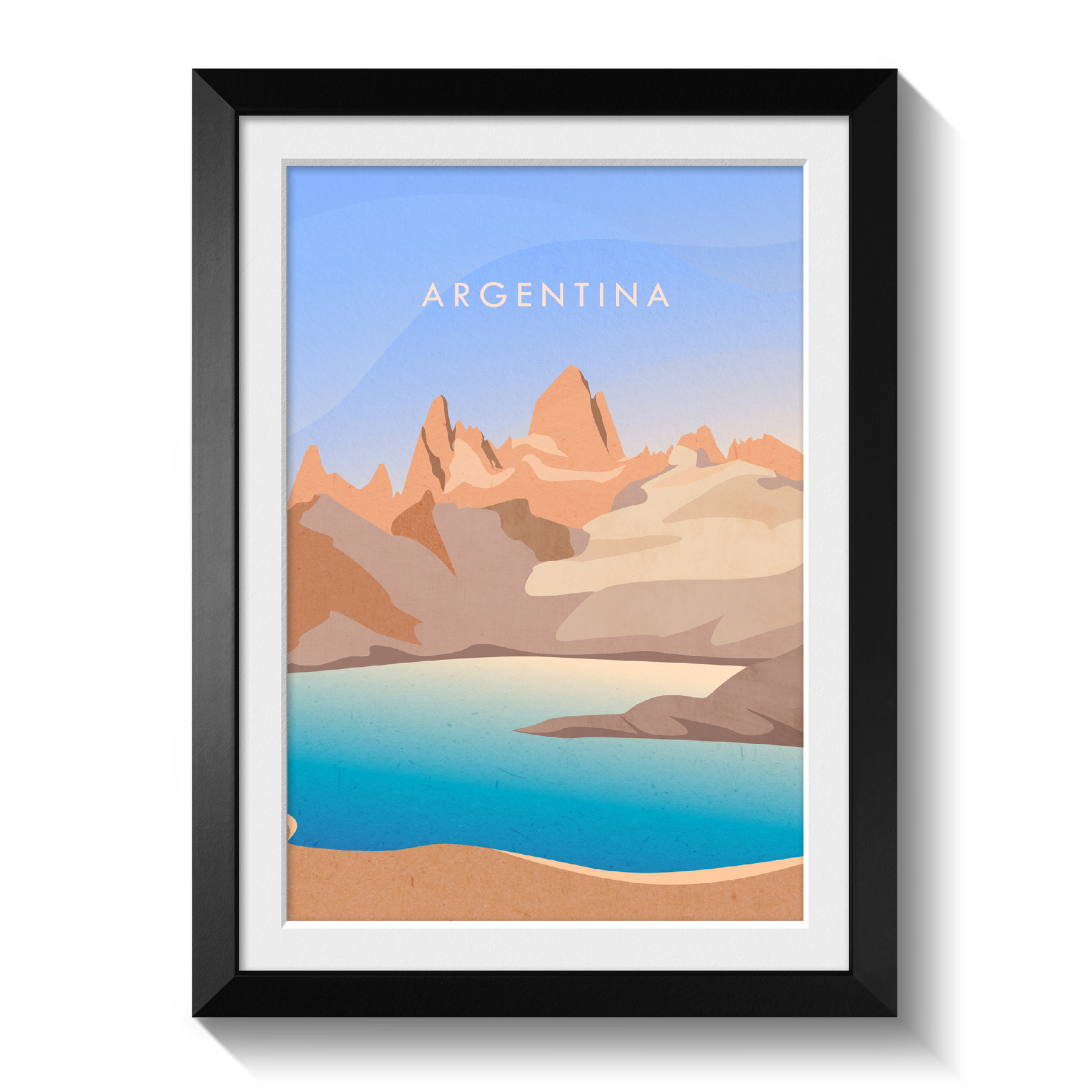 Original travel poster for Argentina, a vast country located in the southern part of South America, featuring the shimmering lakes and craggy peaks of the Andes. This print features the famous Mt Fitz Roy in Torres del Paine National Park in the Patagonia region.