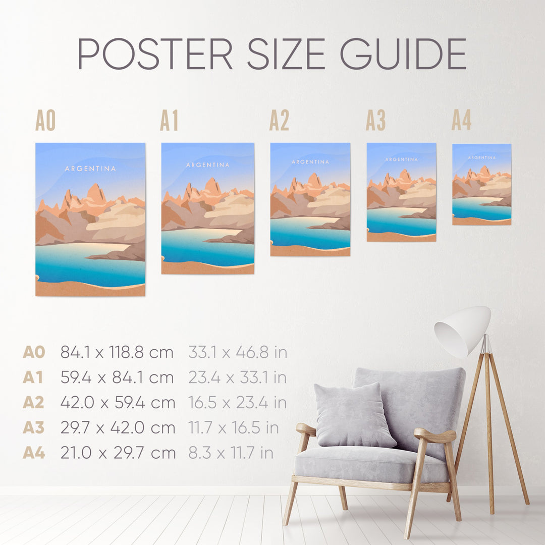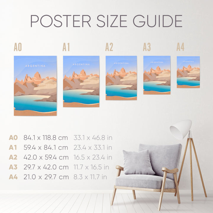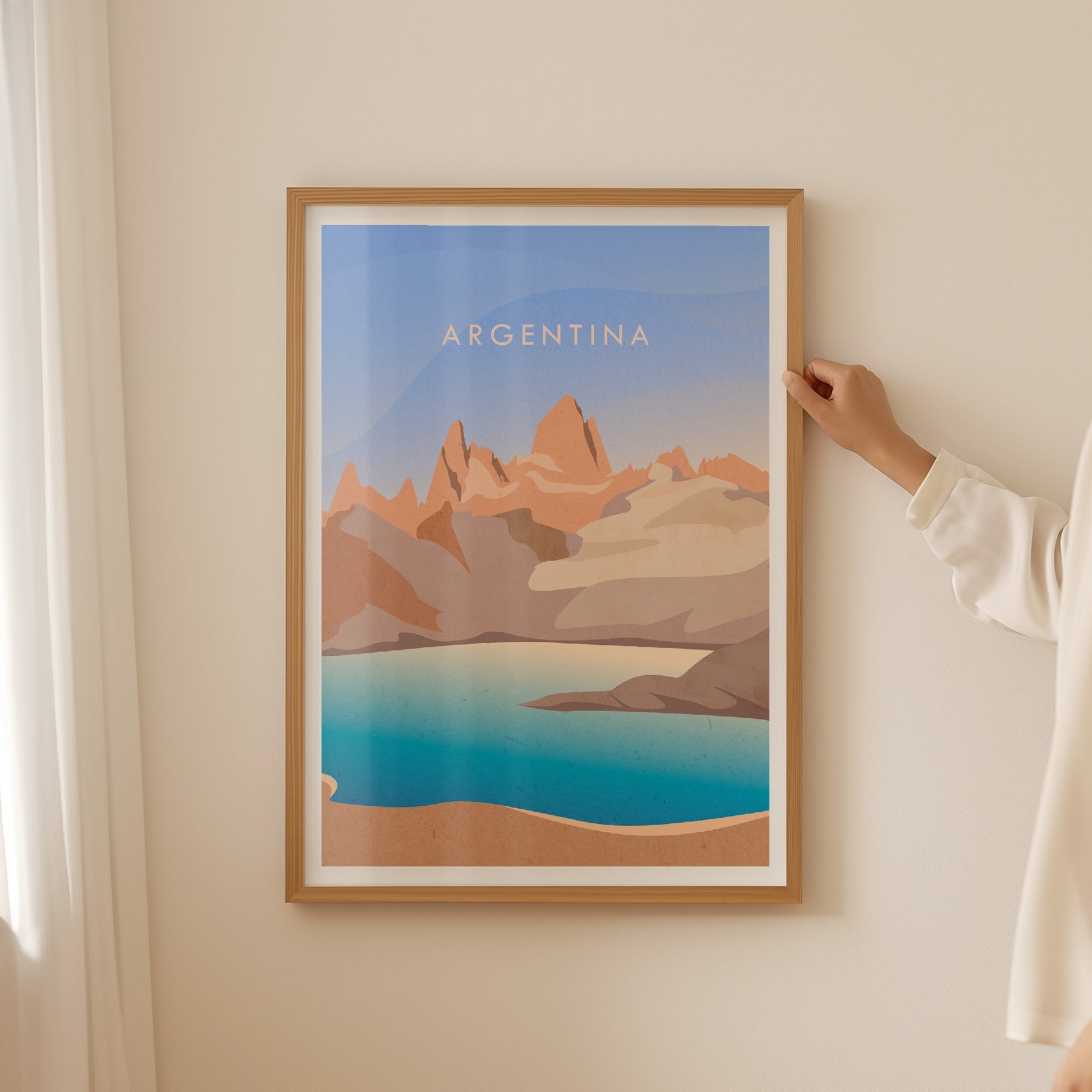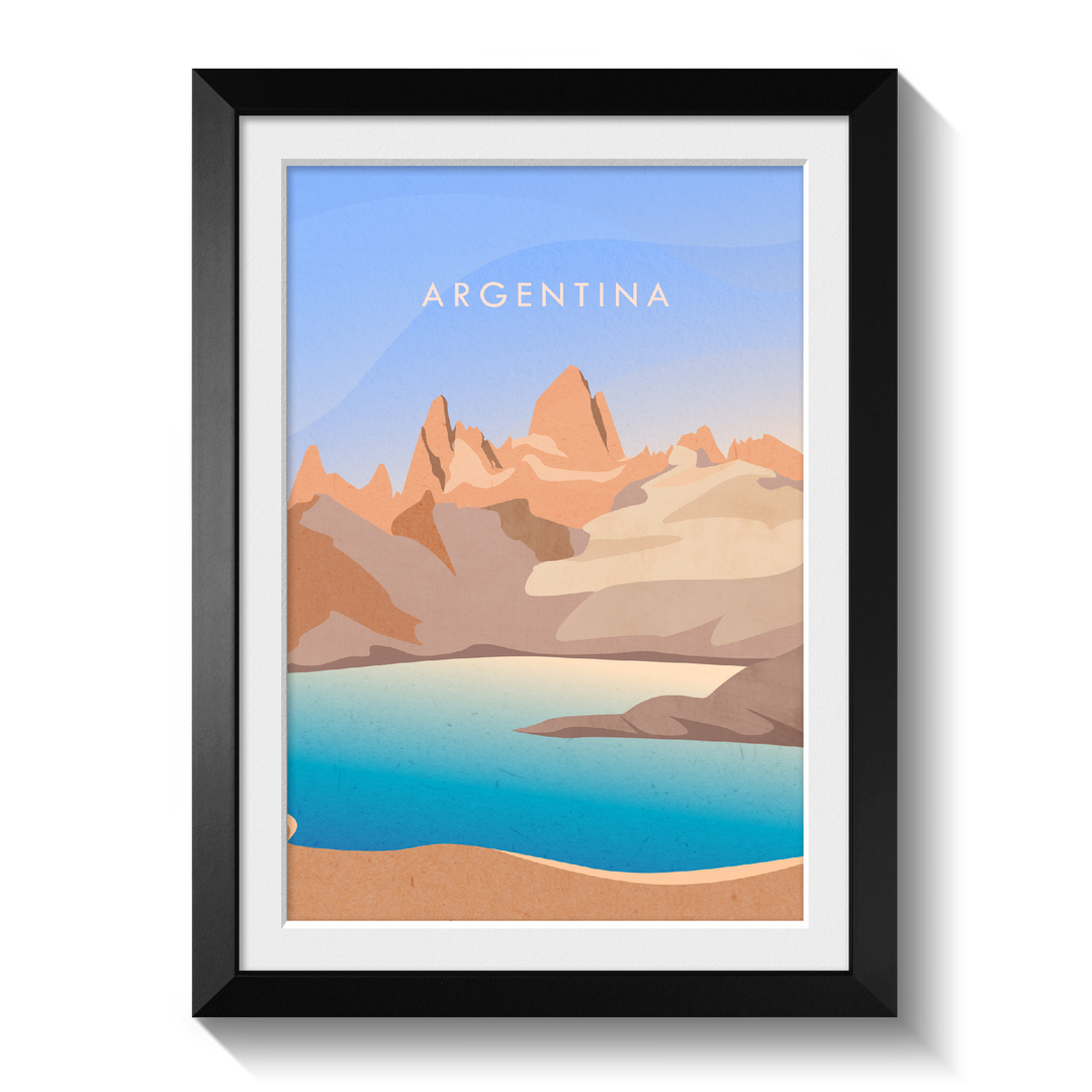Original travel poster for Argentina, a vast country located in the southern part of South America, featuring the shimmering lakes and craggy peaks of the Andes. This print features the famous Mt Fitz Roy in Torres del Paine National Park in the Patagonia region.
