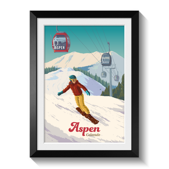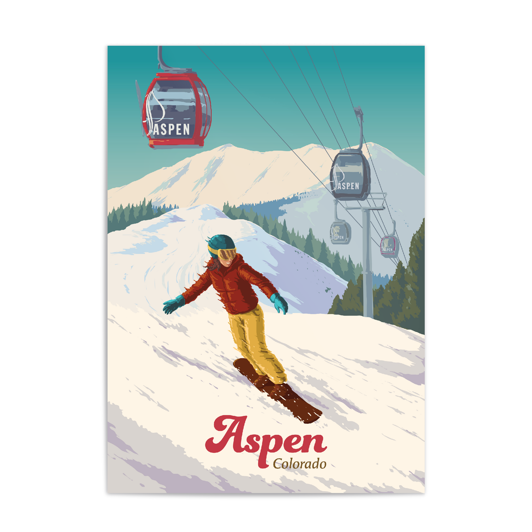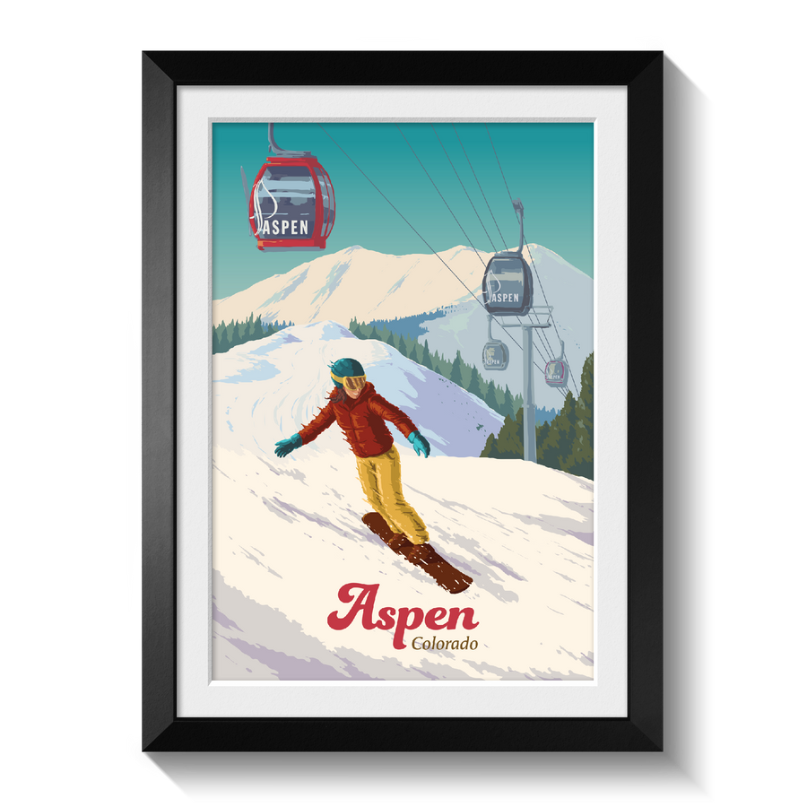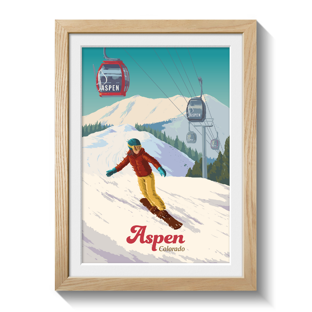 An original snowboard print featuring the famous ski resort of Aspen, Colorado. Aspen is one of the most popular resorts in the United States. It consists of 4 mountains, the largest being Aspen Snowmass.