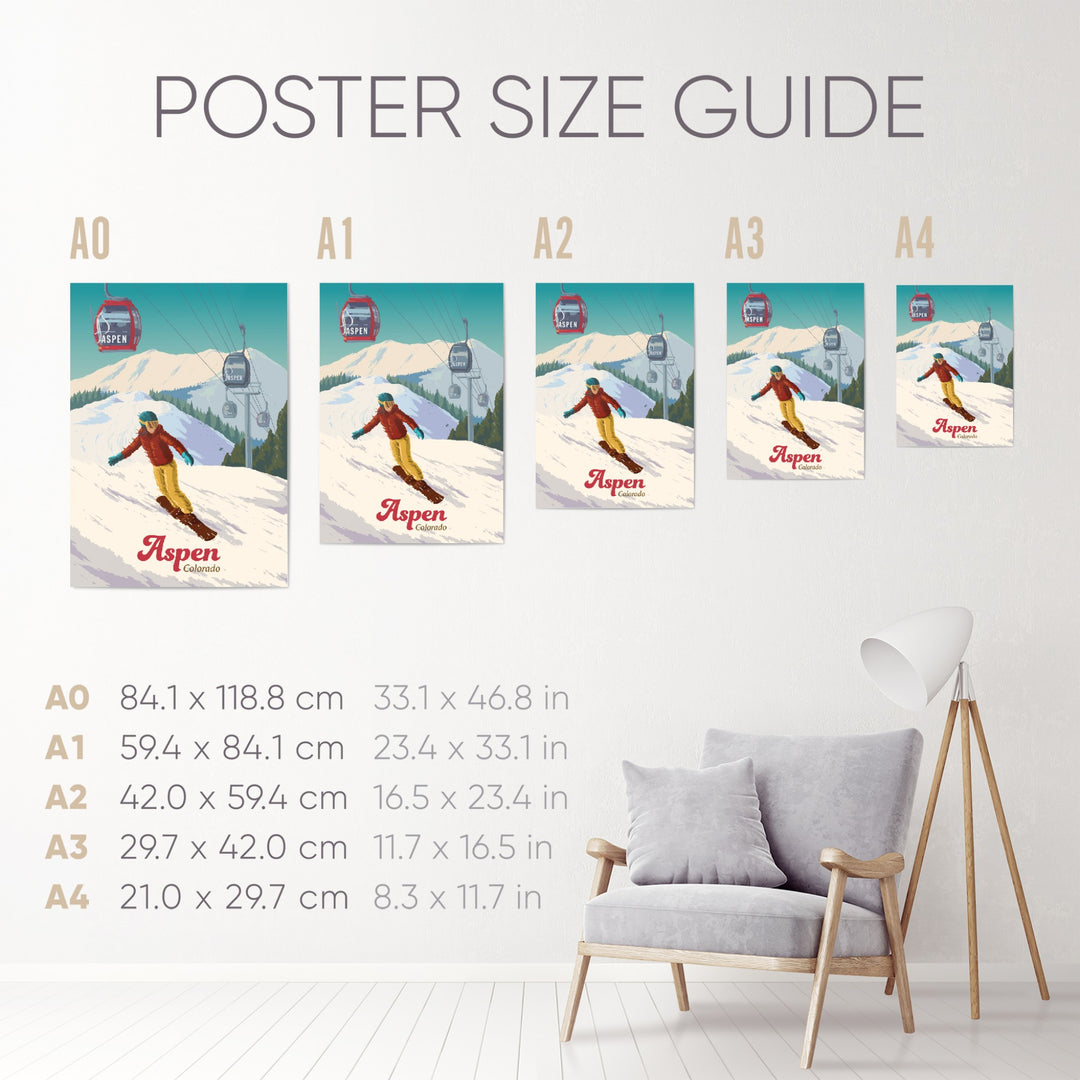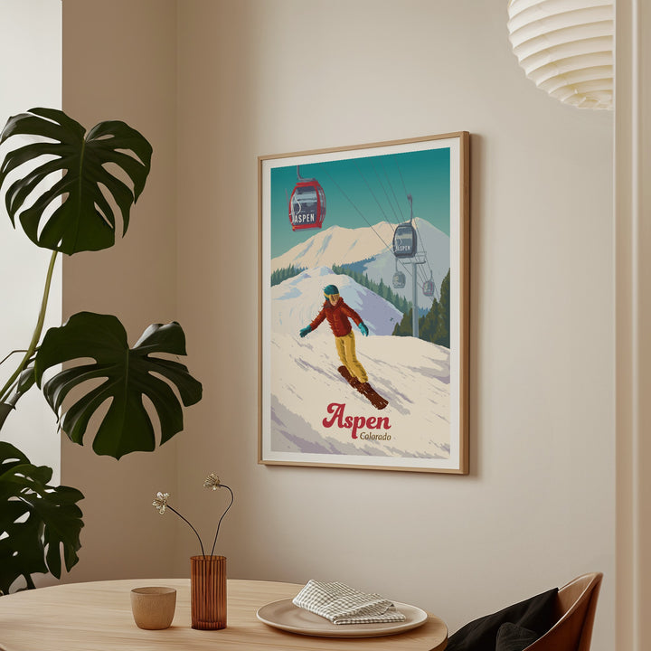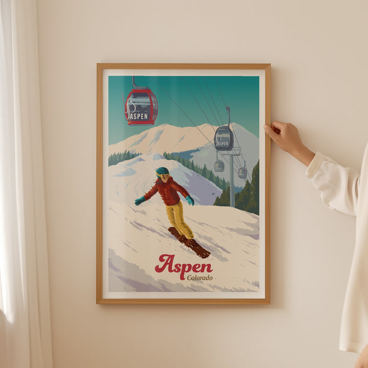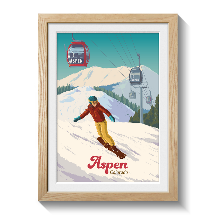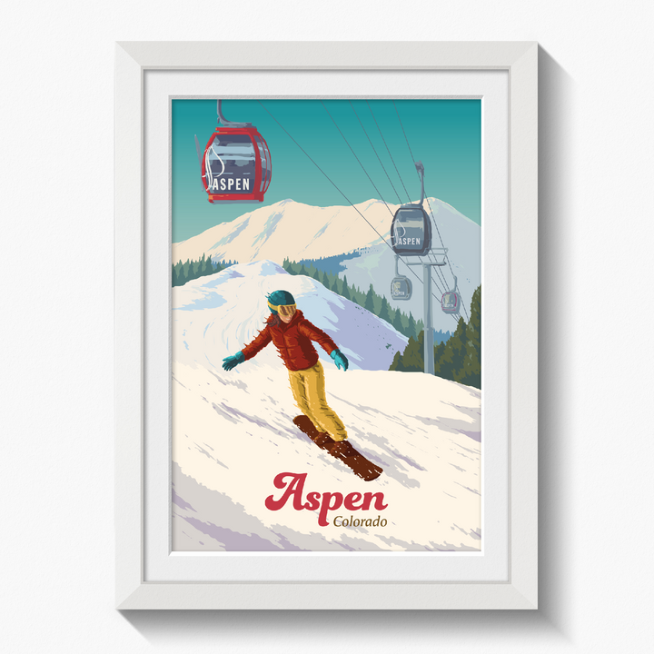 An original snowboard print featuring the famous ski resort of Aspen, Colorado. Aspen is one of the most popular resorts in the United States. It consists of 4 mountains, the largest being Aspen Snowmass.