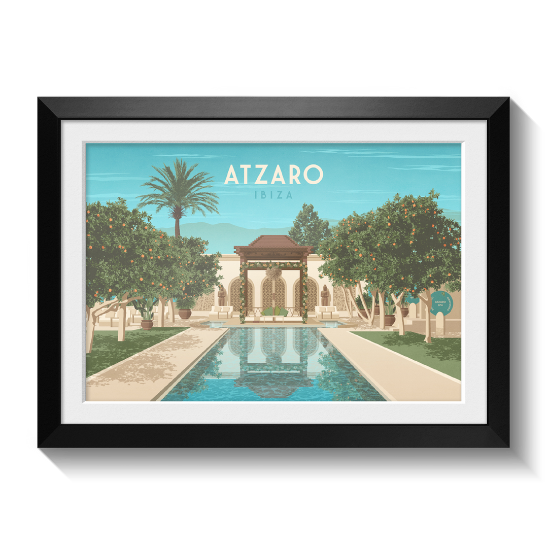 An original travel poster of Atzaro Ibiza Nightclub, a top nightlife destination on the island. This travel poster showcases the vibrant club, known for its stylish atmosphere and world-class events. Set in stunning surroundings, Atzaro is the perfect spot to enjoy Ibiza's nightlife and party under the stars.