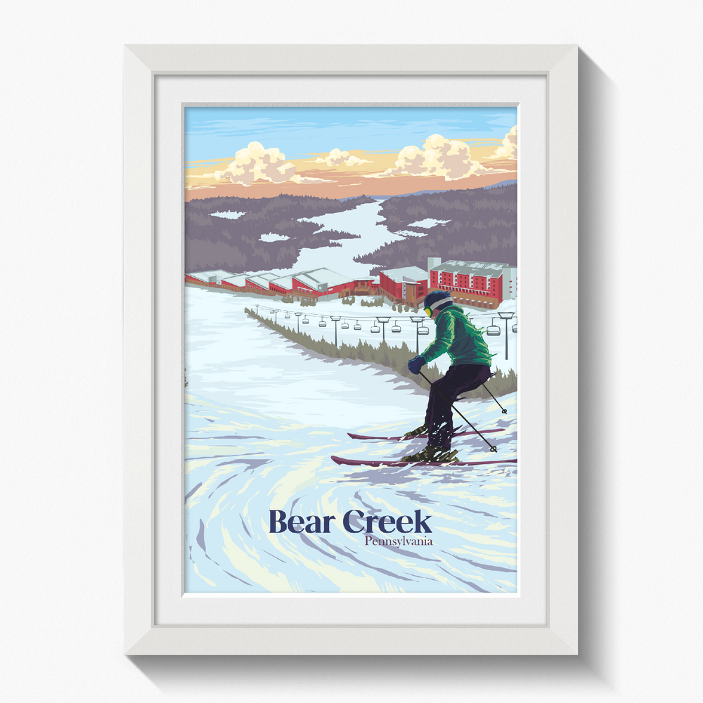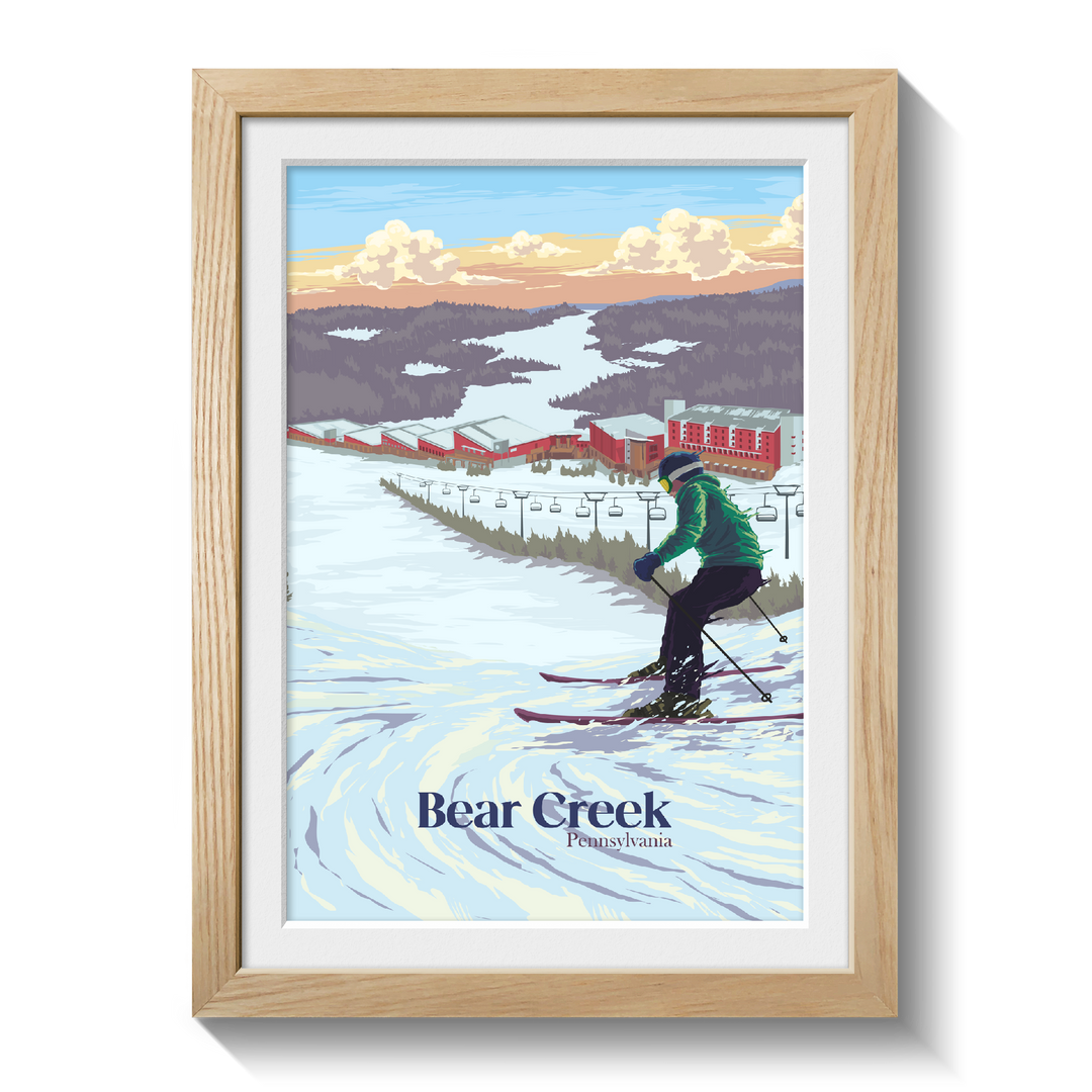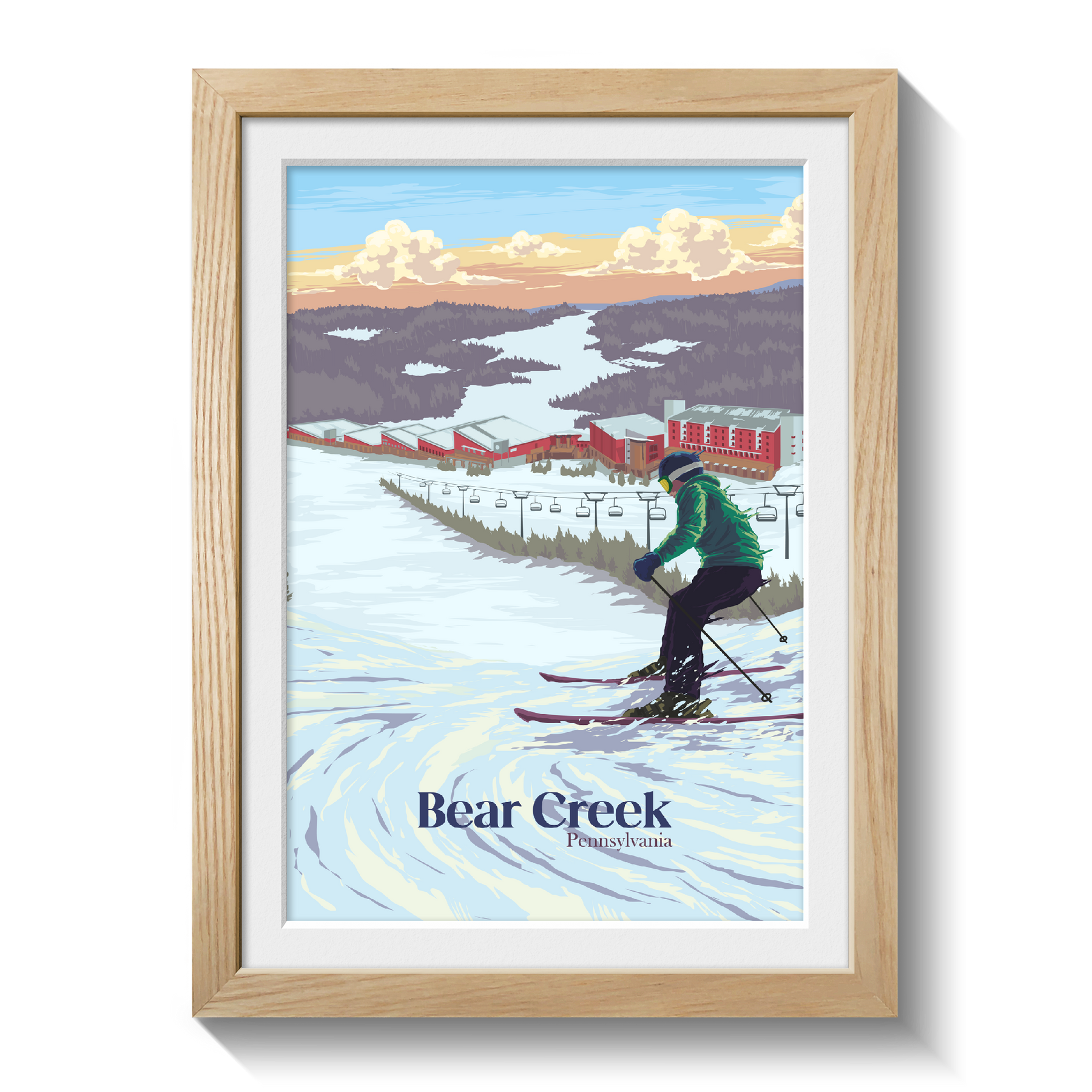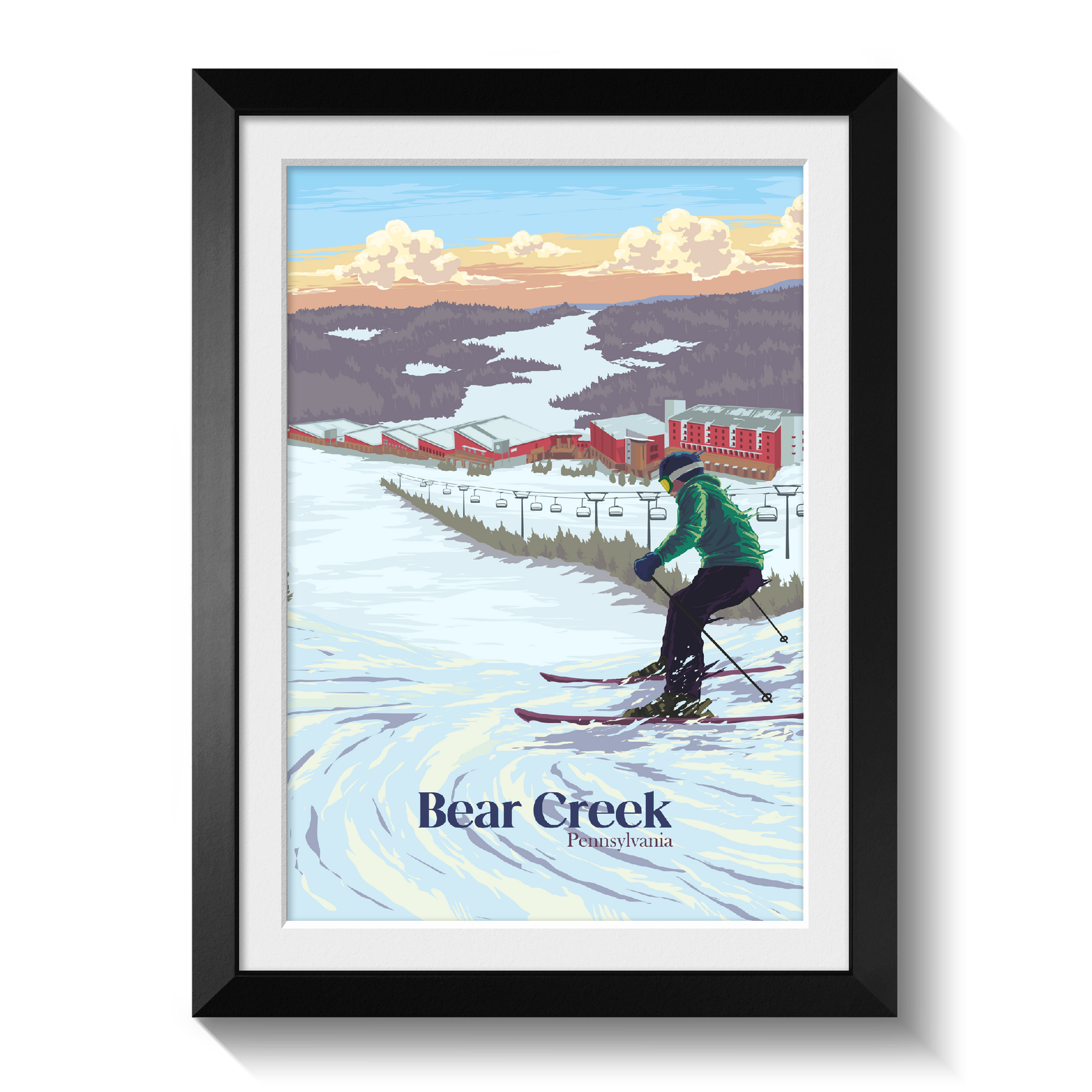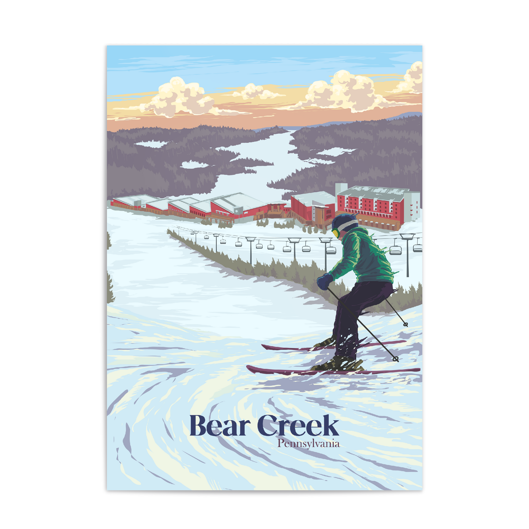 Original travel poster featuring Bear Creek Ski Resort in Berks County, Pennsylvania USA. Bear Creek was originally called Doe Mountain ski area until 1999 when it changed ownership and developed into a 4 season resort.