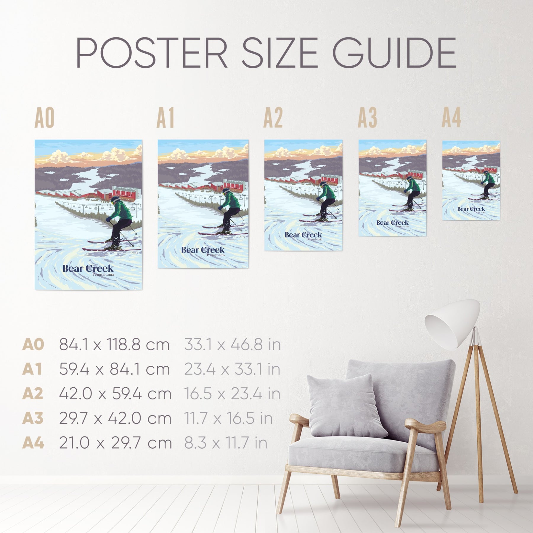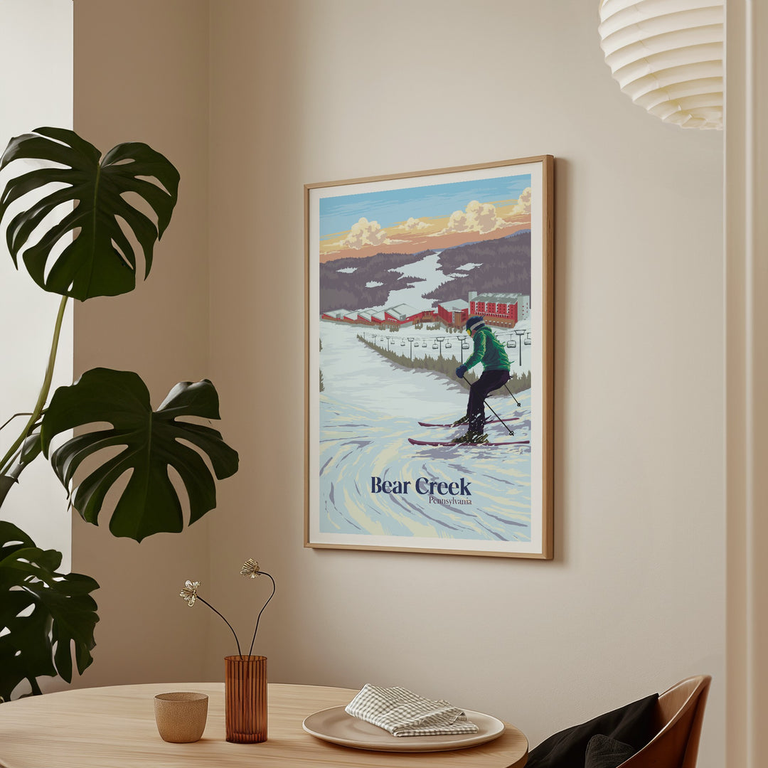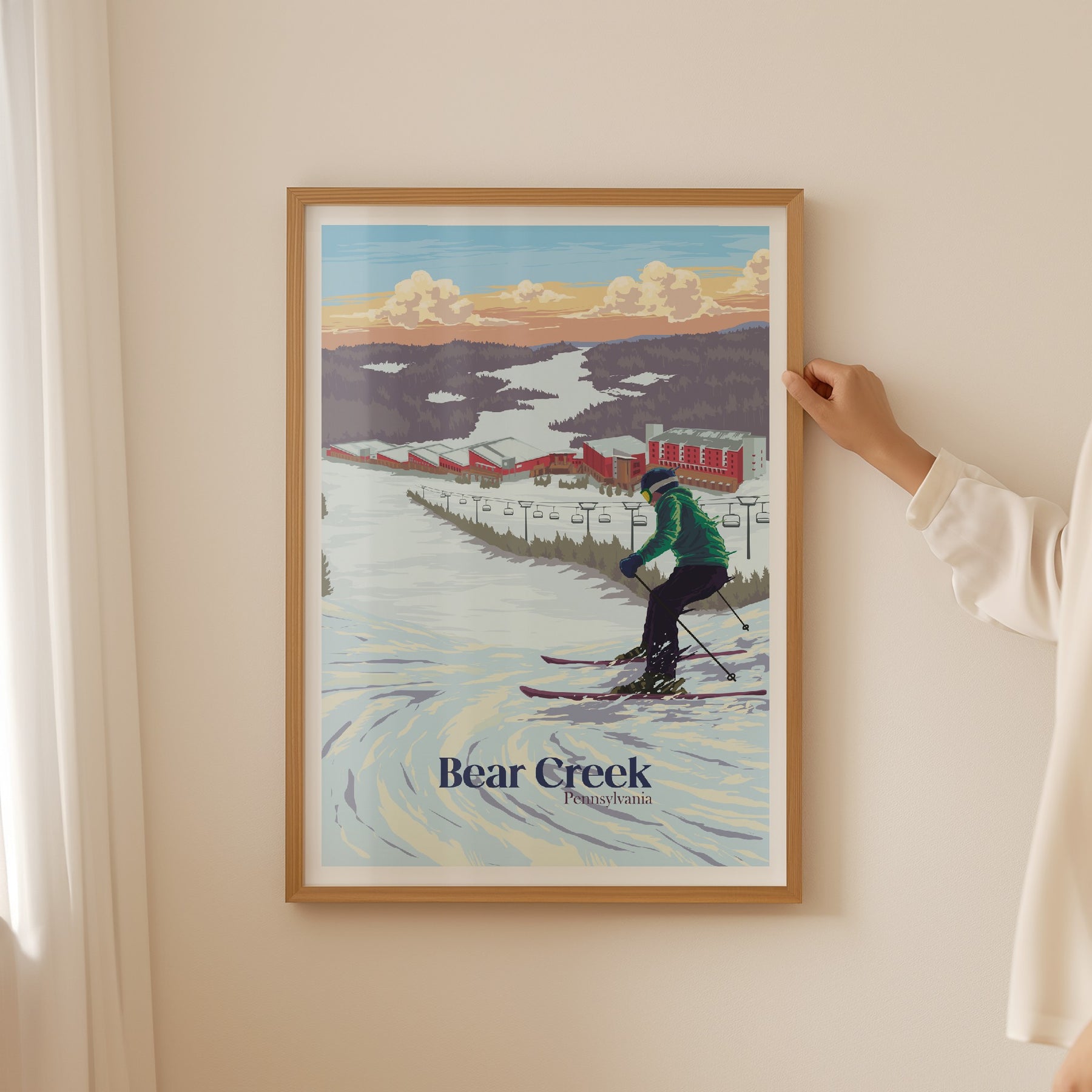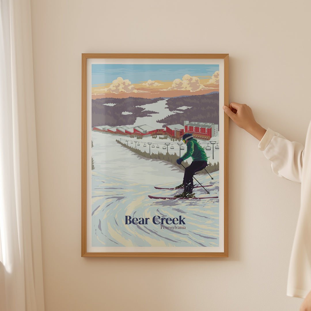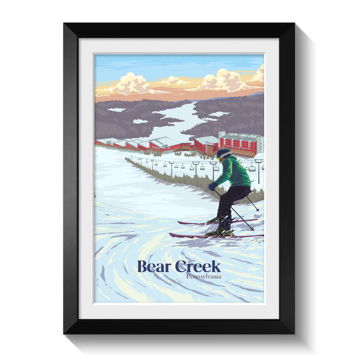 Original travel poster featuring Bear Creek Ski Resort in Berks County, Pennsylvania USA. Bear Creek was originally called Doe Mountain ski area until 1999 when it changed ownership and developed into a 4 season resort.