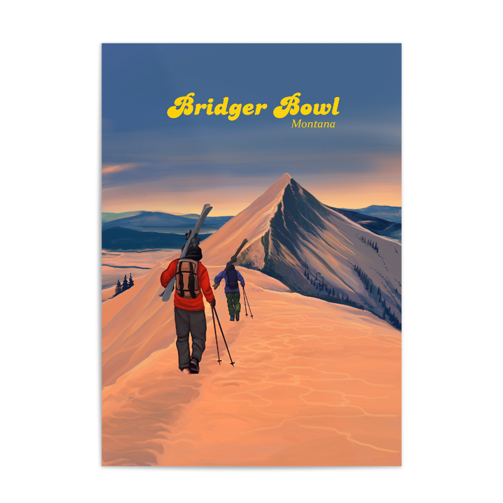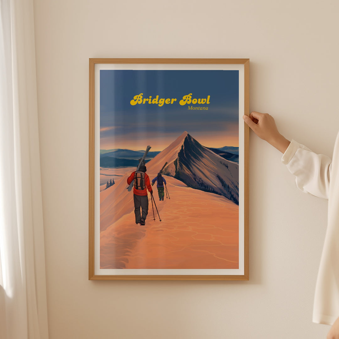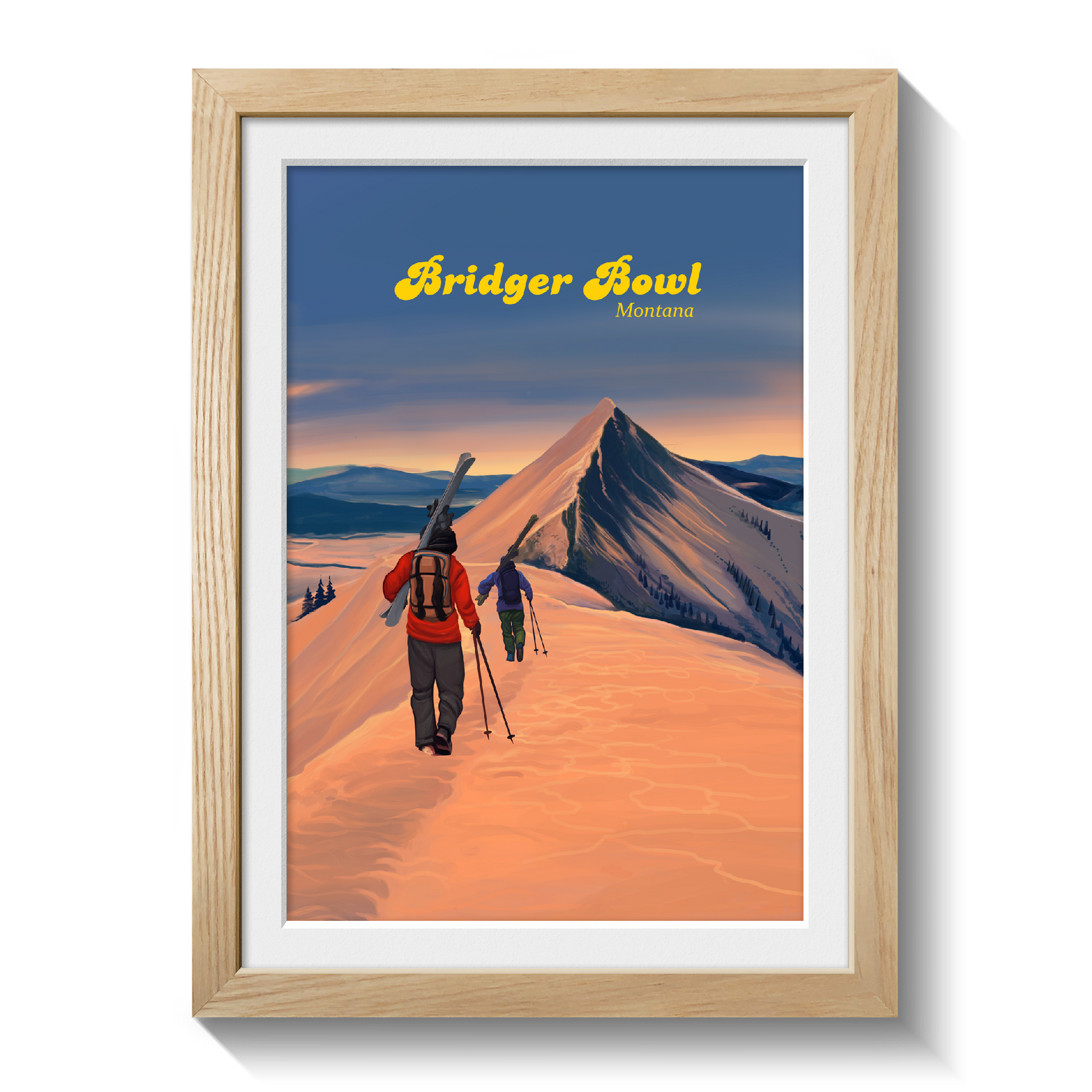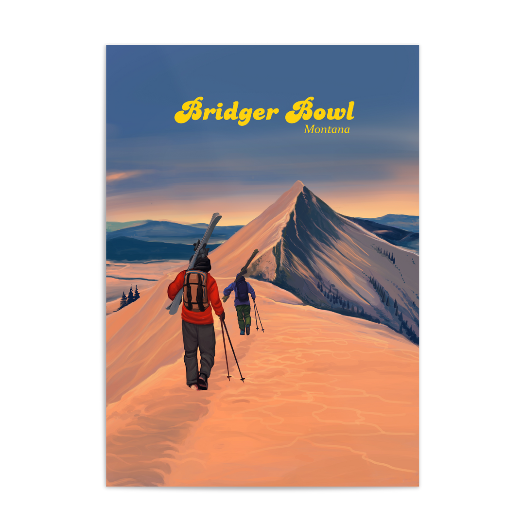 An original skiing print featuring Bridger Bowl Ski Area, a popular ski resort in Montana in the Western United States. The poster features the infamous ski area known as 'the ridge', suitable for expert skiers and snowboarders only.