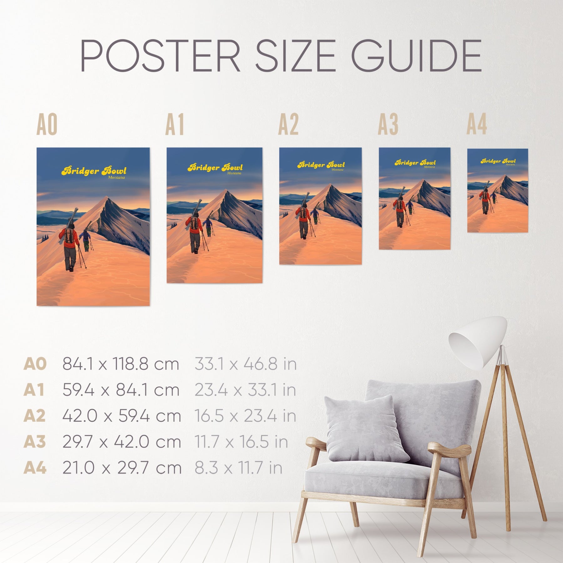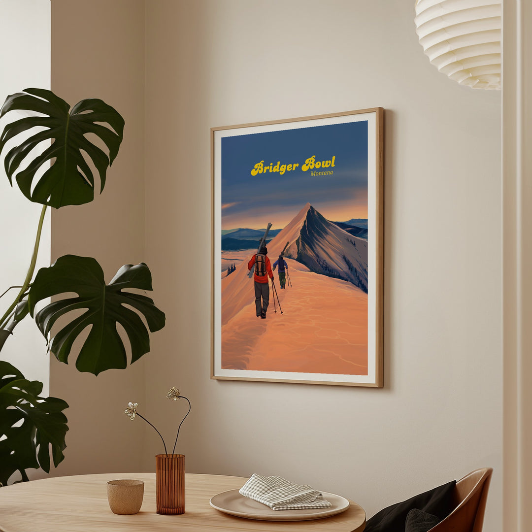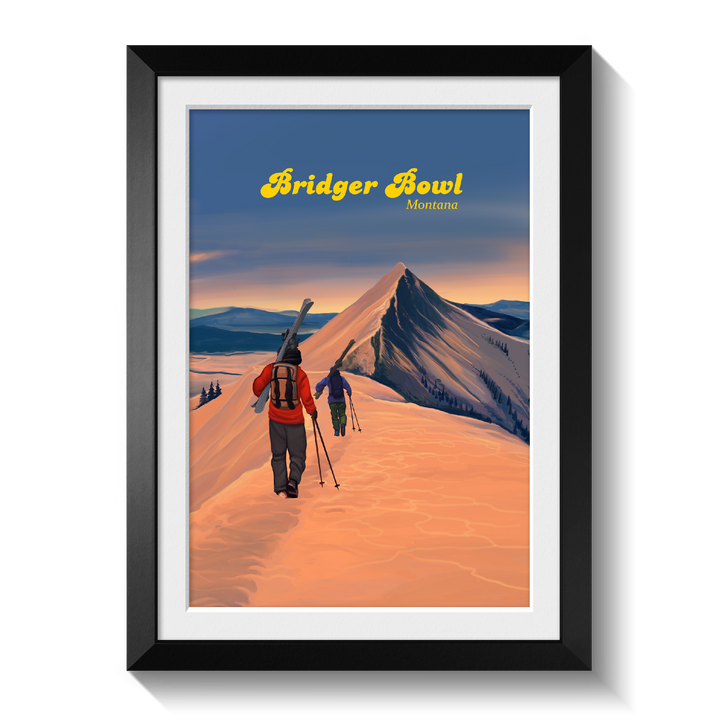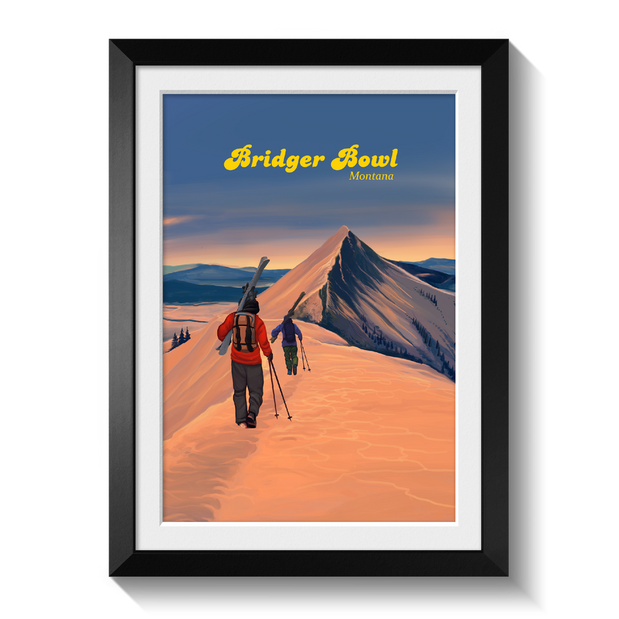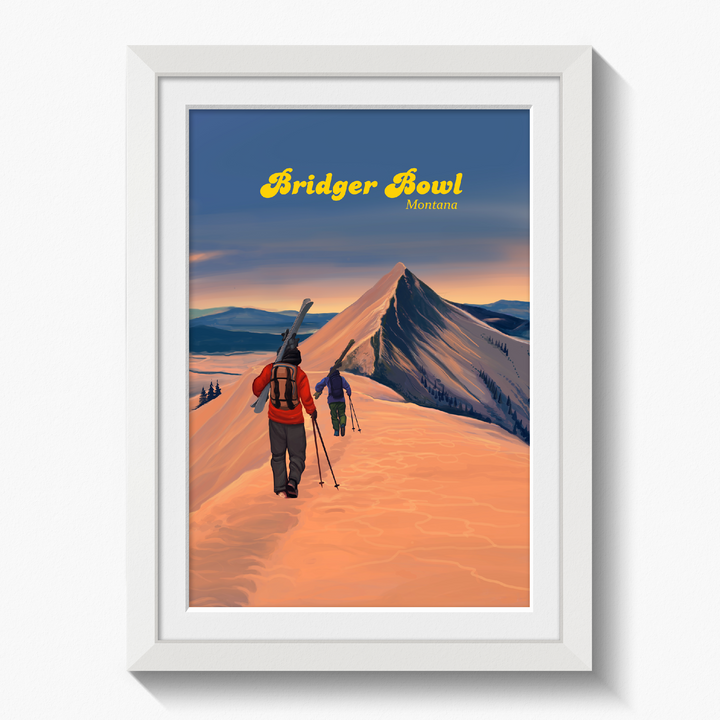 An original skiing print featuring Bridger Bowl Ski Area, a popular ski resort in Montana in the Western United States. The poster features the infamous ski area known as 'the ridge', suitable for expert skiers and snowboarders only.