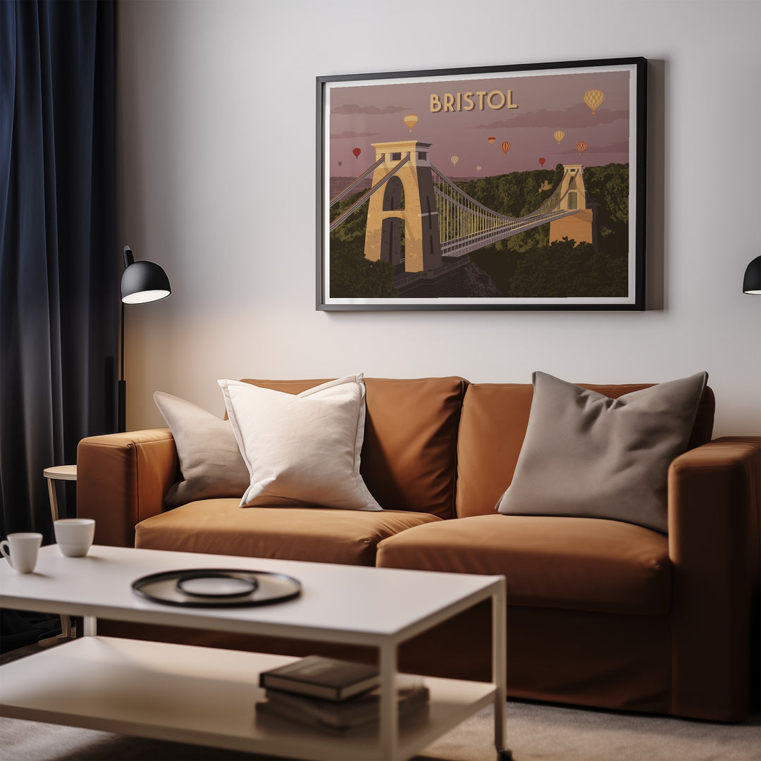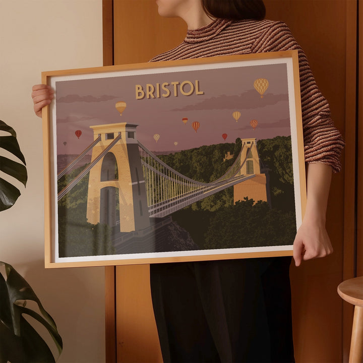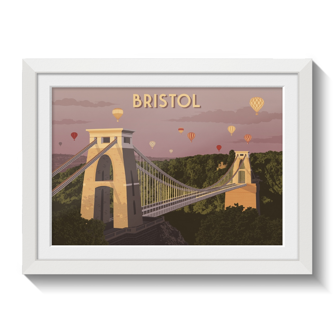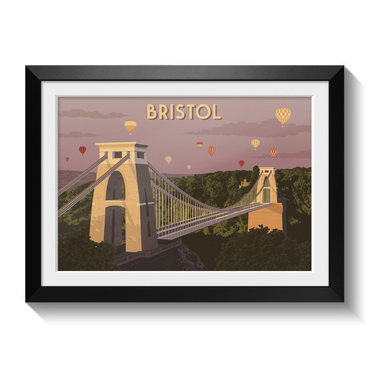 An original travel print featuring hot air balloons taking part in the annual Bristol International Balloon Fiesta Festival, over the iconic Clifton Suspension Bridge which spans the River Avon in Bristol, England.