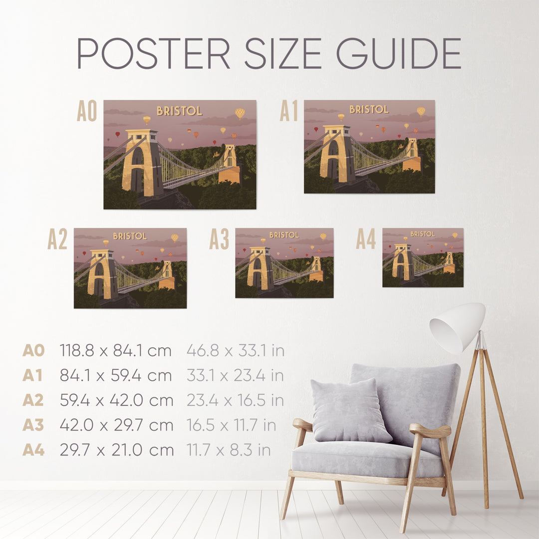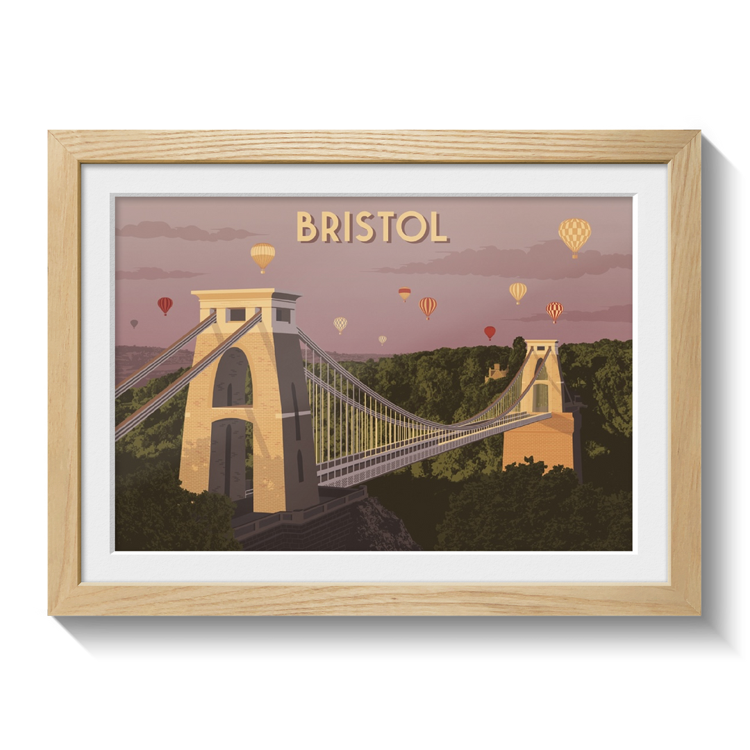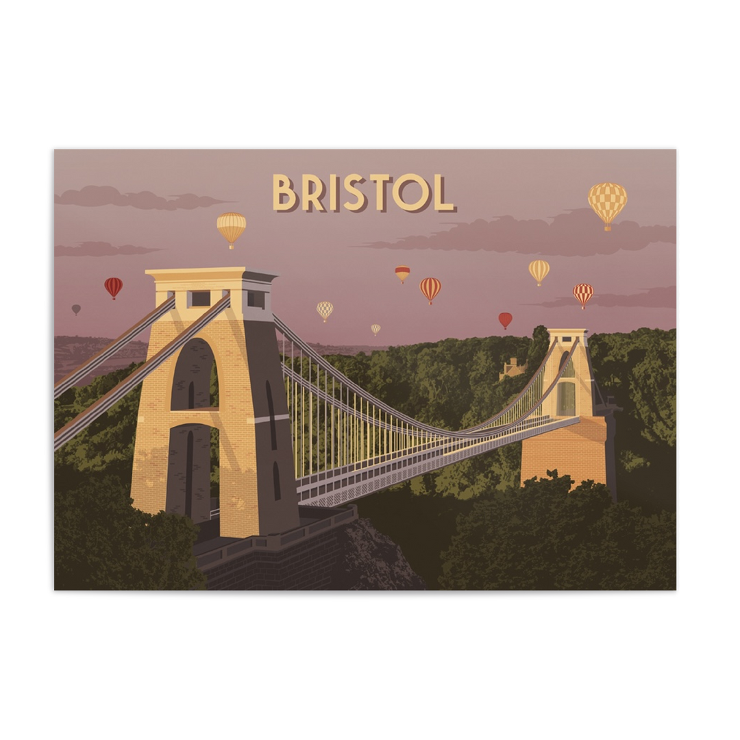An original travel print featuring hot air balloons taking part in the annual Bristol International Balloon Fiesta Festival, over the iconic Clifton Suspension Bridge which spans the River Avon in Bristol, England.