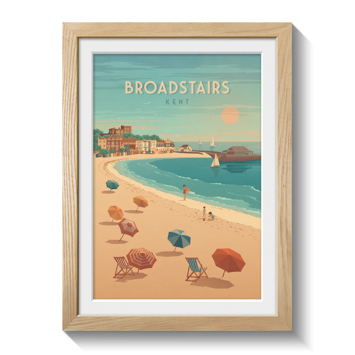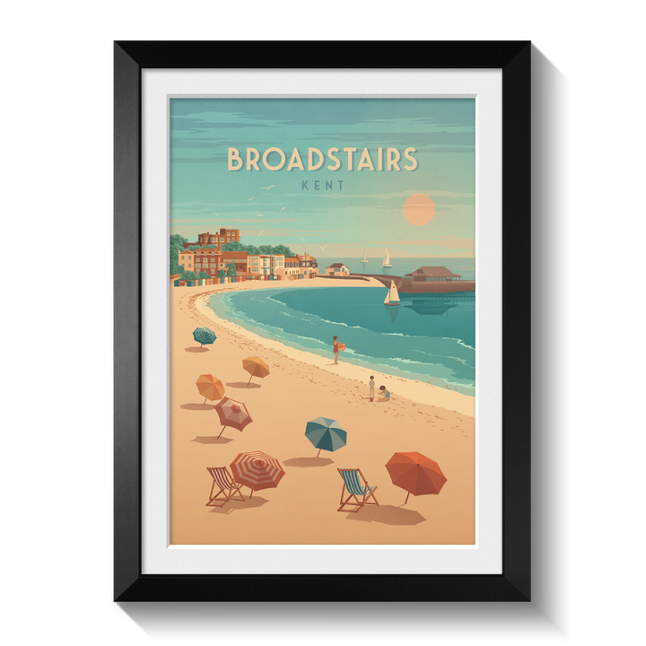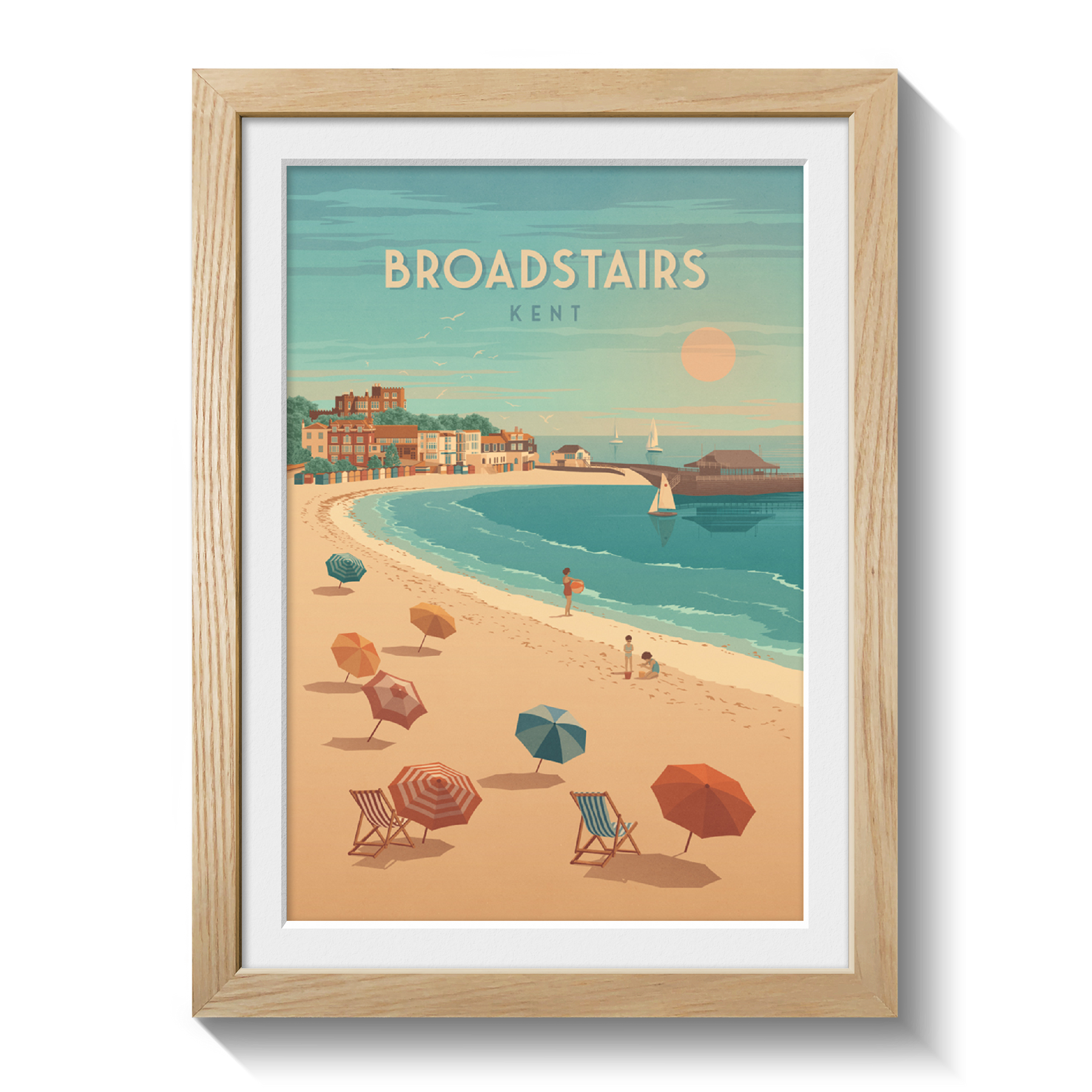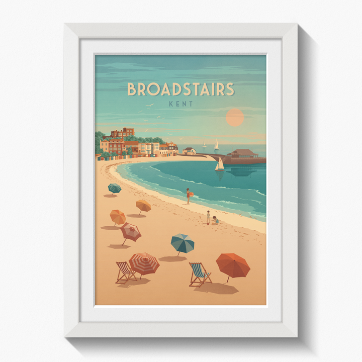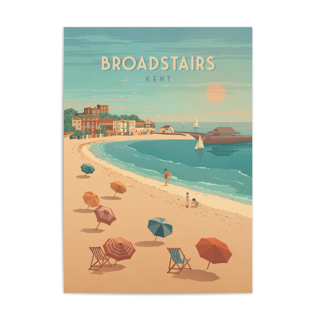 An original travel poster of Broadstairs in Thanet, Kent. The print features the iconic view of Viking Bay. Broadstairs is a much loved English seaside town and was a much loved holiday destination of Charles Dickens.