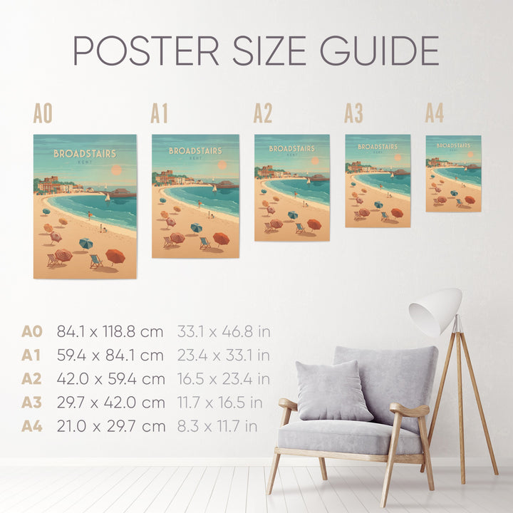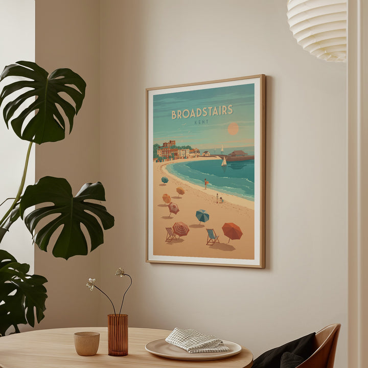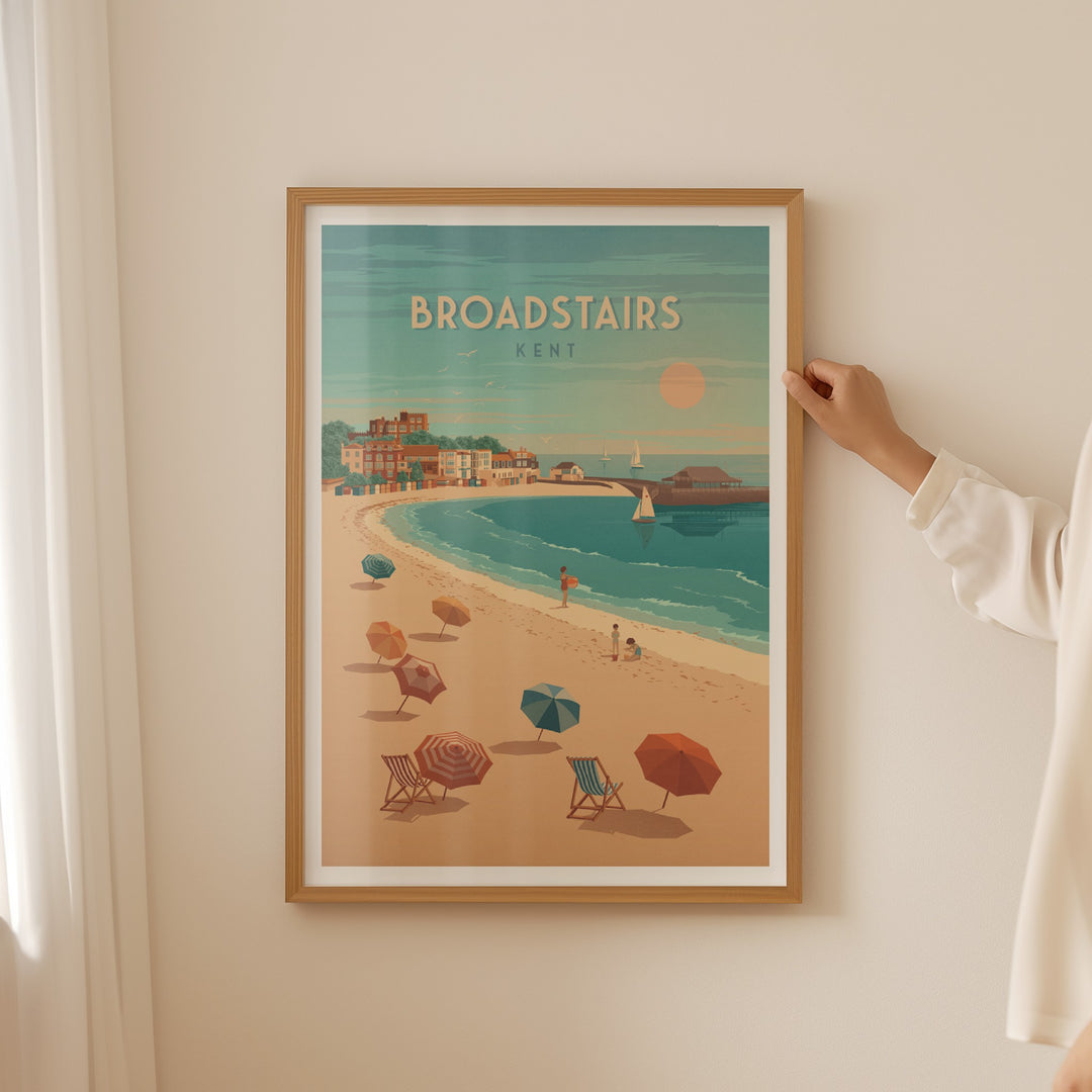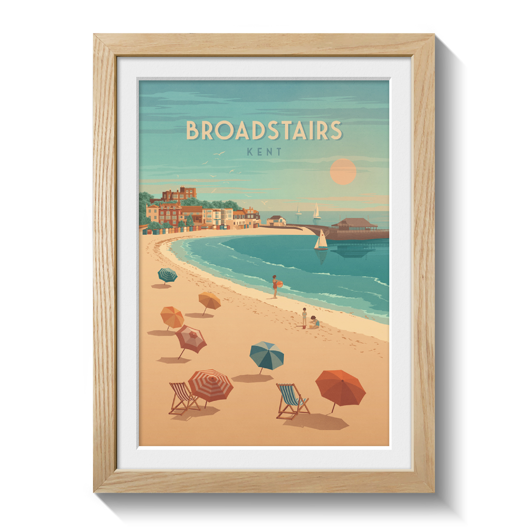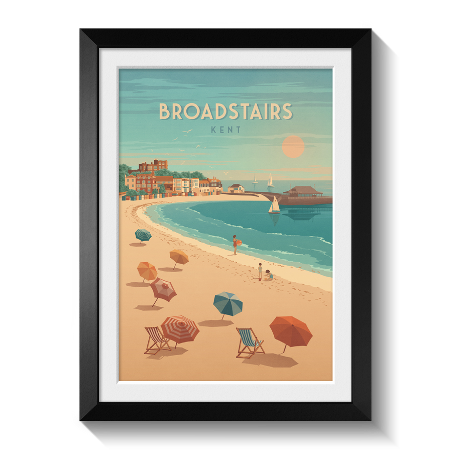 An original travel poster of Broadstairs in Thanet, Kent. The print features the iconic view of Viking Bay. Broadstairs is a much loved English seaside town and was a much loved holiday destination of Charles Dickens.