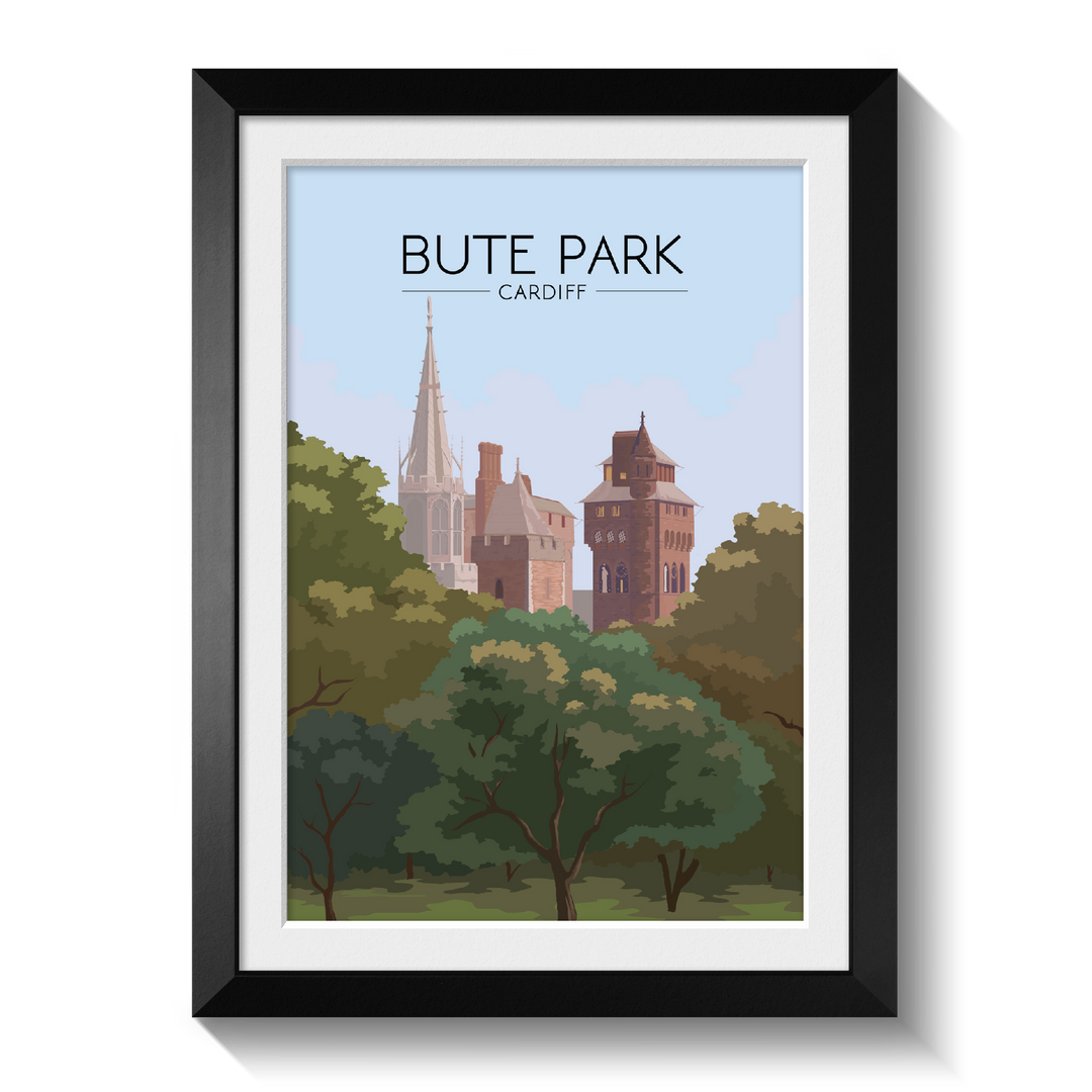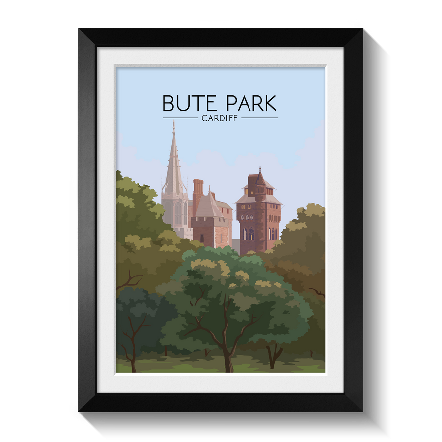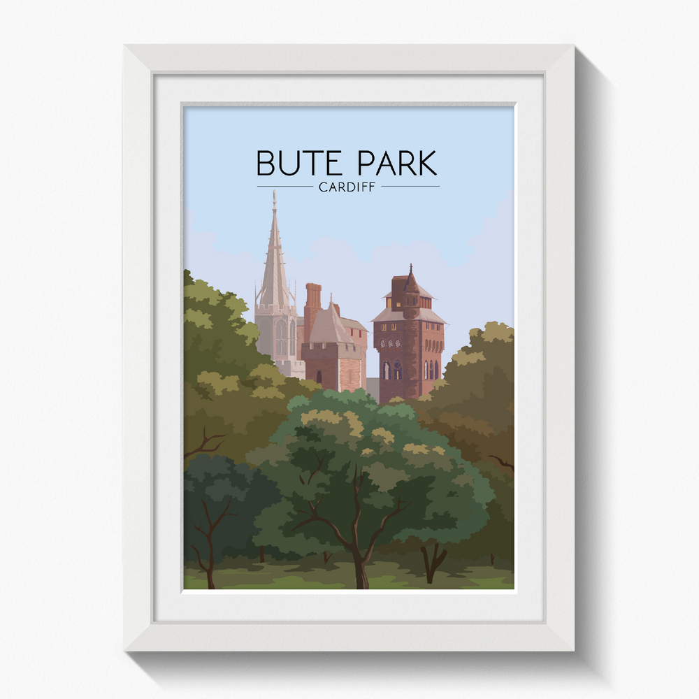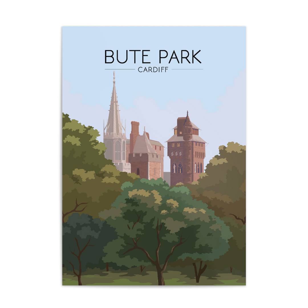 Original travel poster featuring Bute Park and the majestic Cardiff Castle just a short walk from the city’s main high streets. Bute Park is the green heart of the city where you can explore a superb tree collection and a wealth of horticulture and wildlife.