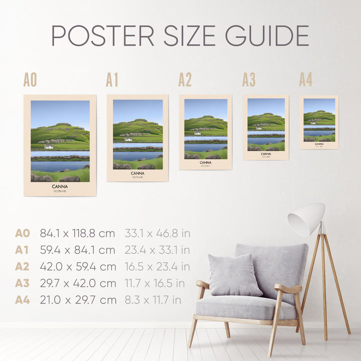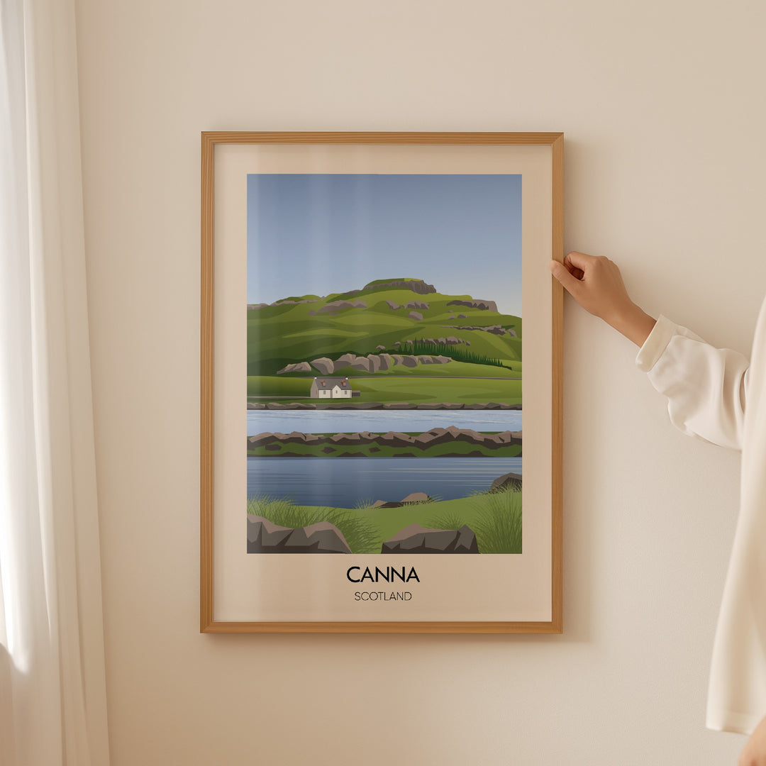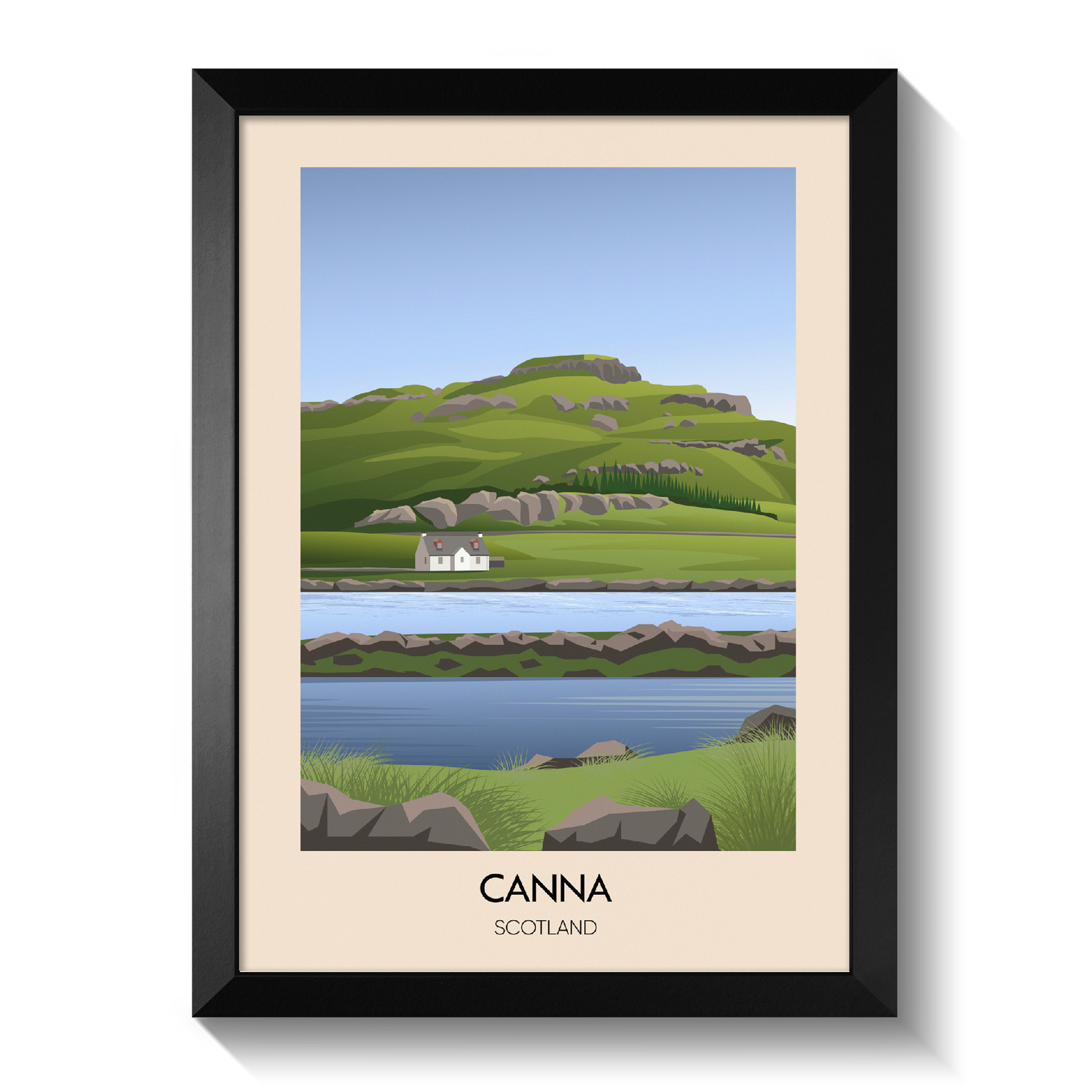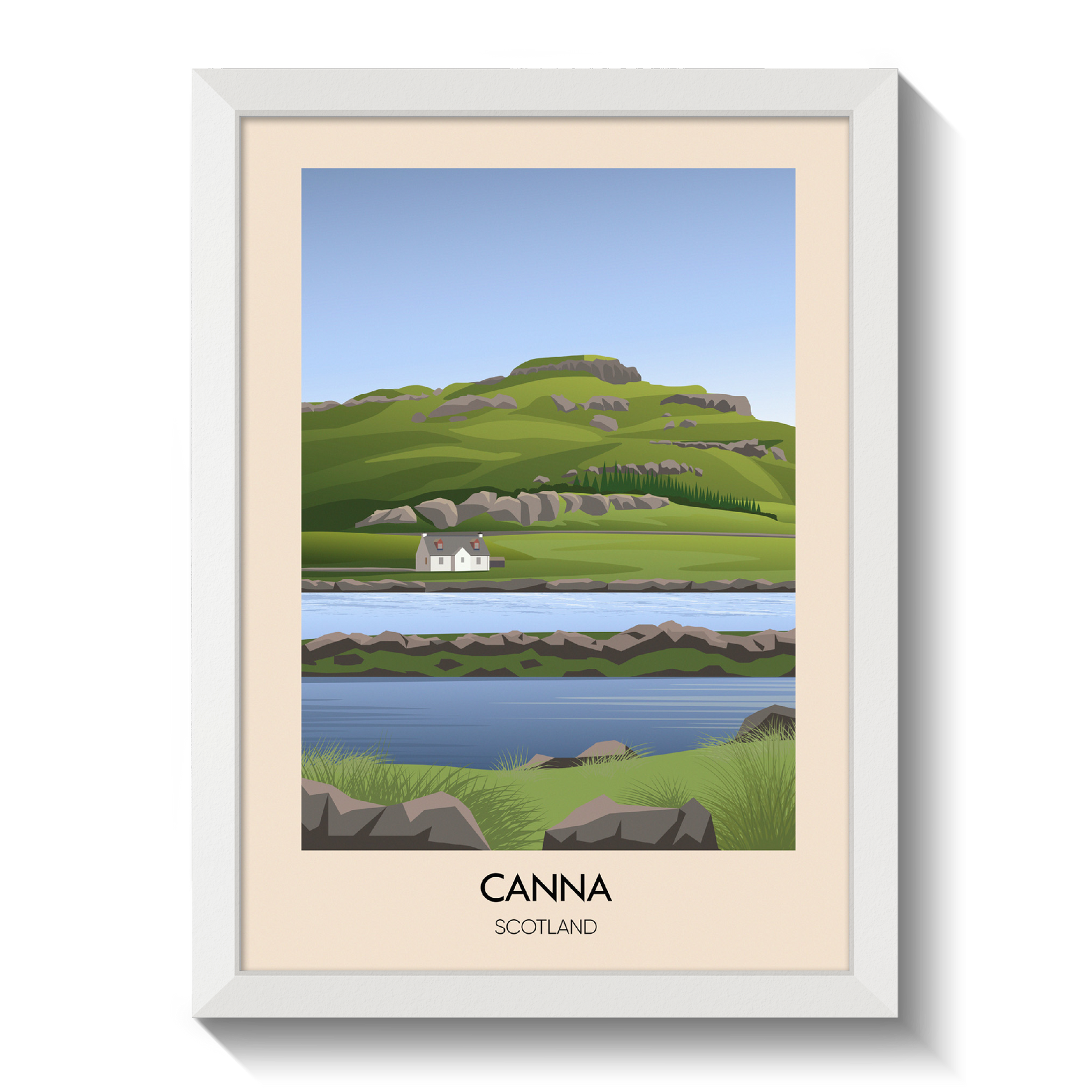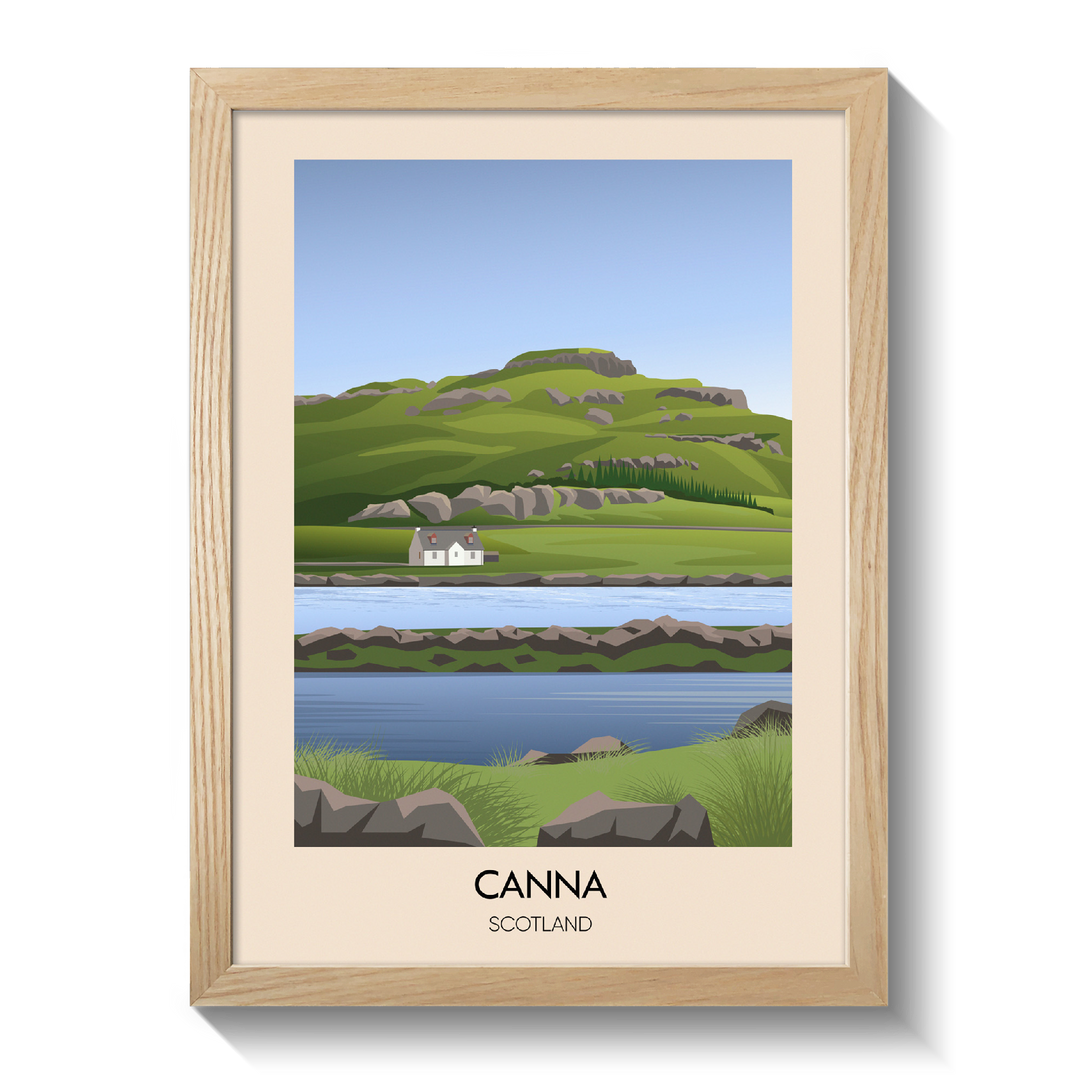This original print features the tiny island of Canna, the westernmost of the Small Isles off the west coast of Scotland. It's joined by a road to the smaller island of Sanday, and the channel between them dries out at low tide. Wear your hiking boots as there are no cars, and bring your binoculars to spy the wonderful birdlife.