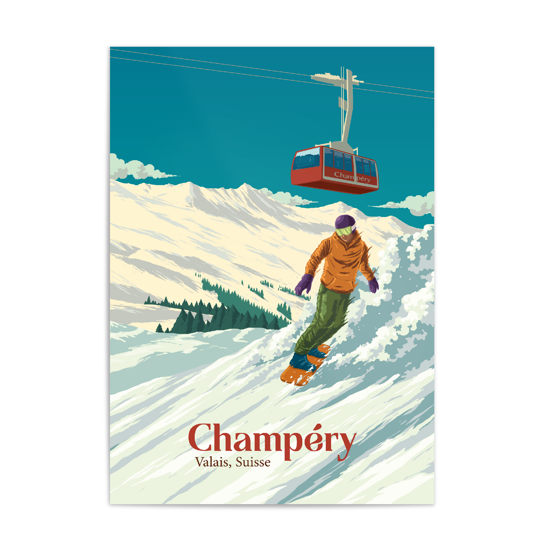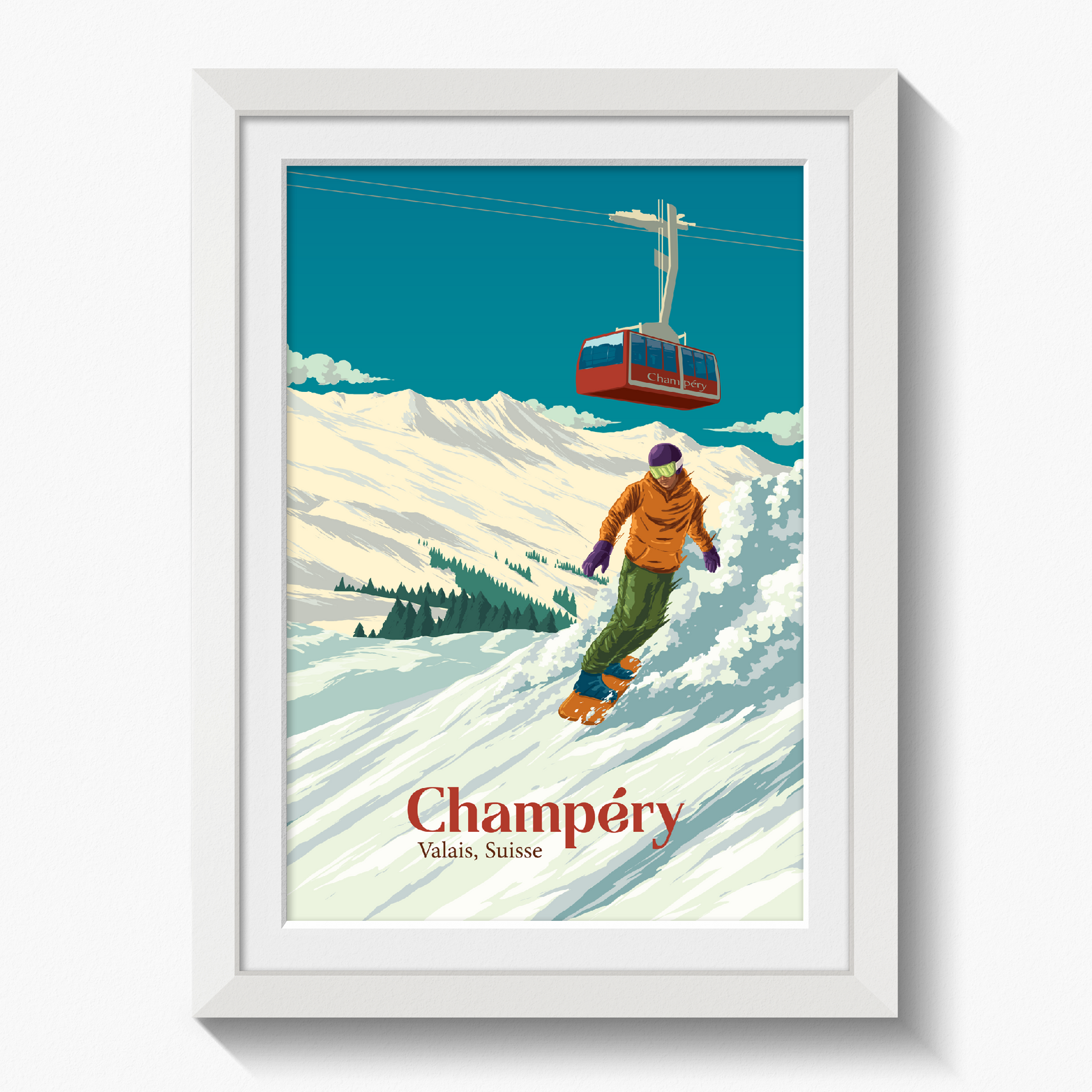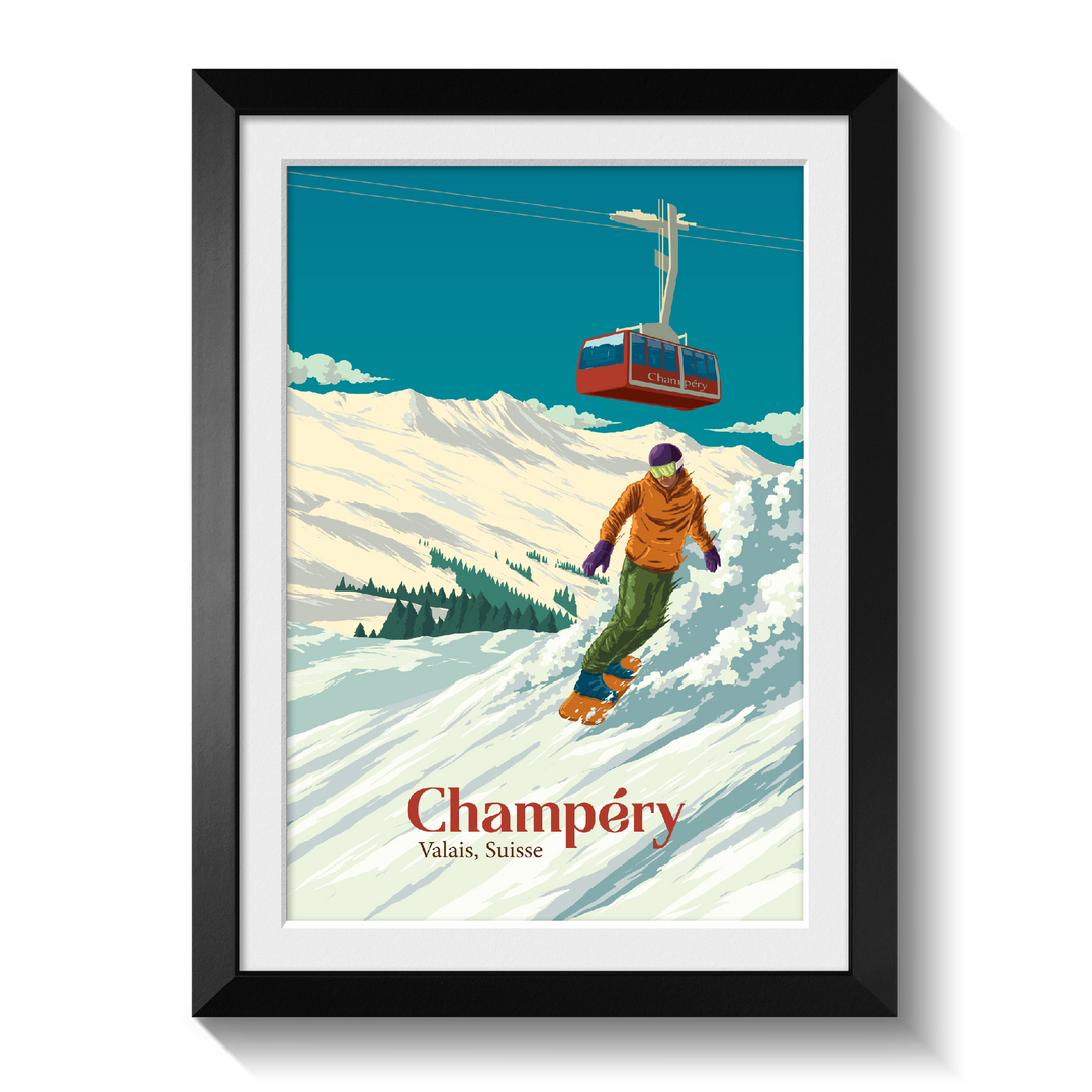 This is an original snowboard travel poster featuring the ski resort of Champery on the Swiss side of the Portes du Soleil area of the Alps.