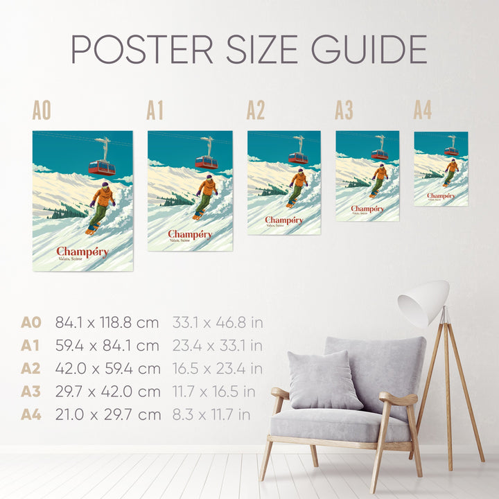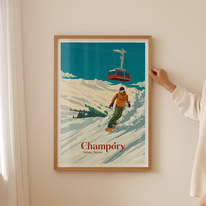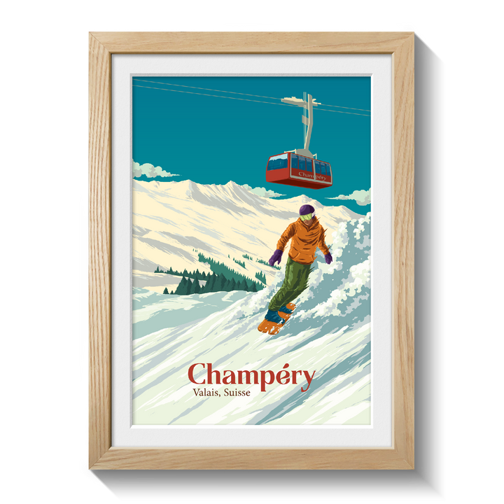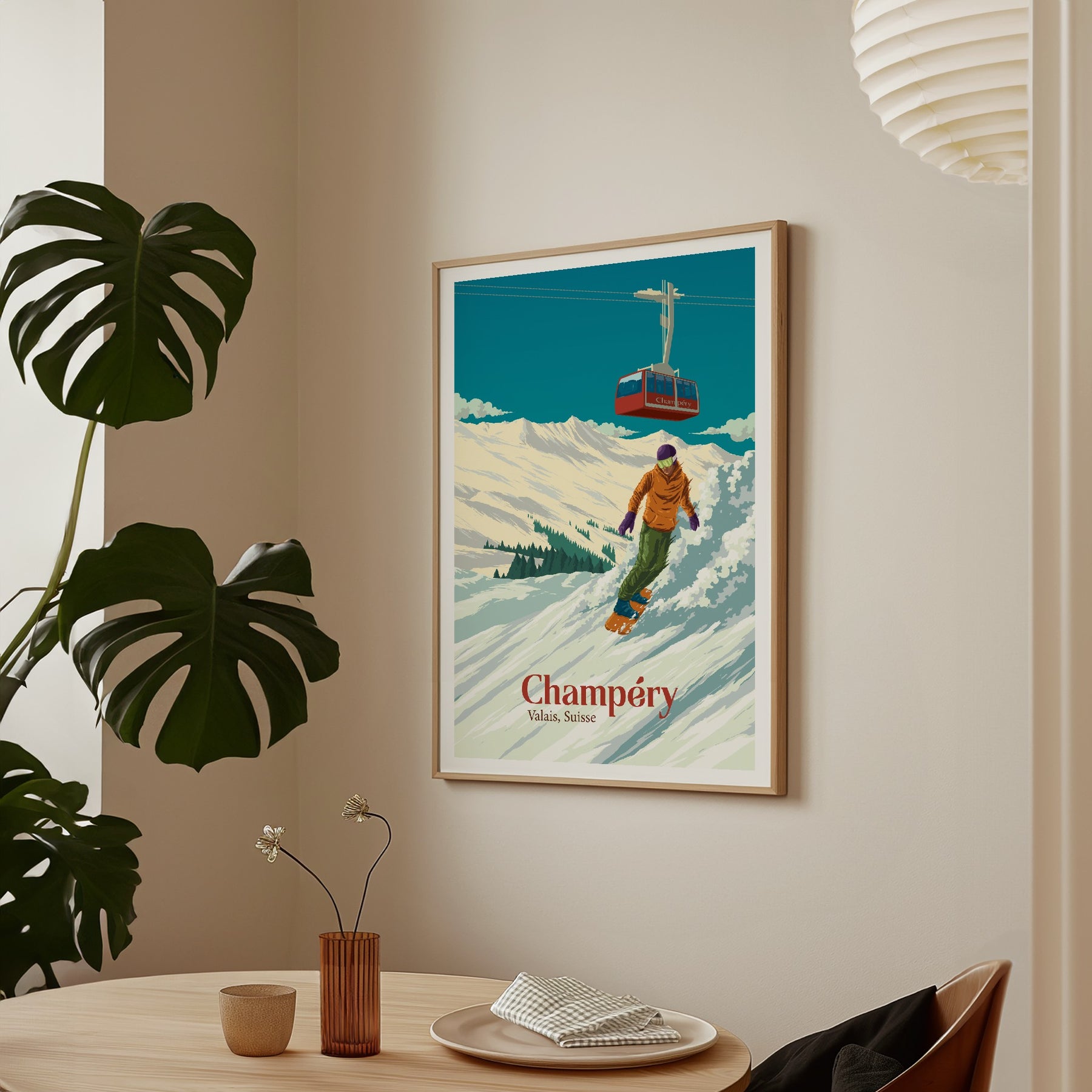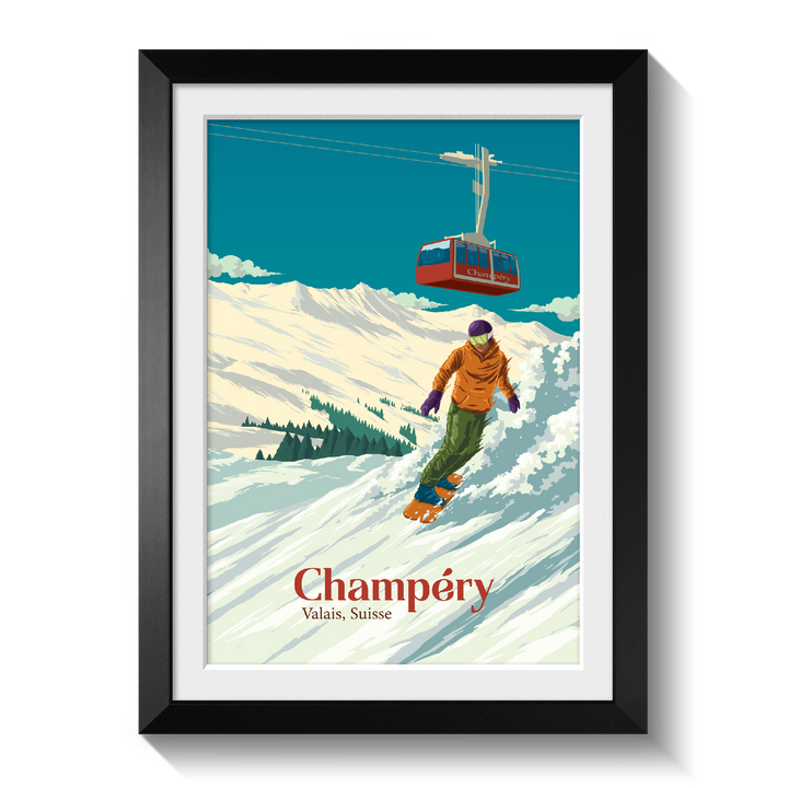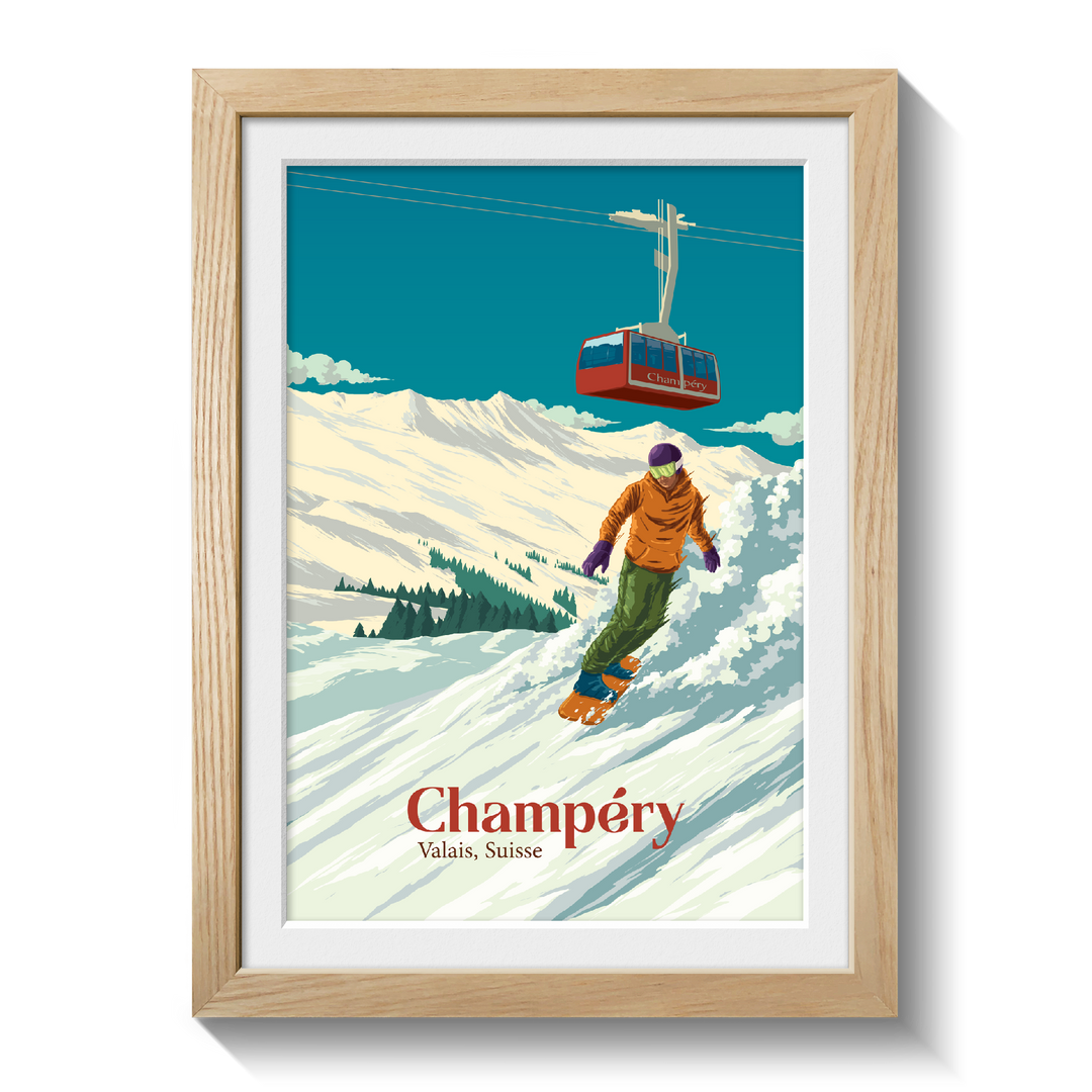 This is an original snowboard travel poster featuring the ski resort of Champery on the Swiss side of the Portes du Soleil area of the Alps.