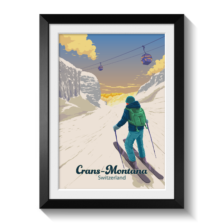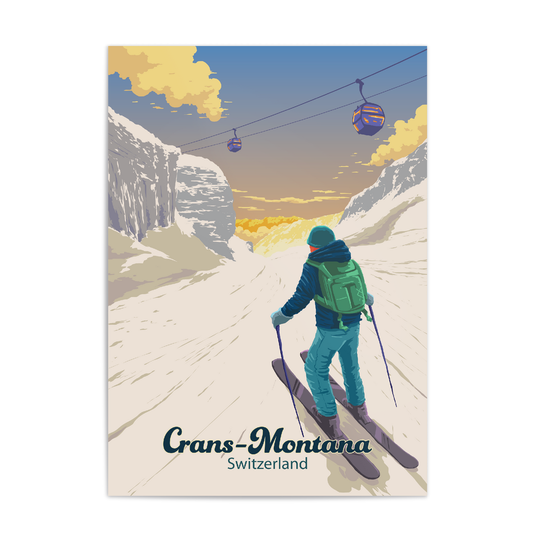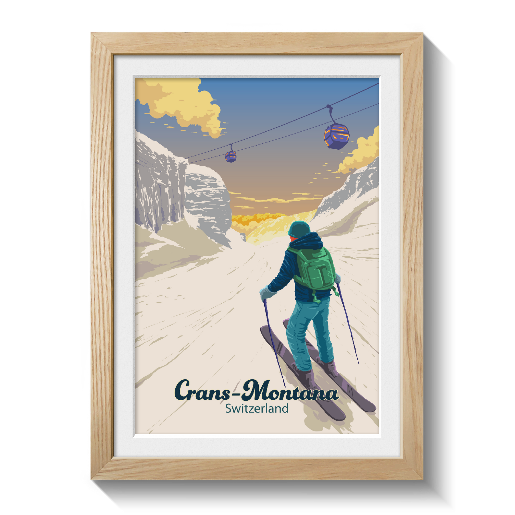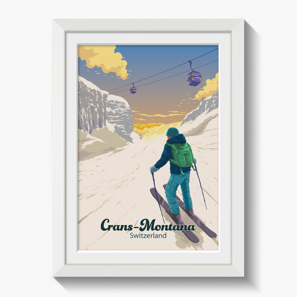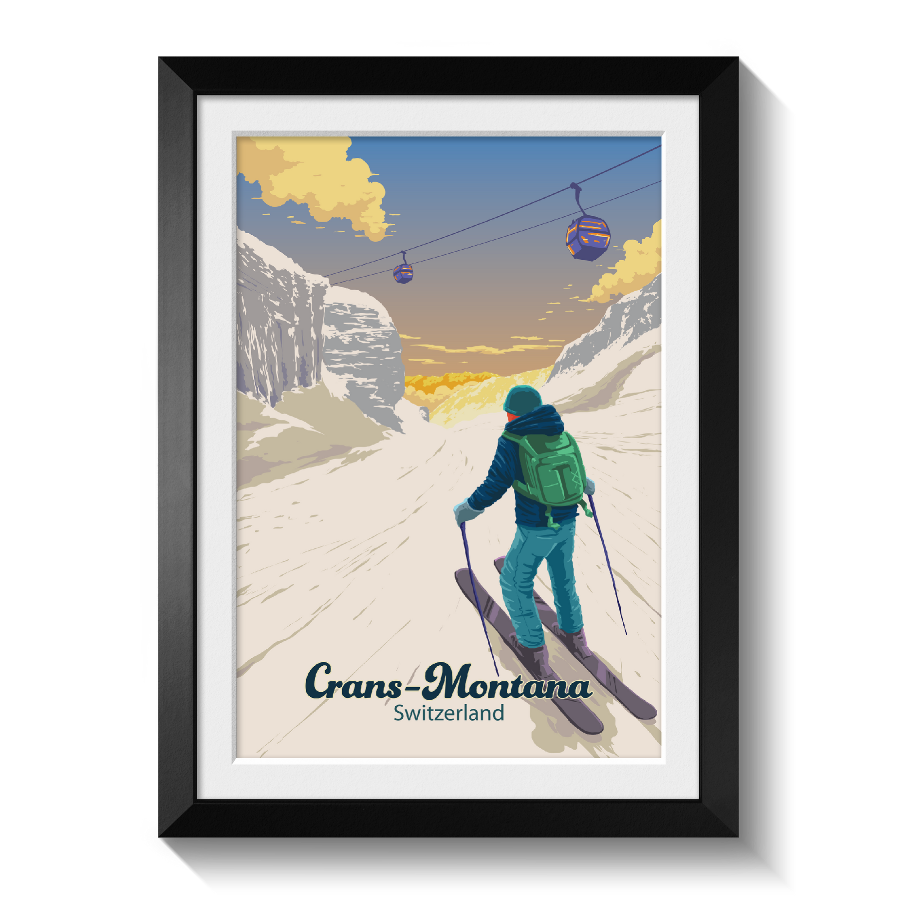 This is an original travel poster featuring the Swiss ski resort of Crans Montana in the Valais area of the Swiss Alps.