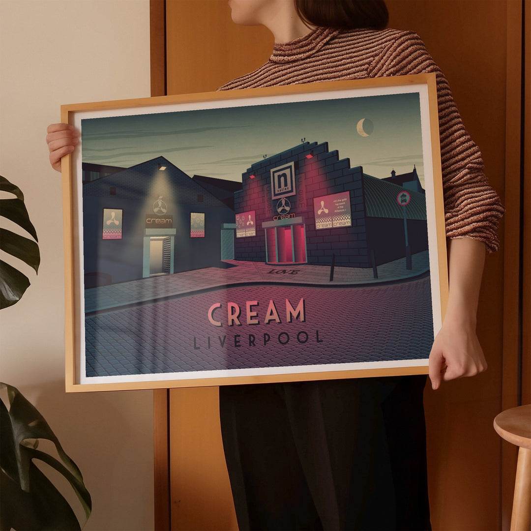 An original travel poster featuring one of Liverpool's most famous nightclubs, Cream. Cream also hosts one of the worlds largest electronic music festivals called Creamfields in Daresbury Estate Cheshire.