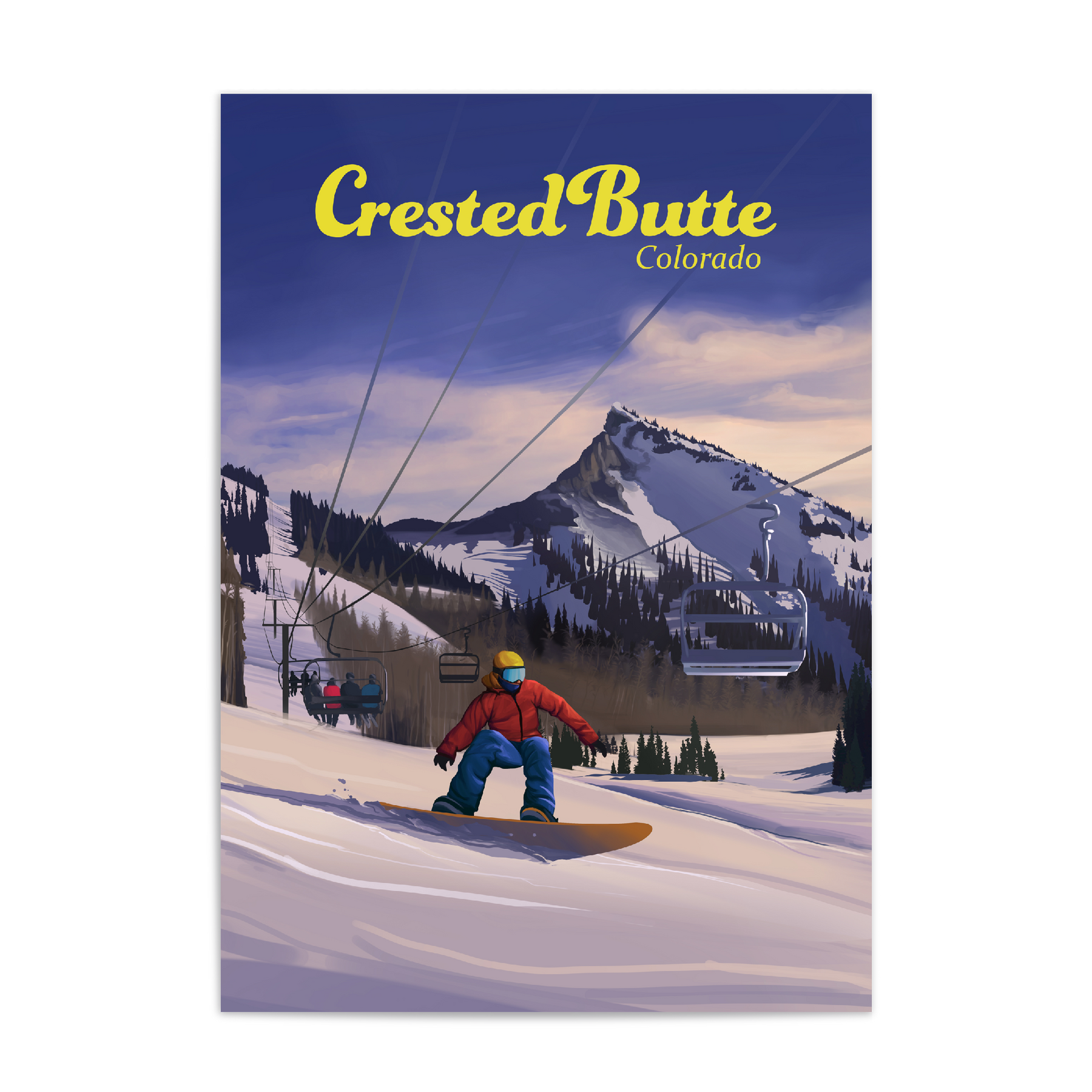 Crested Butte, Colorado ski resort travel poster, snowboarding version.