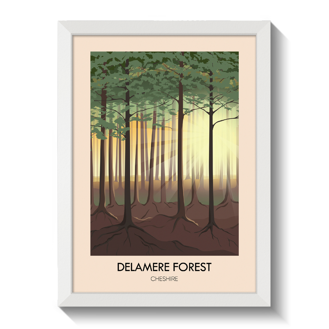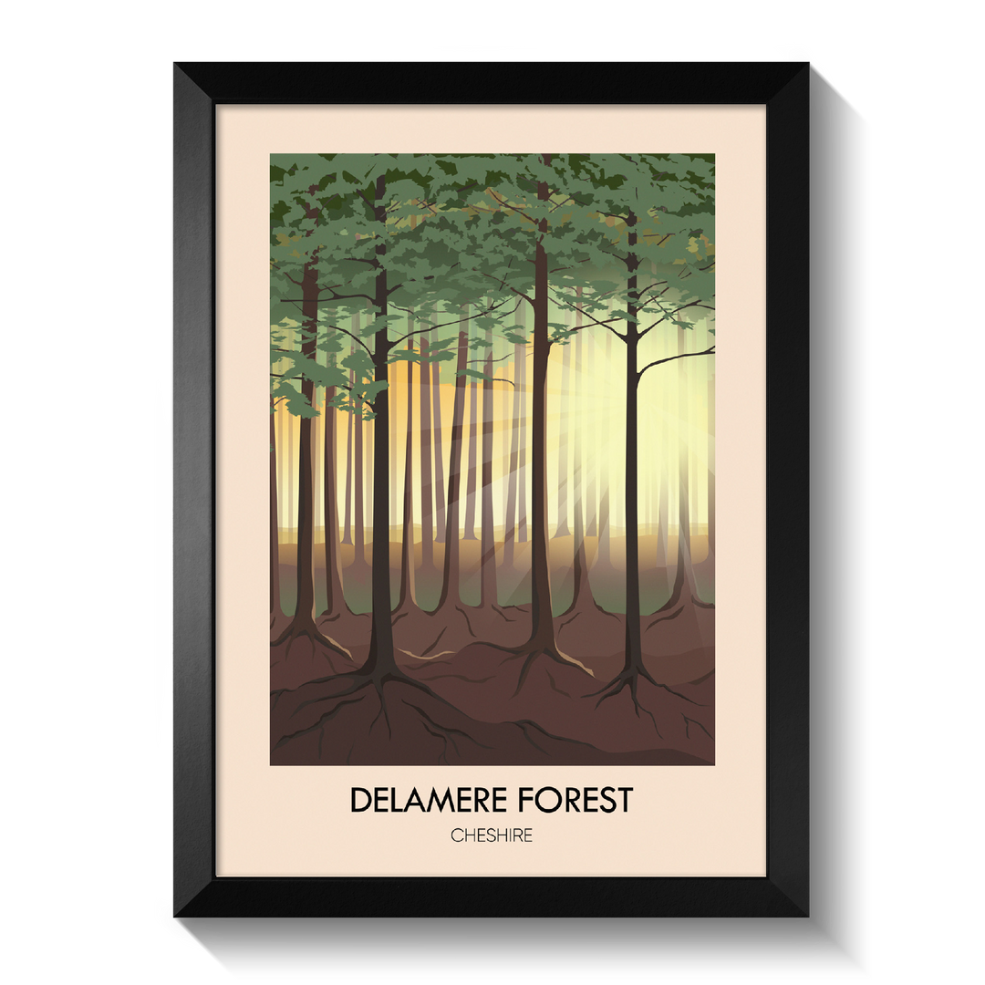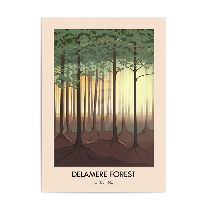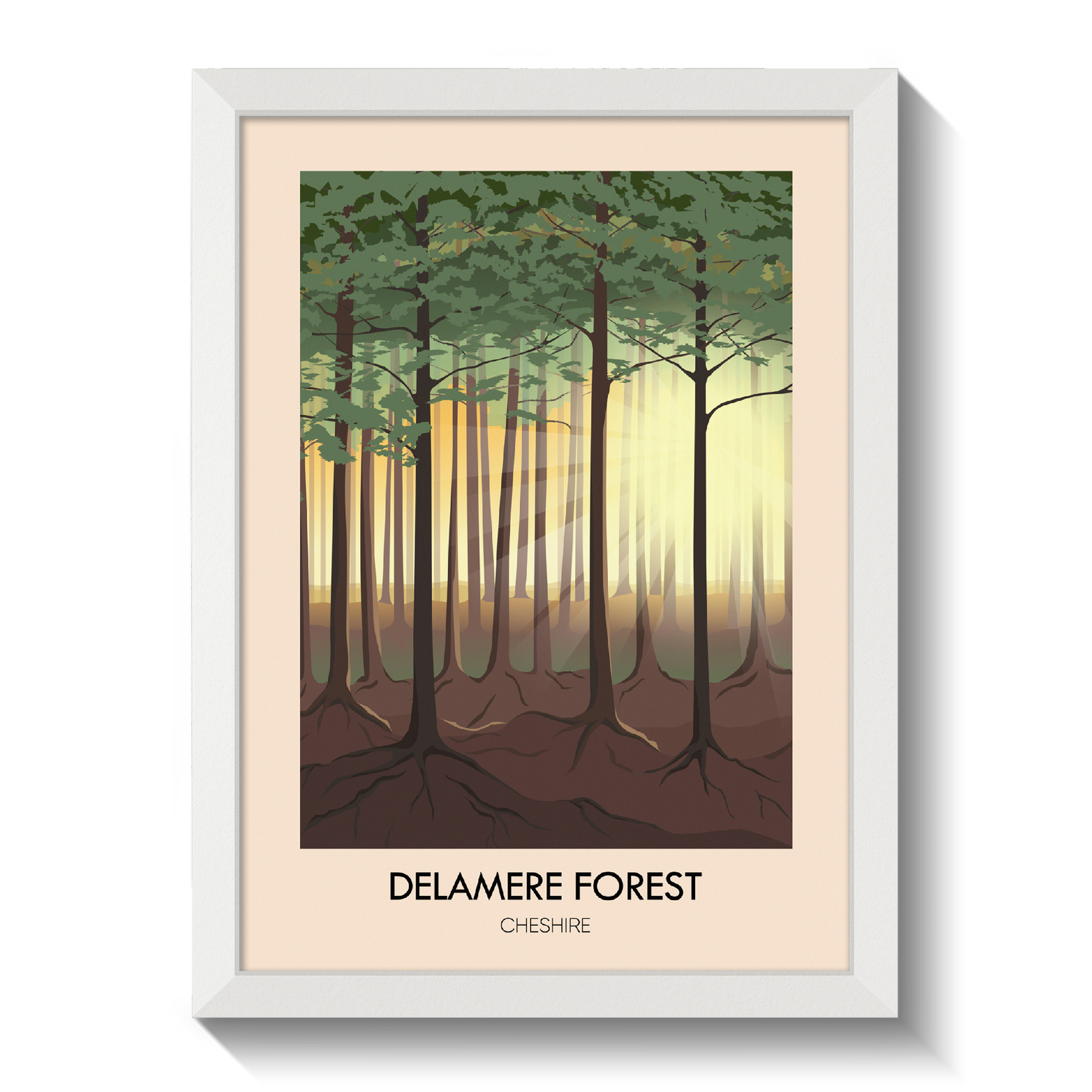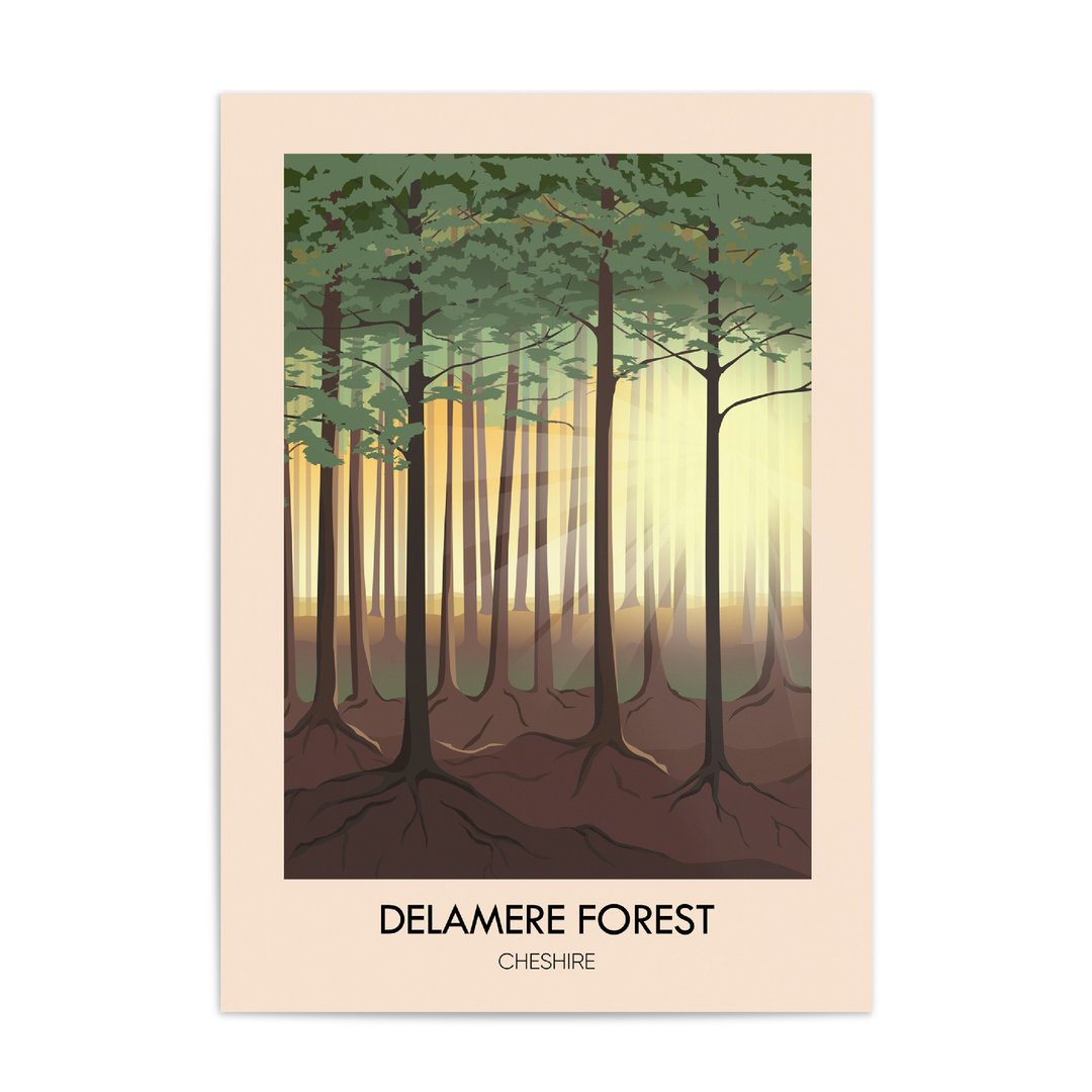 An original travel poster featuring Delamere forest, the largest wooded area in Cheshire situated only a 15 minute drive from Chester. Delamere forest is home to woodlands, sandstone paths and a lake called Blakemere Moss.