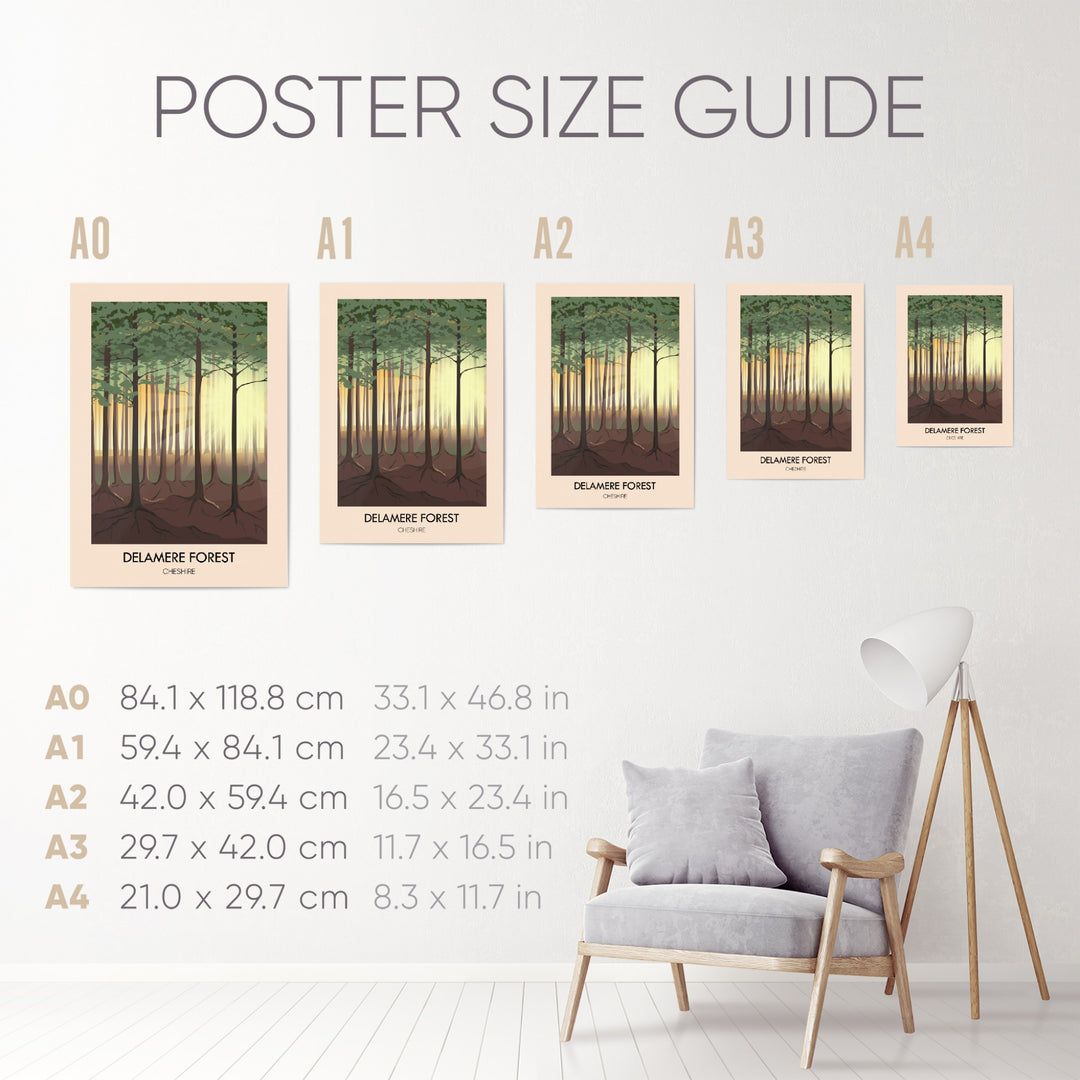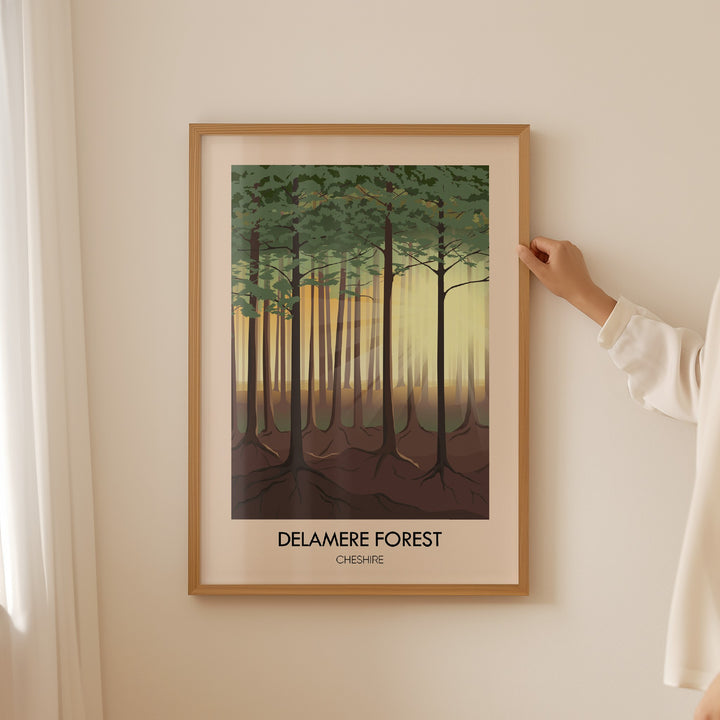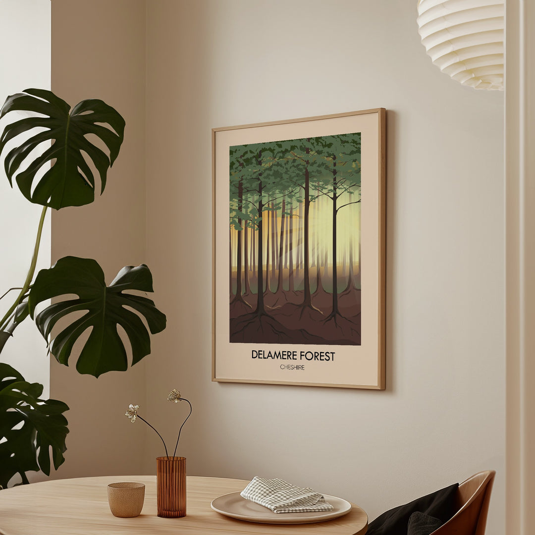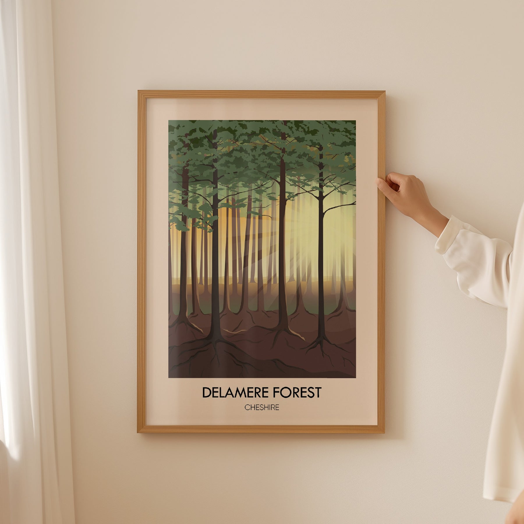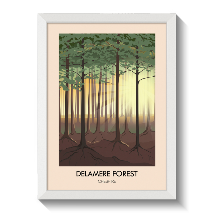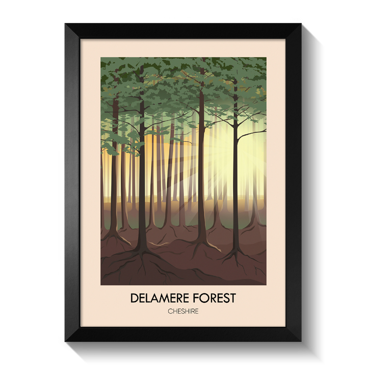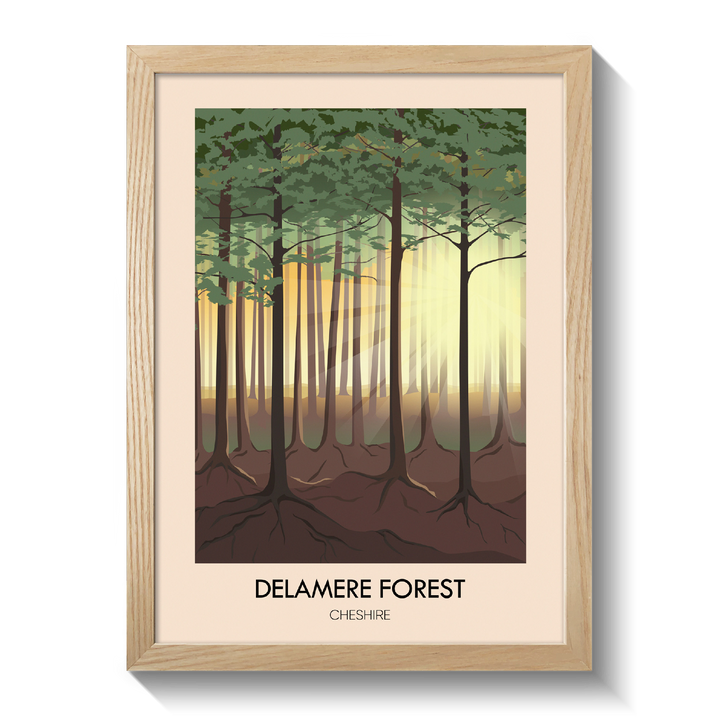 An original travel poster featuring Delamere forest, the largest wooded area in Cheshire situated only a 15 minute drive from Chester. Delamere forest is home to woodlands, sandstone paths and a lake called Blakemere Moss.