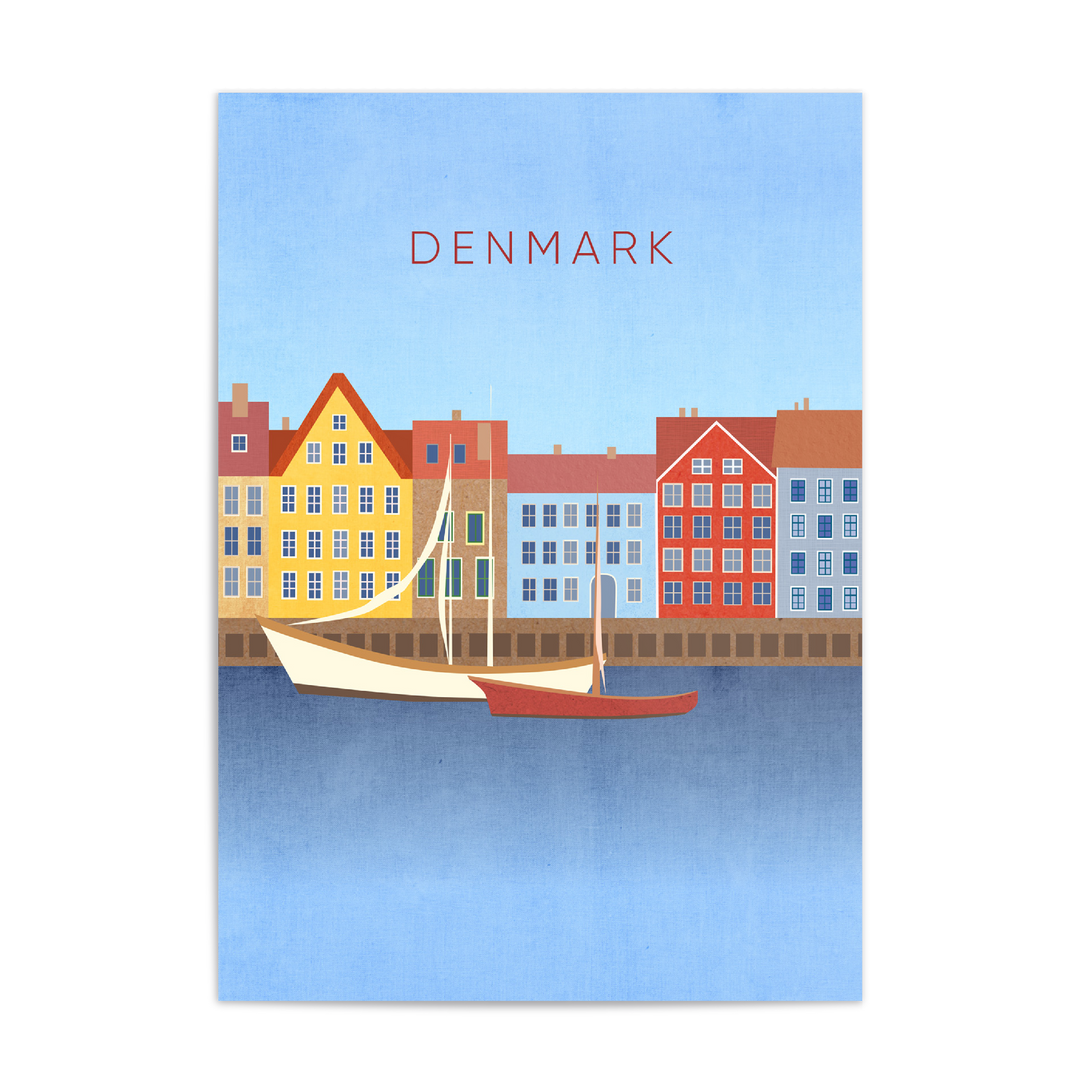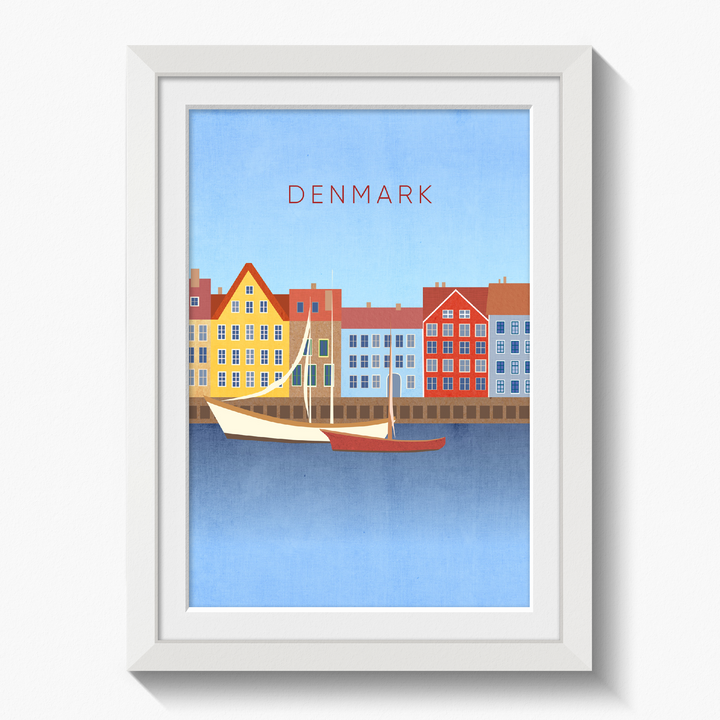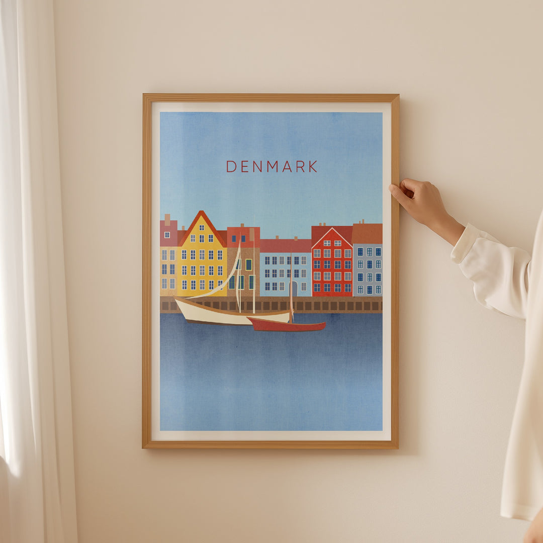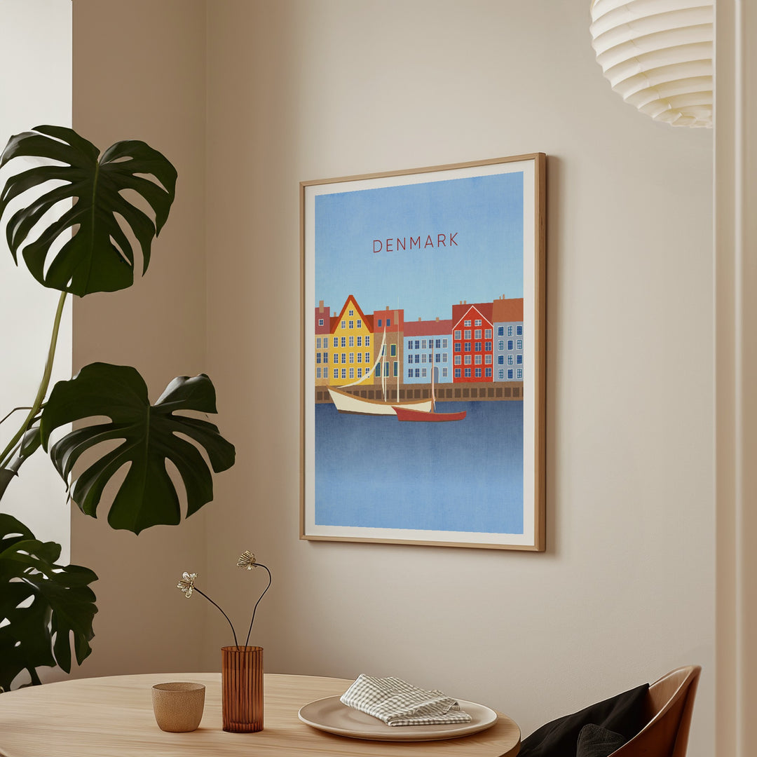 Original travel poster for Denmark, a Nordic country in Northern Europe. In the poster you can see the famous Nyhavn waterfront in the capital city of Copenhagen. Denmark is known for its bike culture, design scene, architecture and being home to lots of Michelin Star restaurants.
