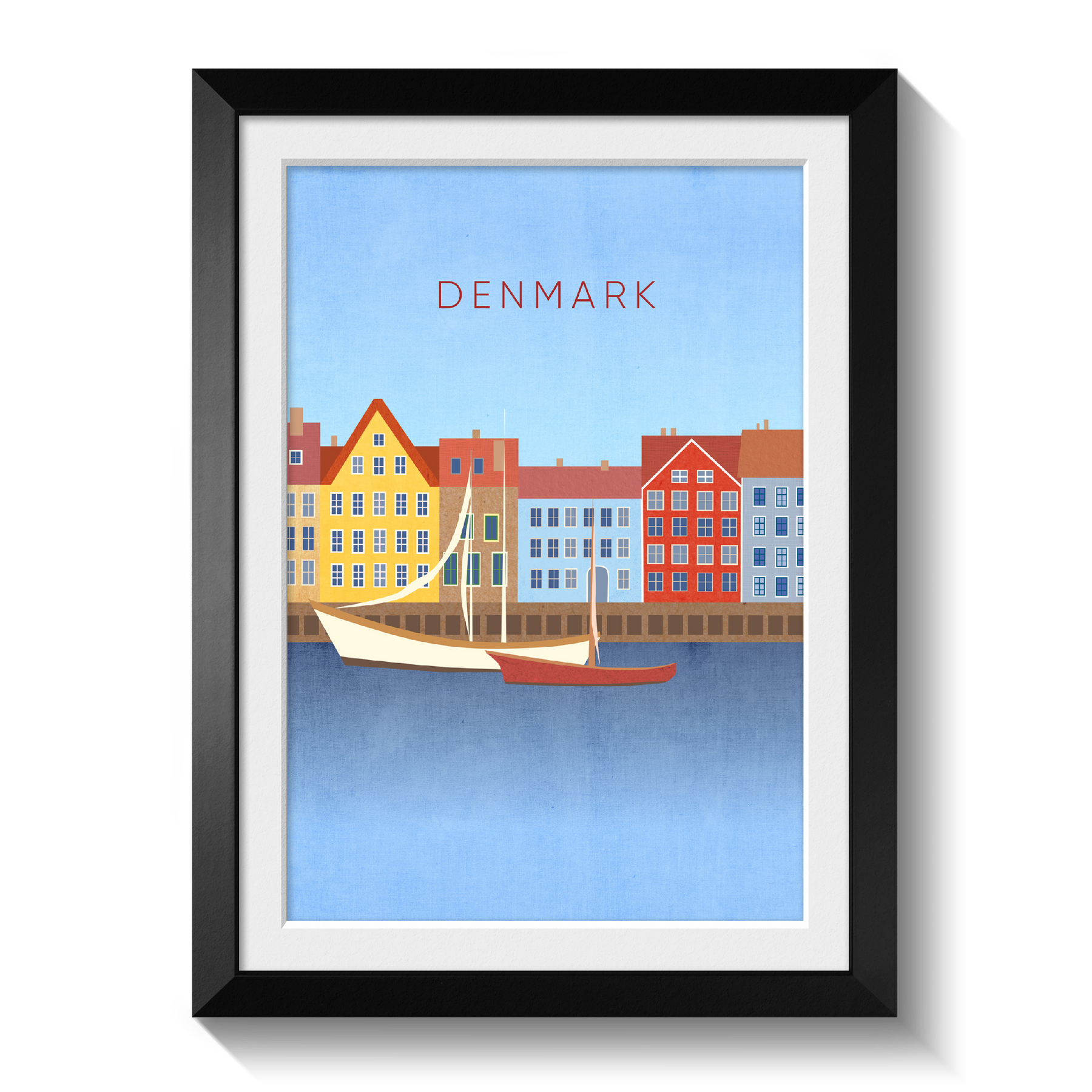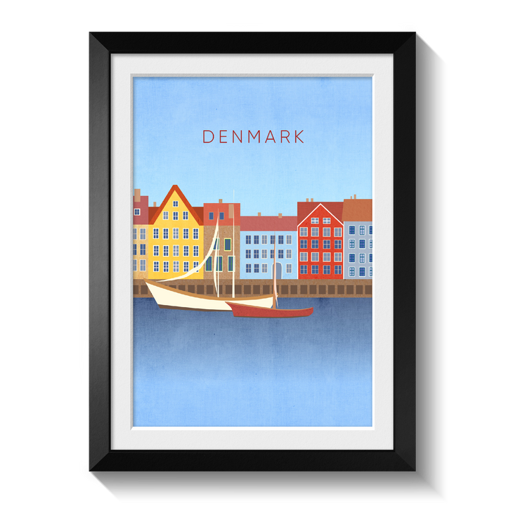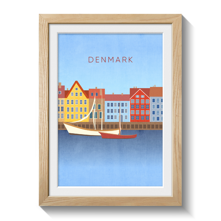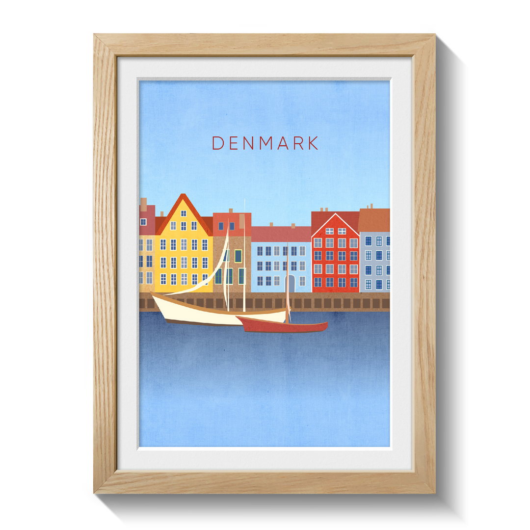 Original travel poster for Denmark, a Nordic country in Northern Europe. In the poster you can see the famous Nyhavn waterfront in the capital city of Copenhagen. Denmark is known for its bike culture, design scene, architecture and being home to lots of Michelin Star restaurants.