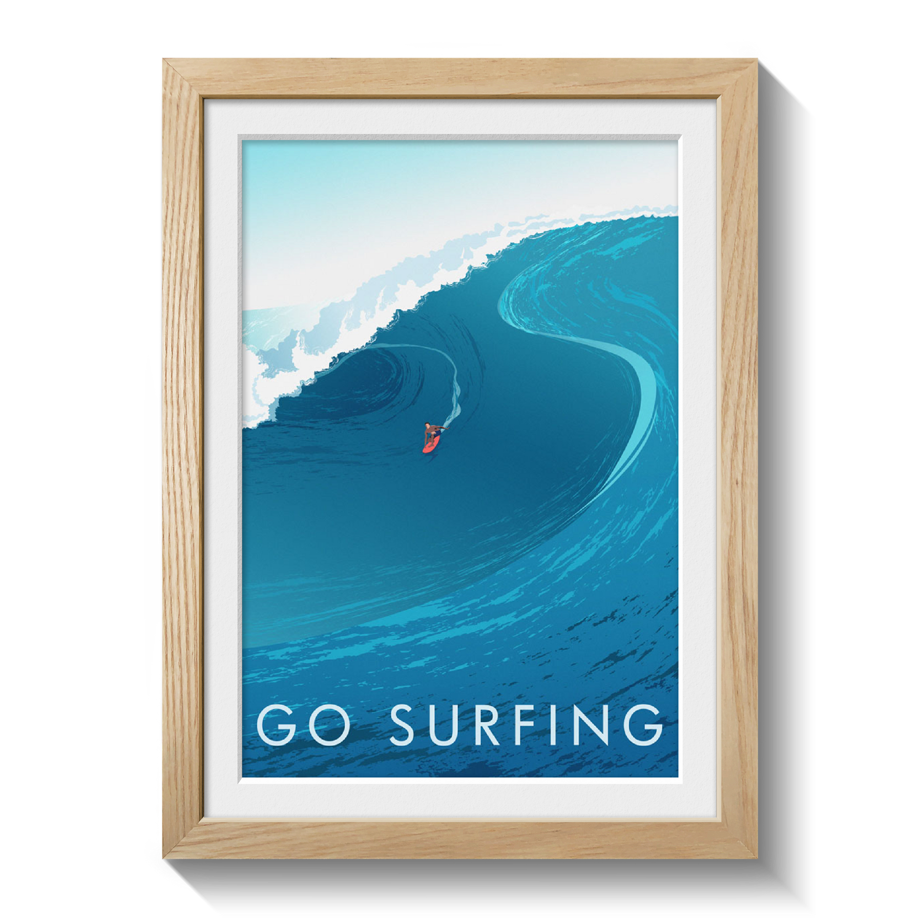 This is an original travel poster celebrating the ever popular ocean sport of Surfing. A perfect gift for the surfer in your life or a great way to celebrate your love of your favourite adventure sport. Gnarly dude.