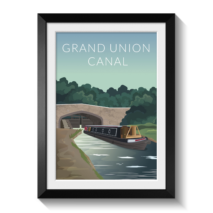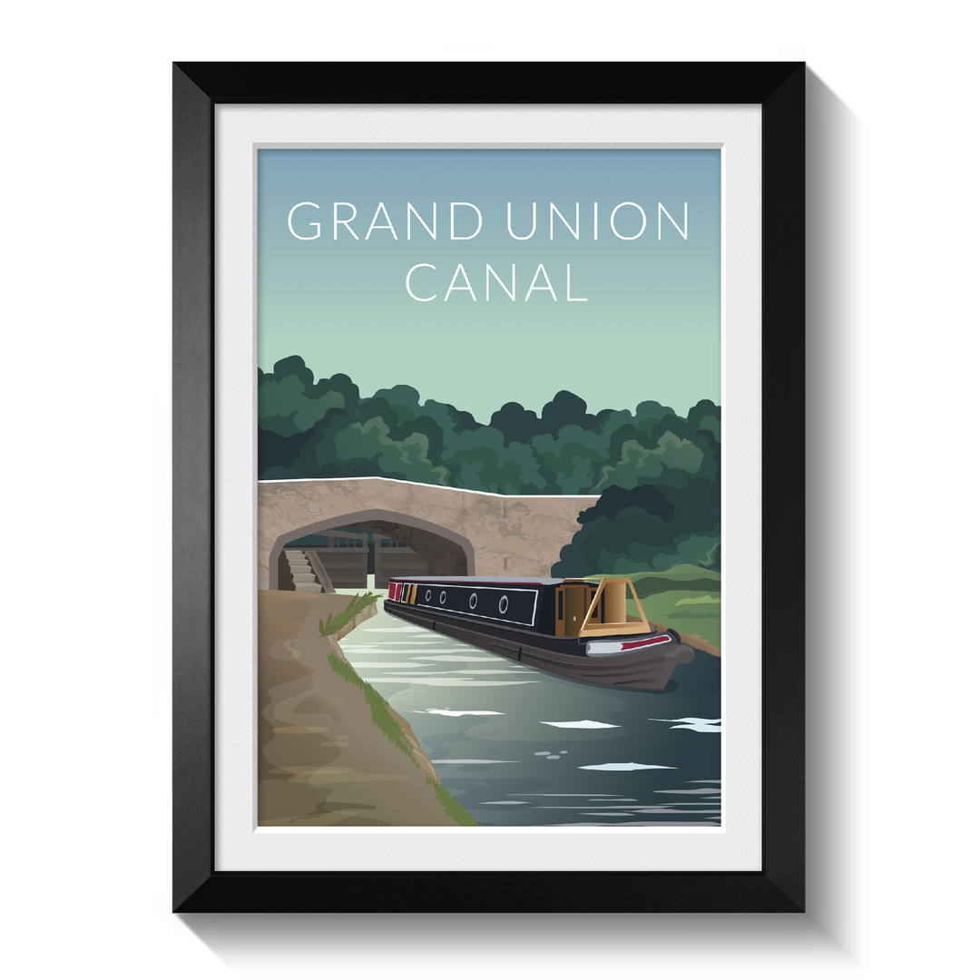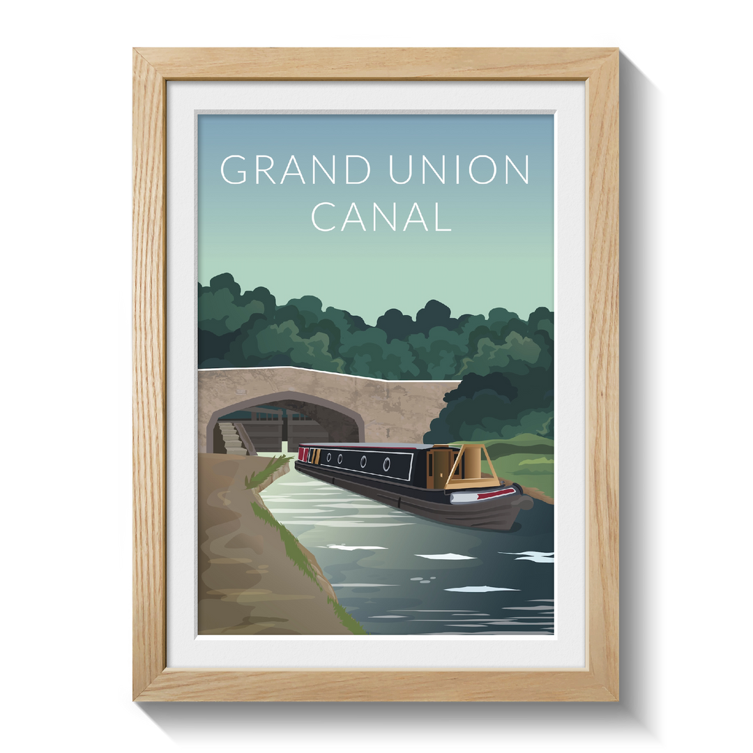 This Grand Union Canal travel poster features a traditional scene with a modern twist. A narrowboat passes underneath a bridge on the beautiful Grand Union Canal.