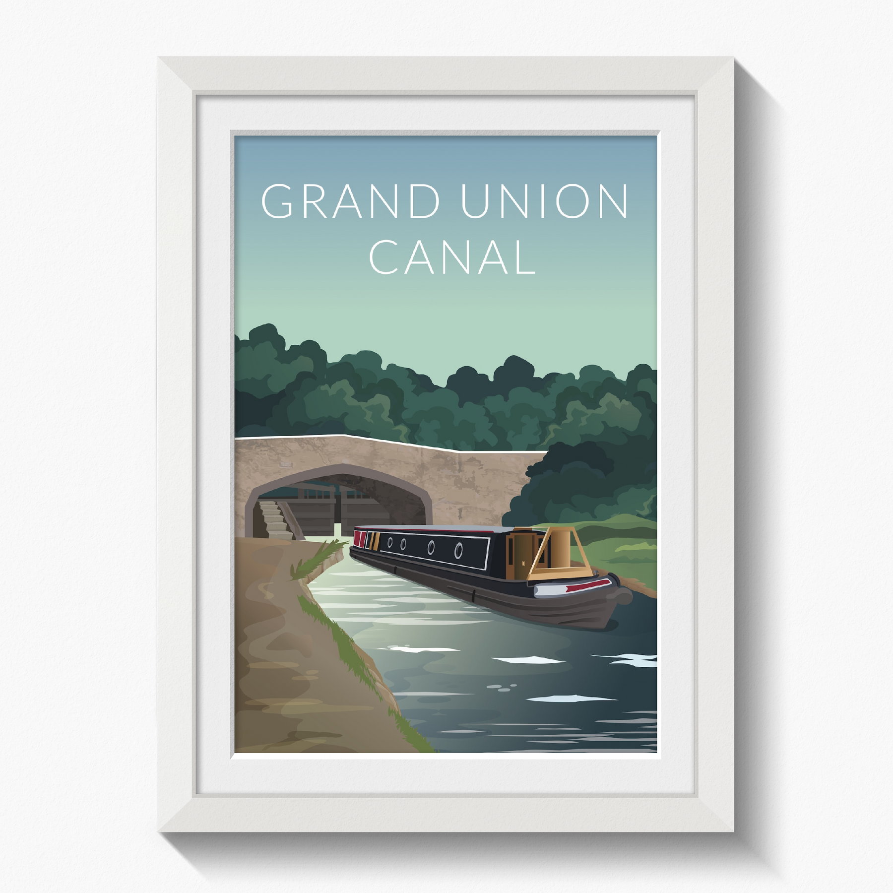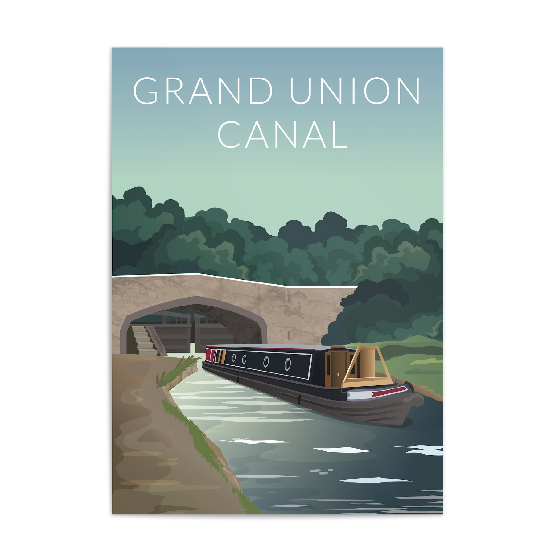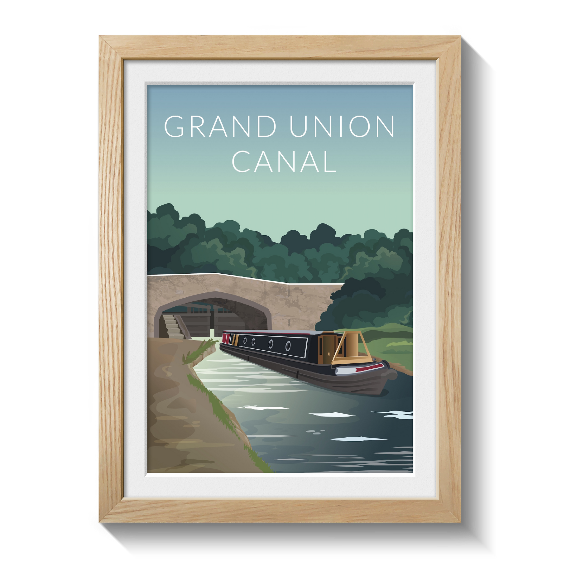 This Grand Union Canal travel poster features a traditional scene with a modern twist. A narrowboat passes underneath a bridge on the beautiful Grand Union Canal.