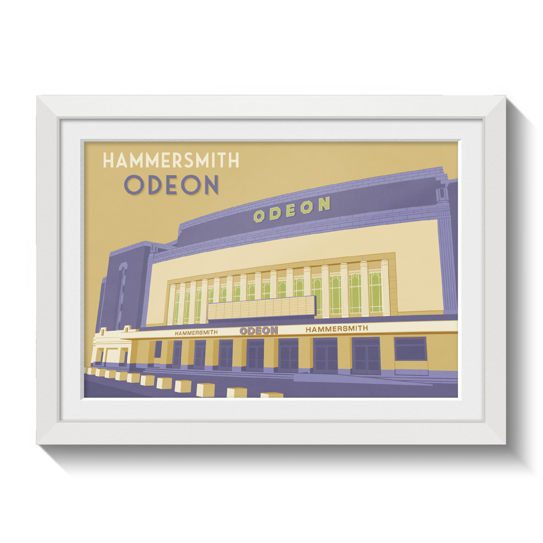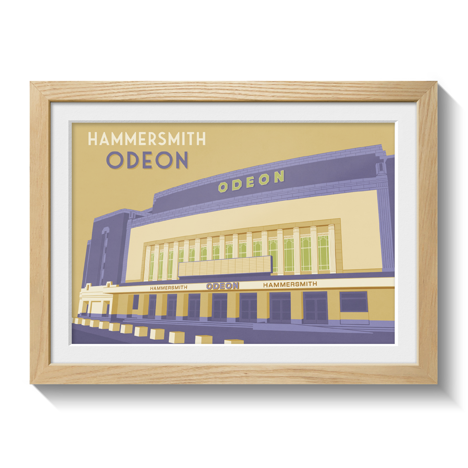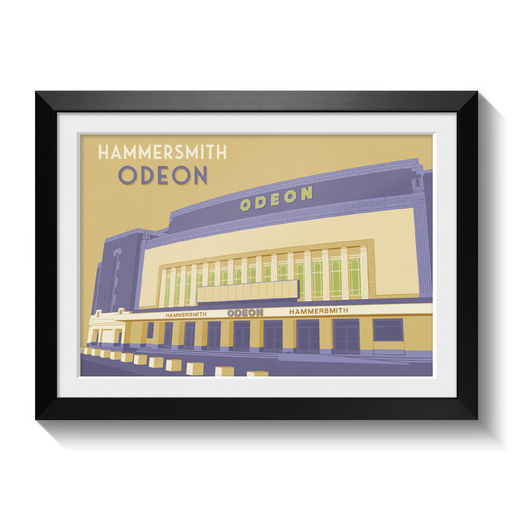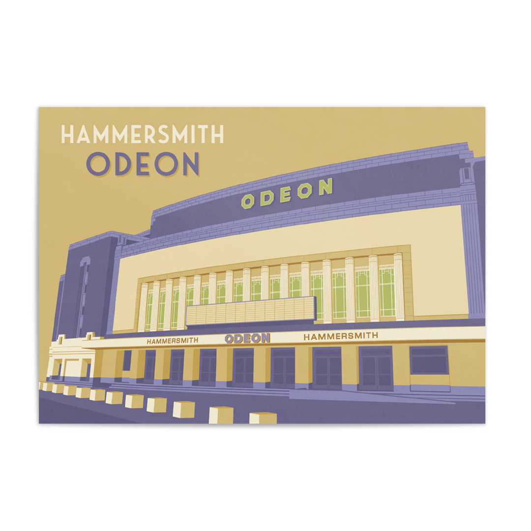 An original travel poster featuring the iconic art deco music venue, the Hammersmith Odeon (now known as the Hammersmith Apollo) in West London, home to the famous Live at the Apollo comedy nights.