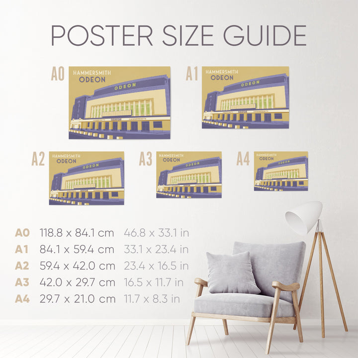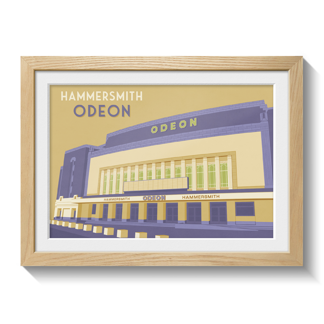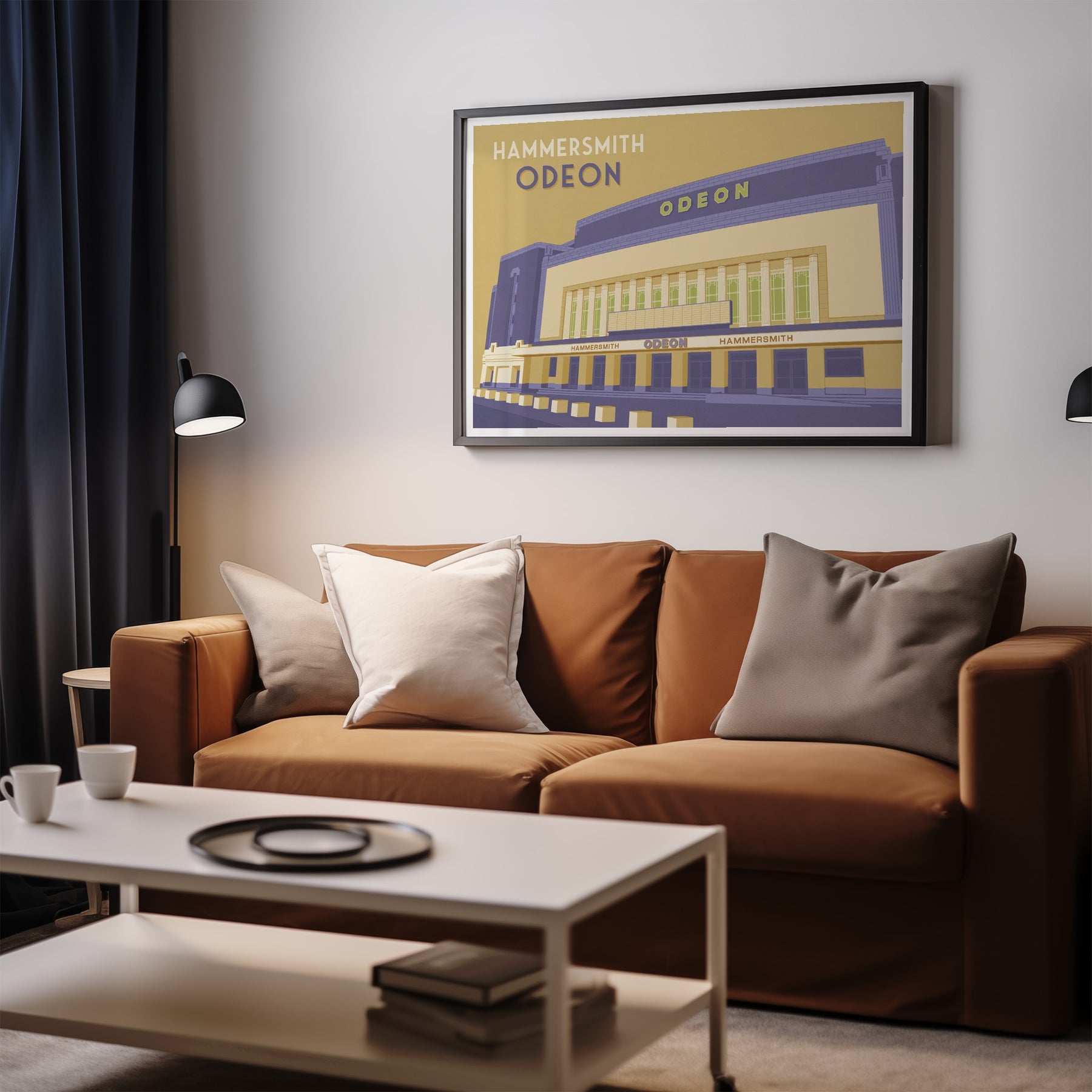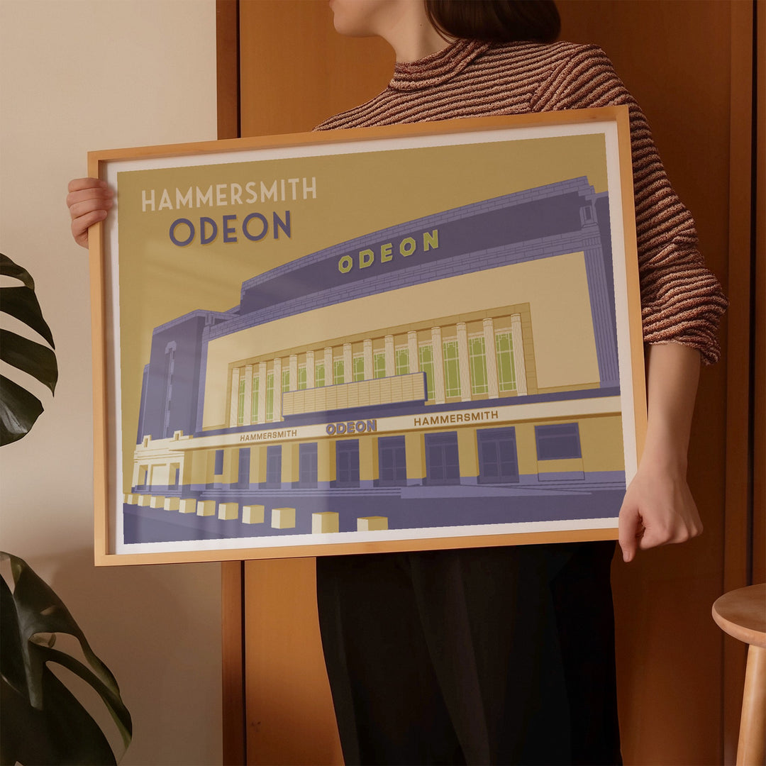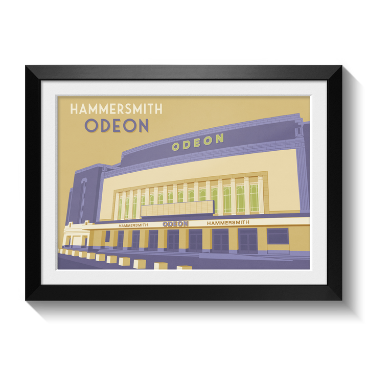 An original travel poster featuring the iconic art deco music venue, the Hammersmith Odeon (now known as the Hammersmith Apollo) in West London, home to the famous Live at the Apollo comedy nights.