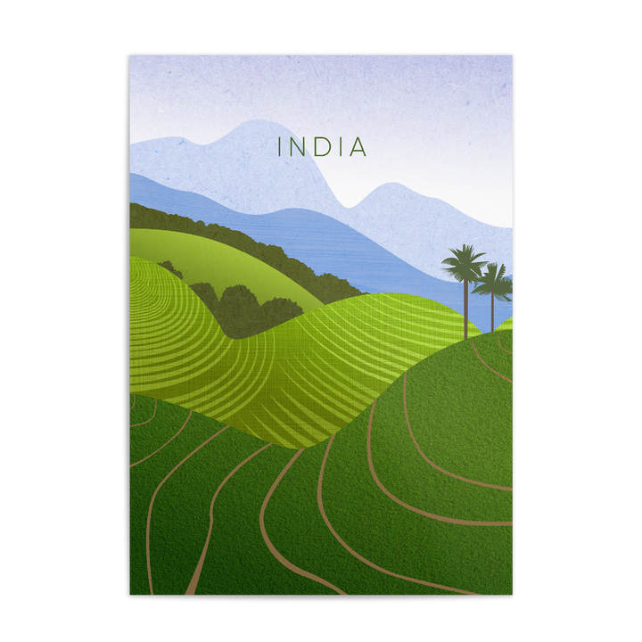 Original travel poster for India, a country in south Asia. India shares its borders with 7 countries; Afghanistan, Pakistan, China, Bhutan, Nepal, Myanmar and Bangladesh. India is extremely diverse with desert, jungle and mountains as well as some of the biggest and busiest cities in the world. One of India's most famous exports is its incredible spicy food.