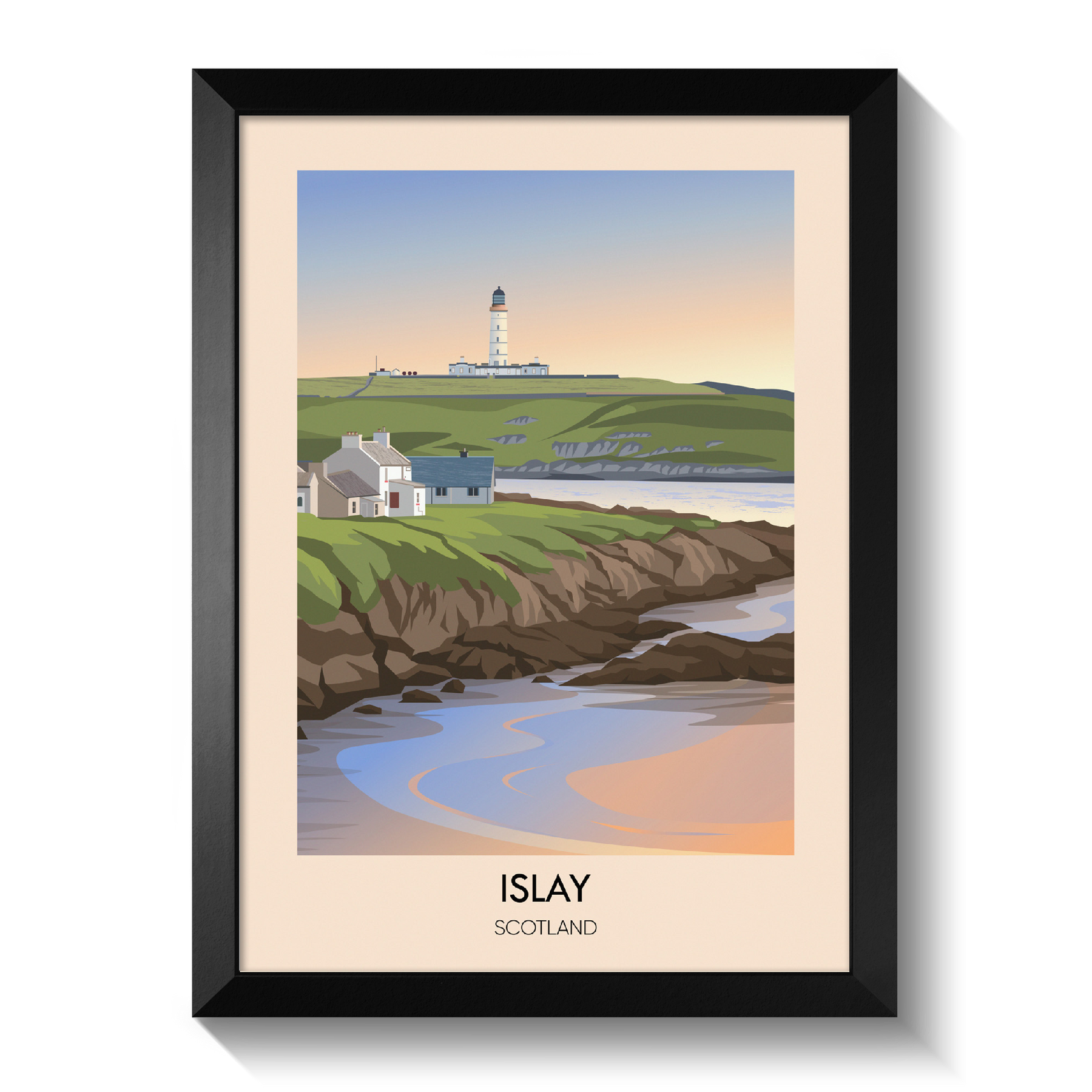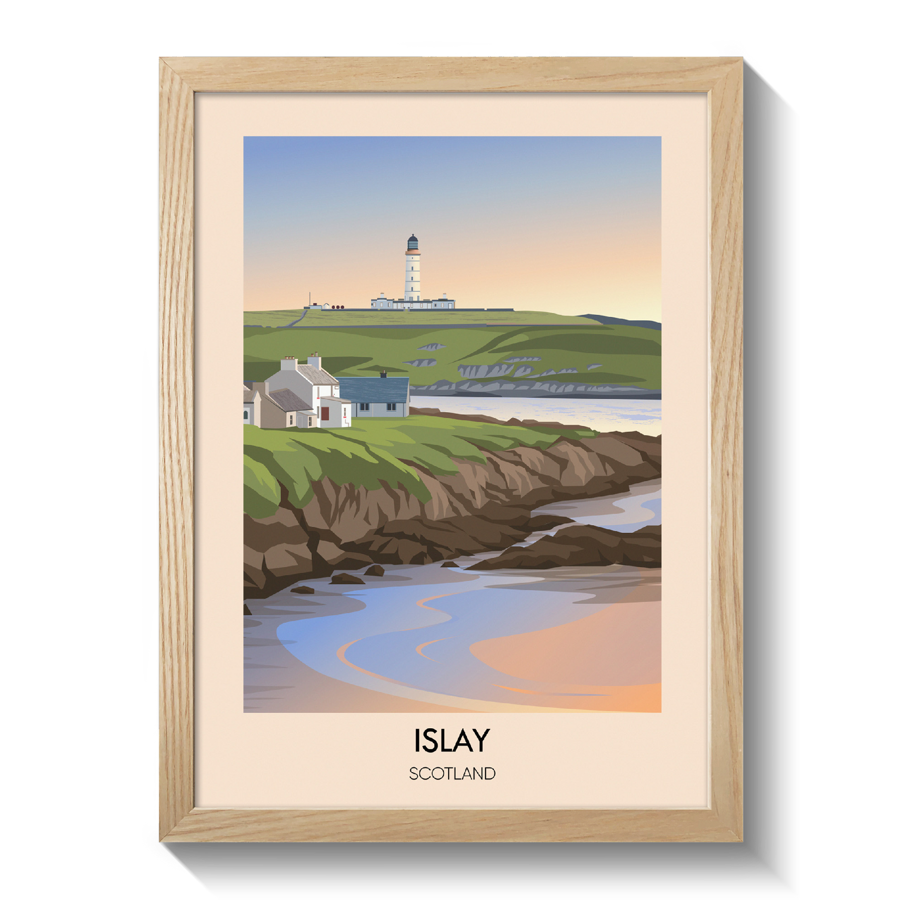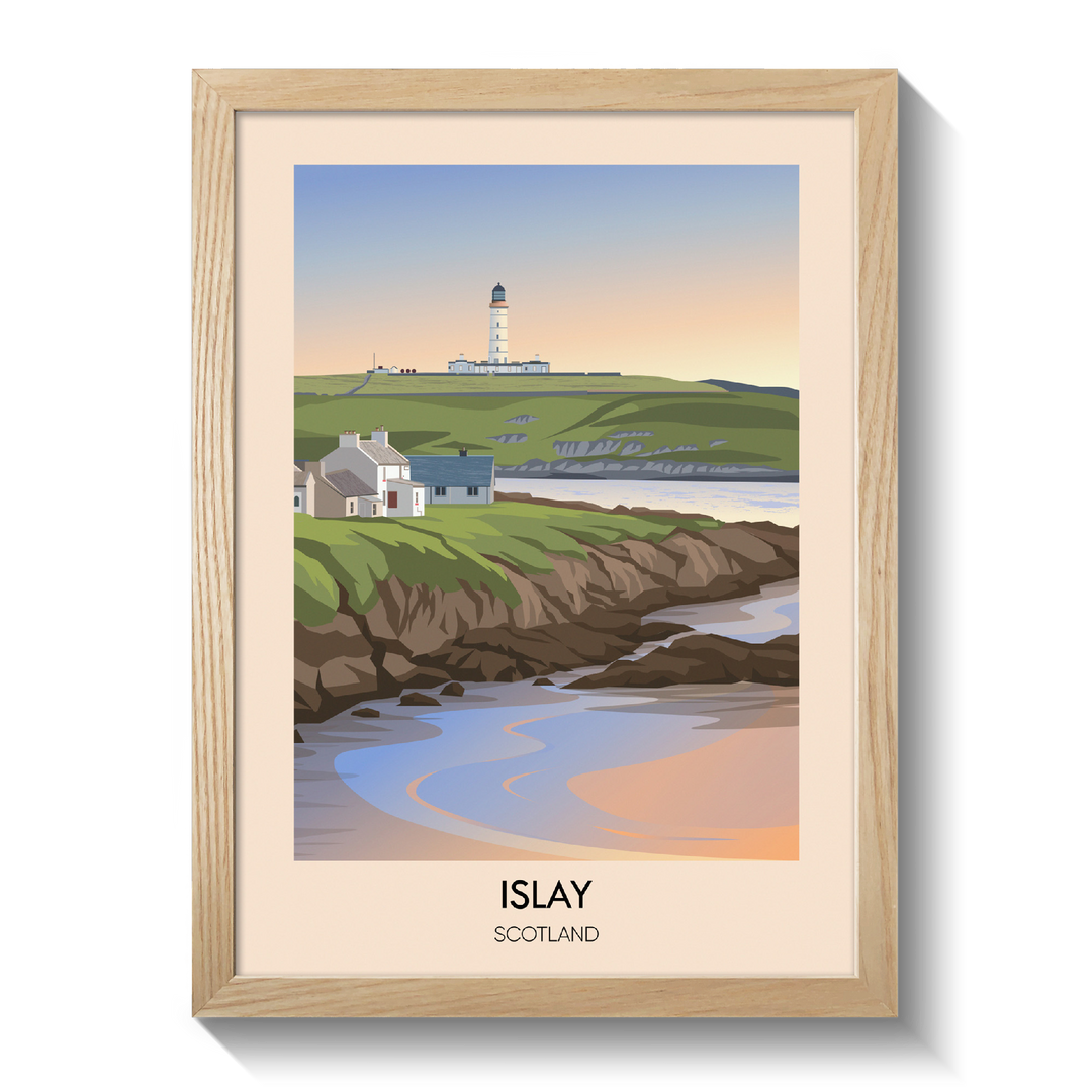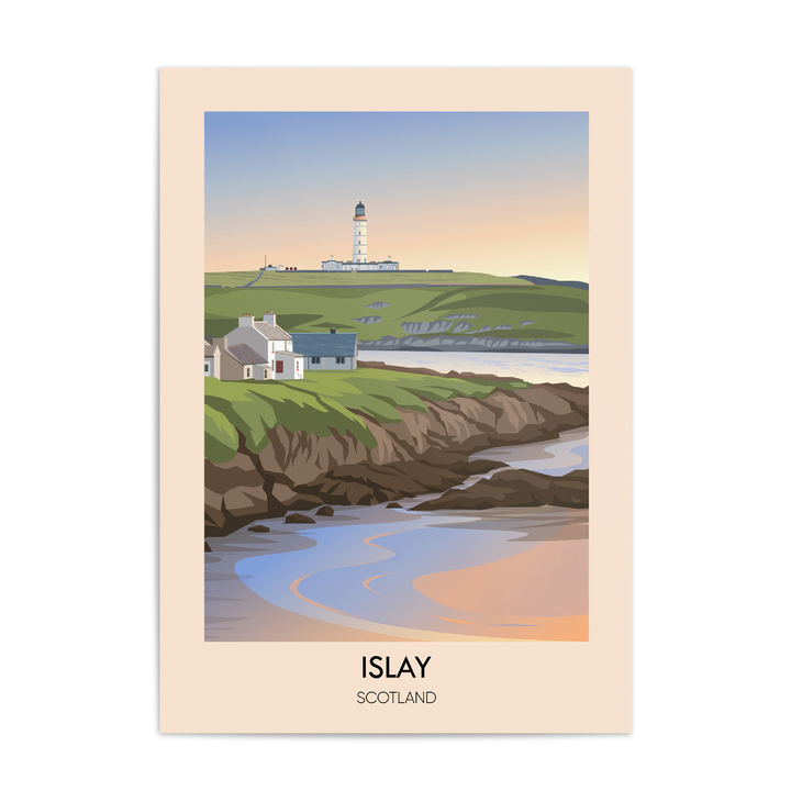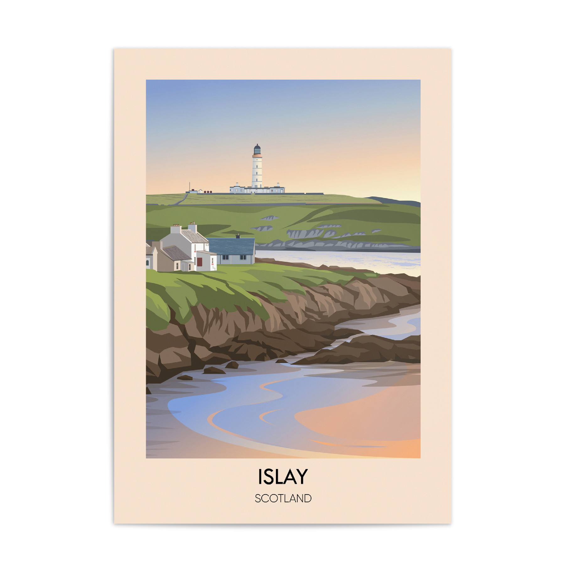 An original travel poster featuring Scotland's Islay. Islay is an island located on the west coast of Scotland and is the Southernmost in the Inner Hebrides. It is the fifth largest Scottish island and is best known for its distilleries, producing peaty, smoky whisky. In the poster you can see the picturesque Rhinns Of Islay Lighthouse.
